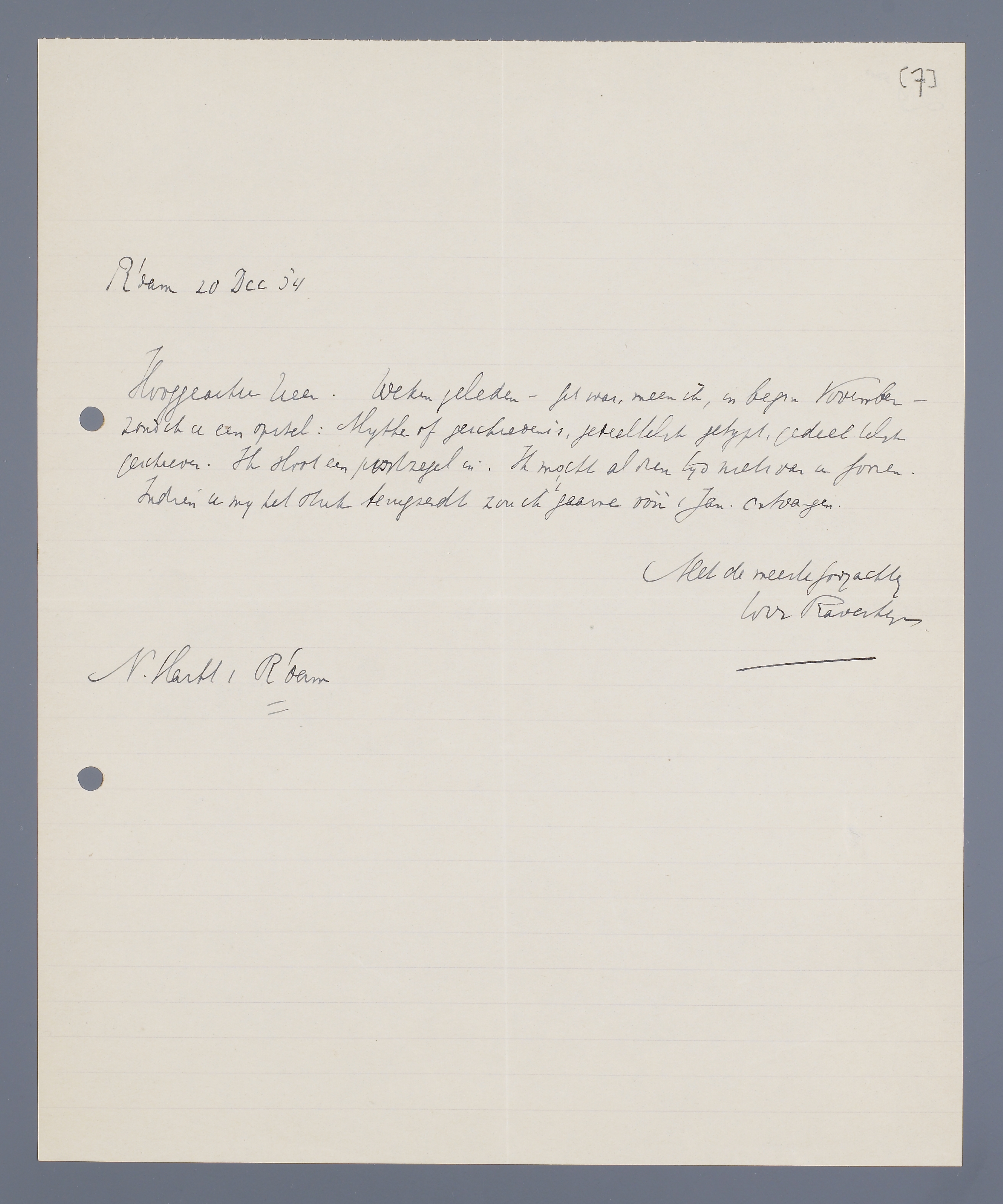 Weken geleden - het was, meen ik, in begin November - zond ik u een opstel: Mythe of geschiedenis, gedeeltelijk getypt, gedeeltelijk geschreven. Ik sloot een postzegel in. Ik mocht al den tijd niets van u hooren.
