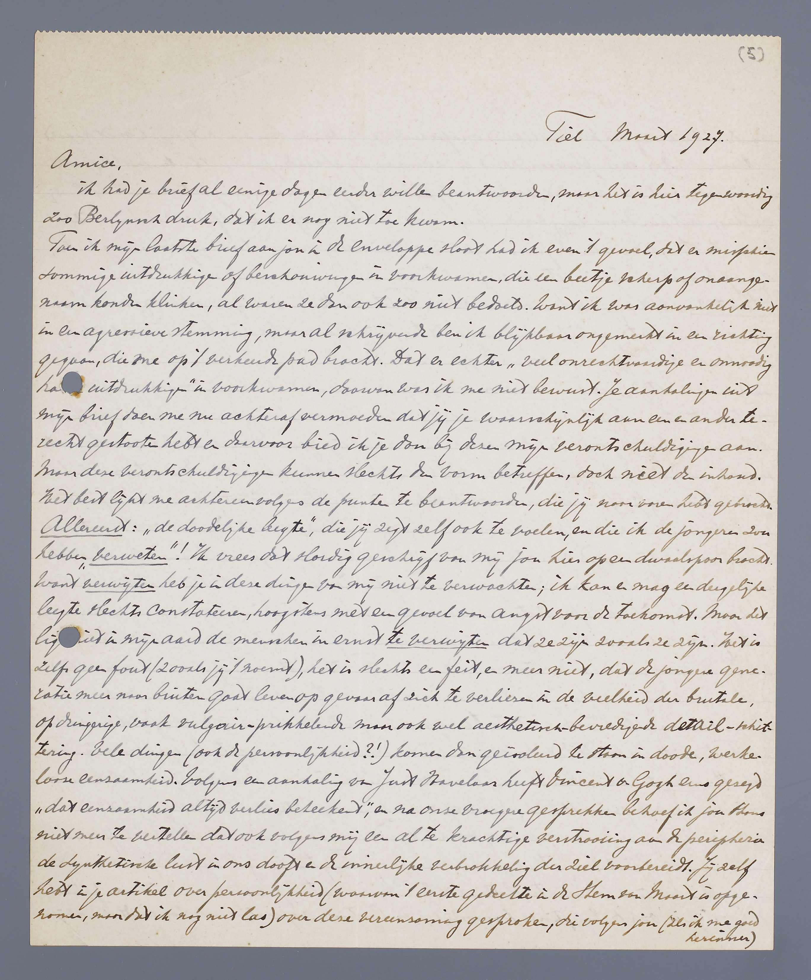 Allereerst: ‘de doodelijke leegte’, die jij zegt zelf ook te voelen, en die ik de jongeren zou hebben ‘verweten’! Ik vrees dat slordig geschrijf van mij jou hier op een dwaalspoor bracht. Want verwijten heb je in deze dingen van mij niet te verwachten; ik kan en mag een dergelijke leegte slechts constateeren, hoogstens met een gevoel van angst voor de toekomst. Maar het ligt niet in mijn aard de menschen in ernst te verwijten dat ze zijn zooals ze zijn. Het is zelfs geen fout (zooals jij 't noemt), het is slechts een feit, en meer niet, dat de jongere generatie meer naar buiten gaat leven op gevaar af zich te verliezen in de veelheid der brutale, opdringerige, vaak vulgair-prikkelende maar ook wel aesthetisch-bevredigende detail-schittering. Vele dingen (ook de persoonlijkheid?!) komen dan geïsoleerd te staan in doode, werkelooze eenzaamheid. Volgens een aanhaling van Just Havelaar heeft Vincent van Gogh eens gezegd ‘dat eenzaamheid altijd verlies beteekent’, en na onze vroegere gesprekken behoef ik jou thans niet meer te vertellen dat ook volgens mij een al te krachtige verstrooiing aan de periphera de synthetische lust in ons dooft en de innerlijke verbrokkeling der ziel voorbereidt. Jij zelf hebt in je artikel over persoonlijkheid (waarvan 't eerste gedeelte in de Stem van Maart is opgenomen, maar dat ik nog niet las) over deze vereenzaming gesproken, die volgens jou (als ik me goed herinner) aan de ontwikkeling der persoonlijkheid onafscheidelijk verbonden zou zijn, hetgeen ik met kracht ontkende omdat m.i. persoonlijkheid en vereenzaming elkander juist uitsluiten. In elk geval zijn wij het er wel over eens, dat verbrokkeling en isoleering vereenzaming beteekenen, daar hierbij de dingen uit hun samenhang worden losgemaakt zoodat ze op zich zelf d.w.z. in hun eentje komen te staan; dat echter de persoonlijkheidsontwikkeling geen isoleeringsproces mag heeten, daarop kom ik misschien straks nog wel terug.