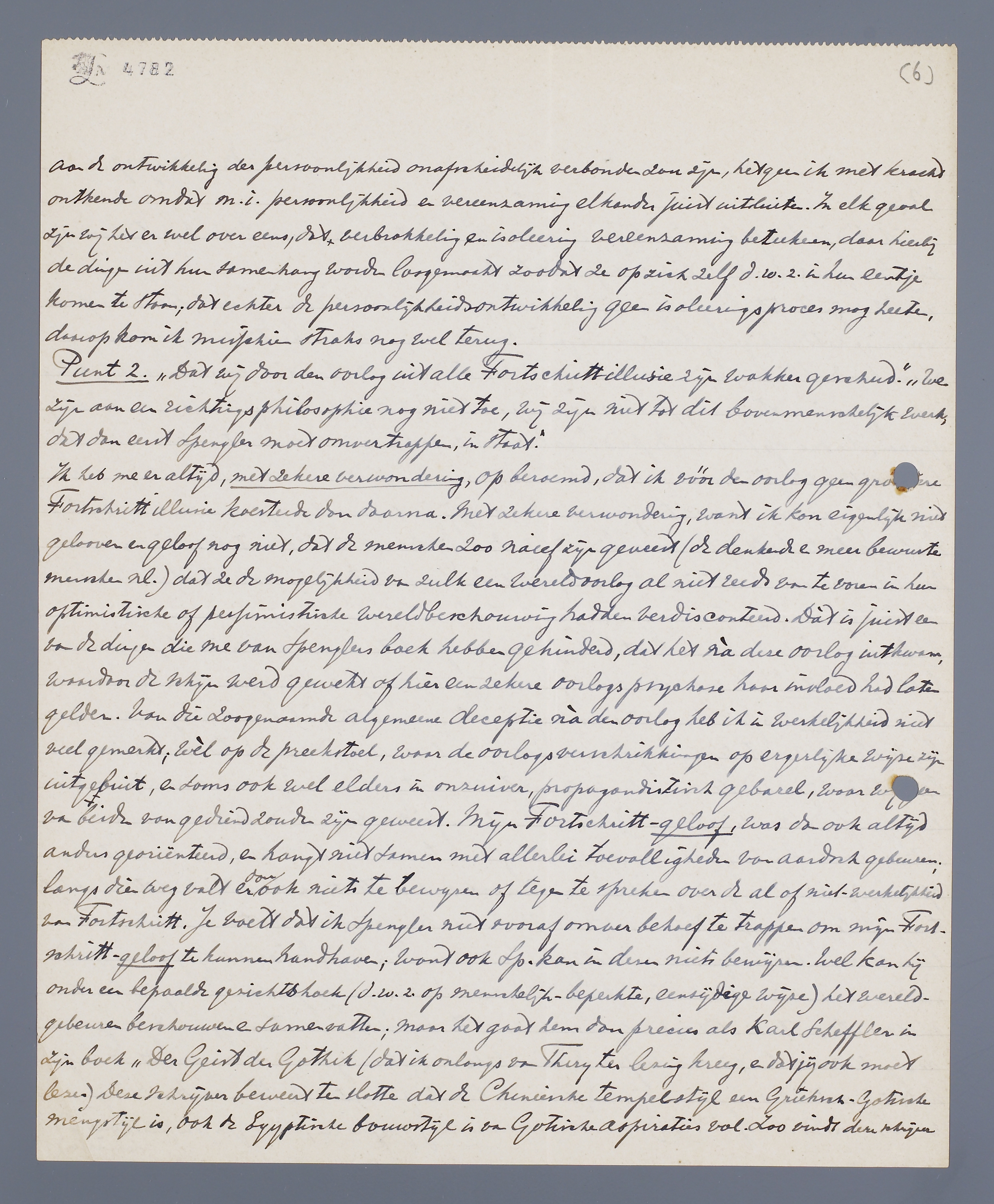 Punt 2. ‘Dat wij door den oorlog uit alle Fortschrittillusie zijn wakker geschud.’ ‘We zijn aan een richtingsphilosophie nog niet toe, wij zijn niet tot dit bovenmenschelijk [werk], dat dan eerst Spengler moet omvertrappen, in staat.’