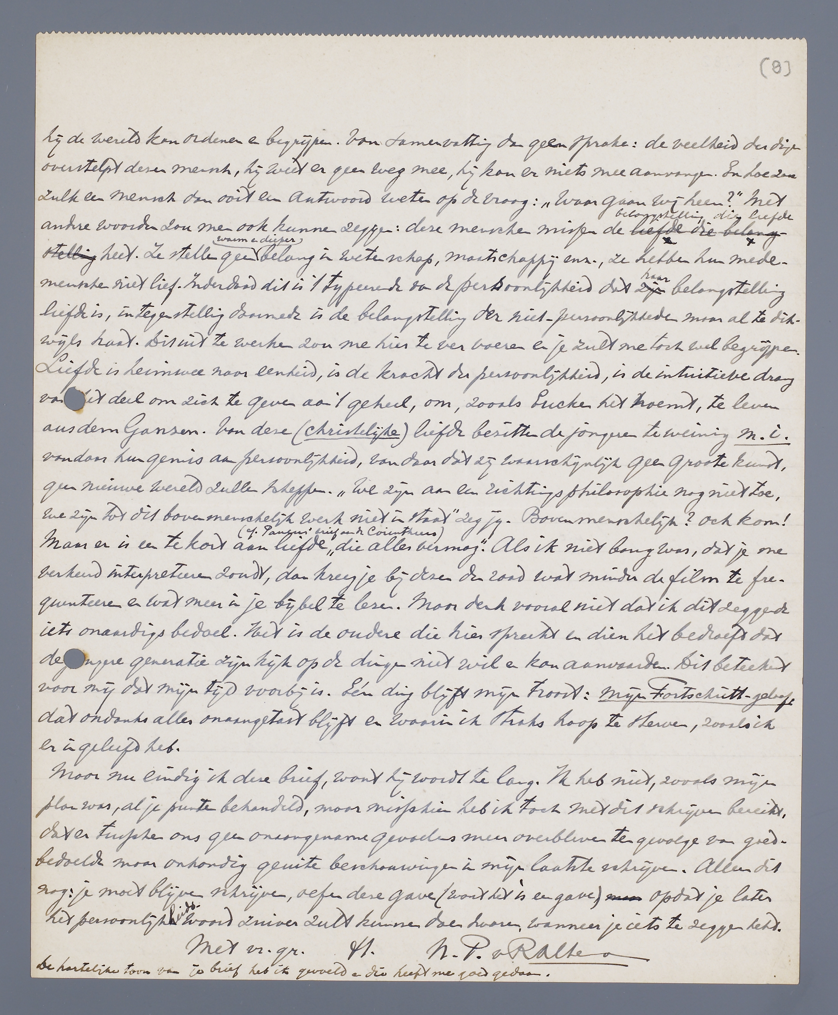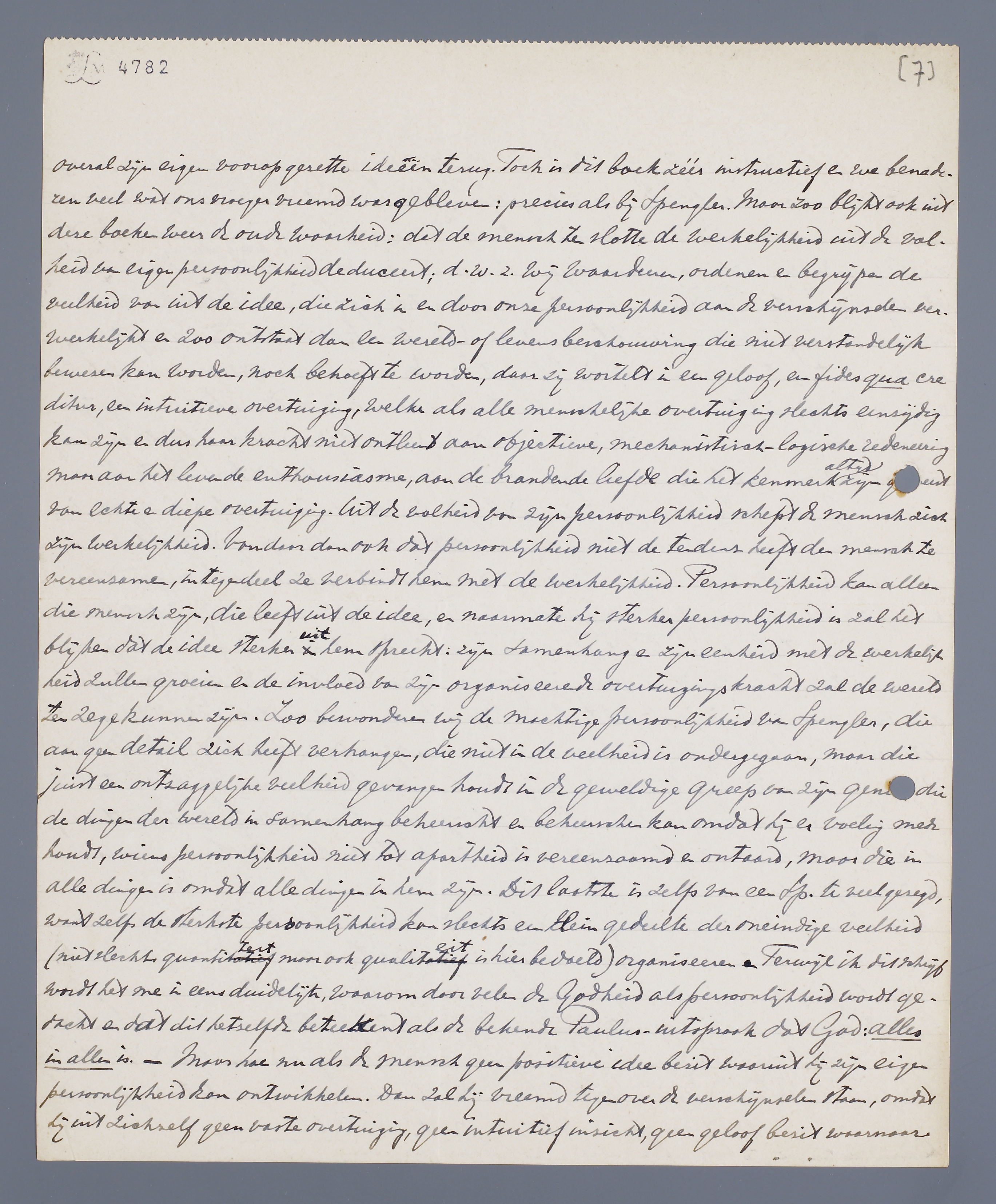 Ik heb me er altijd, met zekere verwondering, op beroemd, dat ik vóór den oorlog geen grootere Fortschritt illusie koesterde dan daarna. Met zekere verwondering, want ik kon eigenlijk niet gelooven en geloof nog niet, dat de menschen zoo naief zijn geweest (de denkende en meer bewuste menschen nl.) dat ze de mogelijkheid van zulk een wereldoorlog al niet reeds van te voren in hun optimistische of pessimistische wereldbeschouwing hadden verdisconteerd. Dàt is juist een van de dingen die me van Spenglers boek hebben gehinderd, dat het nà deze oorlog uitkwam, waardoor de schijn werd gewekt of hier een zekere oorlogspsychose haar invloed had laten gelden. Van die zoogenaamde algemeene deceptie nà den oorlog heb ik in werkelijkheid niet veel gemerkt; wèl op de preekstoel, waar de oorlogsverschrikkingen op ergerlijke wijze zijn uitgebuit, en soms ook wel elders in onzuiver, propagandistisch gebazel, waar wij geen van beiden van gediend zouden zijn geweest. Mijn Fortschritt-geloof, was dan ook altijd anders georiënteerd, en hangt niet samen met allerlei toevalligheden van aardsch gebeuren. Langs dien weg valt er dan ook niets te bewijzen of tegen te spreken over de al of niet-werkelijkheid van Fortschritt. Je voelt dat ik Spengler niet vooraf omver behoef te trappen om mijn Fortschritt-geloof te kunnen handhaven; want ook Sp. kan in dezen niets bewijzen. Wel kan hij onder een bepaalde gezichtshoek (d.w.z. op menschelijk-beperkte, eenzijdige wijze) het wereldgebeuren beschouwen en samenvatten; maar het gaat hem dan precies als Karl Scheffler in zijn boek ‘Der Geist der Gothik’ (dat ik onlangs van [onleesbaar] ter lezing kreeg, en dat jij ook moet lezen). Deze schrijver beweert ten slotte dat de Chineesche tempelstijl een Grieksch-Gothische mengstijl is, ook de Egyptische bouwstijl is van Gothische aspiraties vol. Zoo vindt deze schrijver overal zijn eigen vooropgezette ideeën terug. Toch is dit boek zéér instructief en we benaderen veel wat ons vroeger vreemd was gebleven: precies als bij Spengler. Maar zoo blijkt ook uit deze boeken weer de oude waarheid: dat de mensch ten slotte de werkelijkheid uit de volheid van eigen persoonlijkheid deduceert; d.w.z. wij waardeeren, ordenen en begrijpen de veelheid van uit de idee, die zich in en door onze persoonlijkheid aan de verschijnselen verwerkelijkt en zoo ontstaat dan een wereld- of levensbeschouwing die niet verstandelijk bewezen kan worden, noch behoeft te worden, daar zij wortelt in een geloof, en fides qua creditur, een intuitieve overtuiging, welke als alle menschelijke overtuiging slechts eenzijdig kan zijn en dus haar kracht niet ontleent aan objectieve, mechanistisch-logische redeneering maar aan het levende enthousiasme, aan de brandende liefde die het kenmerk altijd zijn geweest van echte en diepe overtuiging. Uit de volheid van zijn persoonlijkheid schept de mensch zich zijn werkelijkheid. Vandaar dan ook dat persoonlijkheid niet de tendens heeft den mensch te vereenzamen, in tegendeel ze verbindt hem met de werkelijkheid. Persoonlijkheid kan alleen die mensch zijn, die leeft uit de idee, en naarmate hij sterker persoonlijkheid is zal het blijken dat de idee sterker uit hem spreekt: zijn samenhang en zijn eenheid met de werkelijkheid zullen groeien en de invloed van zijn organiseerende overtuigingskracht zal de wereld ten zege kunnen zijn. Zoo bewonderen wij de machtige persoonlijkheid van Spengler, die aan geen detail zich heeft verhangen, die niet in de veelheid is ondergegaan, maar die juist een ontzaggelijke veelheid gevangen houdt in de geweldige greep van zijn genie die de dingen der wereld in samenhang beheerscht en beheerschen kan omdat hij er voeling mede houdt, wiens persoonlijkheid niet tot apartheid is vereenzaamd en ontaard, maar die in alle dingen is omdat alle dingen in hem zijn. Dit laatste is zelfs van een Sp. te veel gezegd, want zelfs de sterkste persoonlijkheid kan slechts een klein gedeelte der oneindige veelheid (niet slecht quantiteit maar ook qualiteit is hier bedoeld) organiseeren. Terwijl ik dit schrijf wordt het me in eens duidelijk, waarom door velen de Godheid als persoonlijkheid wordt gedacht en dat dit hetzelfde beteekent als de bekende Paulus-uitspraak dat God: alles in allen is. - Maar hoe nu als de mensch geen positieve idee bezit waaruit hij zijn eigen persoonlijkheid kan ontwikkelen. Dan zal hij vreemd tegenover de verschijnselen staan, omdat hij uit zichzelf geen vaste overtuiging, geen intuitief inzicht, geen geloof bezit waarnaar hij de wereld kan ordenen en begrijpen. Van samenvatting dan geen sprake: de veelheid der dingen overstelpt dezen mensch, hij weet er geen weg mee, hij kan er niets mee aanvangen. En hoe zou zulk een mensch dan ooit een antwoord weten op de vraag: ‘Waar gaan wij heen?’ Met andere woorden zou men ook kunnen zeggen: deze menschen missen de belangstelling die liefde heet. Ze stellen geen warm en dieper belang in wetenschap, maatschappij enz., ze hebben hun medemenschen niet lief. Inderdaad dit is 't typeerende van de persoonlijkheid dat haar belangstelling liefde is, in tegenstelling daarmede is de belangstelling der niet-persoonlijkheden maar al te dikwijls haat. Dit uit te werken zou me hier te ver voeren en je zult me toch wel begrijpen. Liefde is heimwee naar eenheid, is de kracht der persoonlijkheid, is de intuitieve drang van het deel om zich te geven aan 't geheel, om, zooals Eucken het noemt, te leven aus dem Ganzen. Van deze (christelijke) liefde bezitten de jongeren te weinig m.i. vandaar hun gemis aan persoonlijkheid, vandaar dat zij waarschijnlijk geen groote kunst, geen nieuwe wereld zullen scheppen. ‘We zijn aan een richtingsphilosophie nog niet toe, we zijn tot dit bovenmenschelijk werk niet in staat’ zeg jij. Bovenmenschelijk? Och kom! Maar er is een te kort aan liefde ‘die alles vermag’(cf. Paulus' brief aan de Corintiërs). Als ik niet bang was, dat je me verkeerd interpreteeren zoudt, dan kreeg je bij dezen den raad wat minder de fi