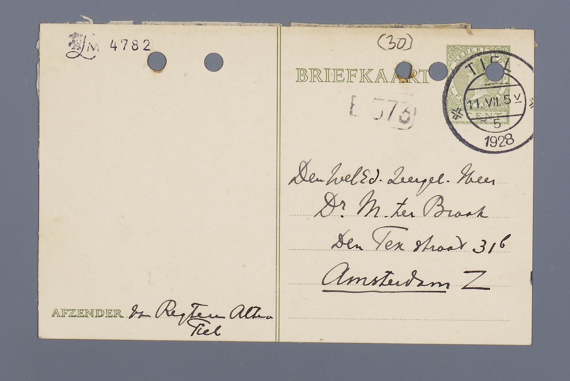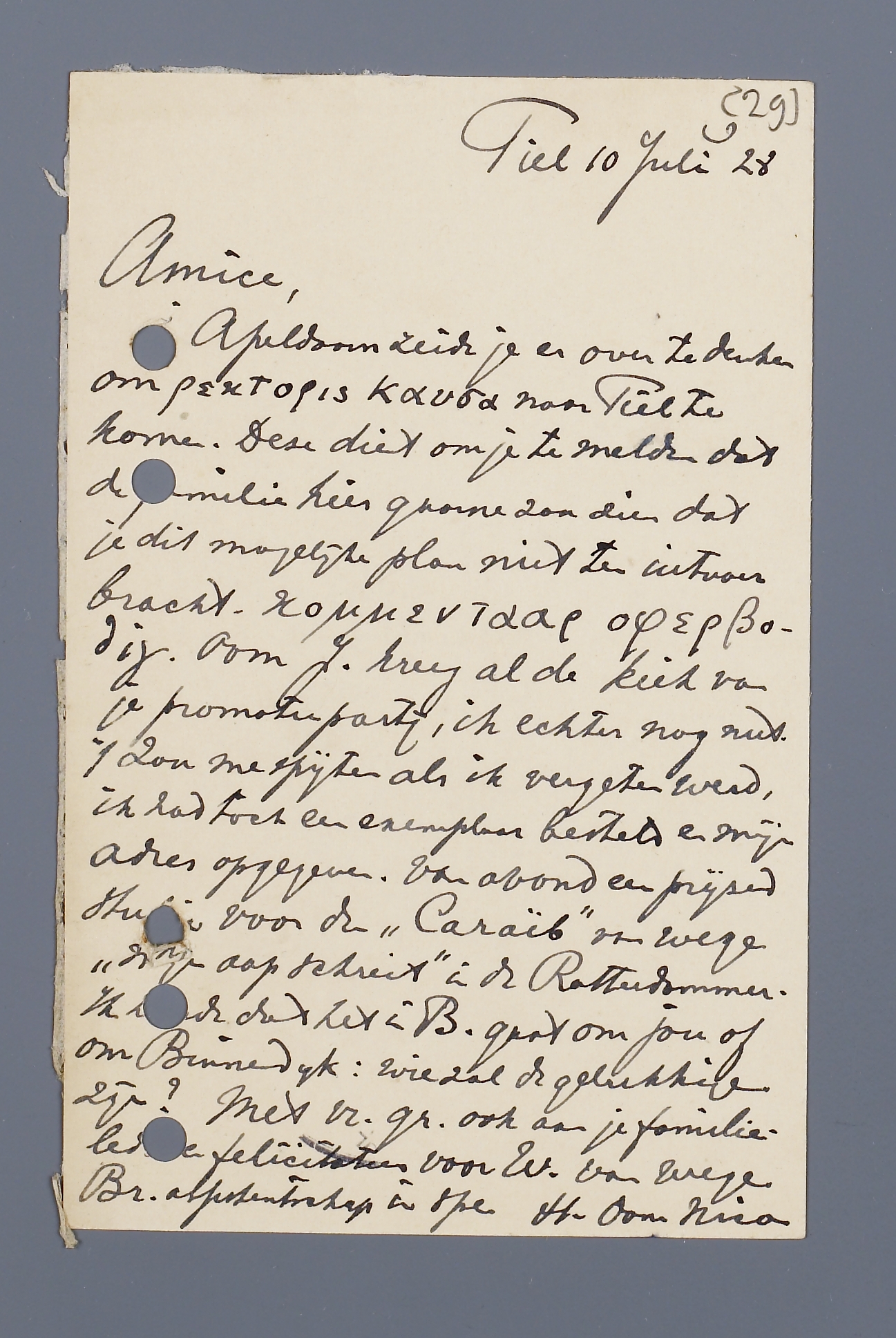In Apeldoorn zeide je er over te denken om rektoris kausa [in Grieks schrift] naar Tiel te komen. Deze dient om je te melden dat de familie hier gaarne zou zien dat je dit mogelijke plan niet ten uitvoer bracht. Kommentaar overbodig [in Grieks schrift]. Oom J. kreeg al de kiek van je promotiepartij; ik echter nog niet. 't Zou me spijten als ik vergeten werd, ik had toch een exemplaar besteld en mijn adres opgegeven. Vanavond een prijzend stukje voor den ‘Caraïb’ van wege ‘Mijn aap schreit’ in de Rotterdammer. Ik hoorde dat het in B. gaat om jou of om Binnendijk: wie zal de gelukkige zijn?