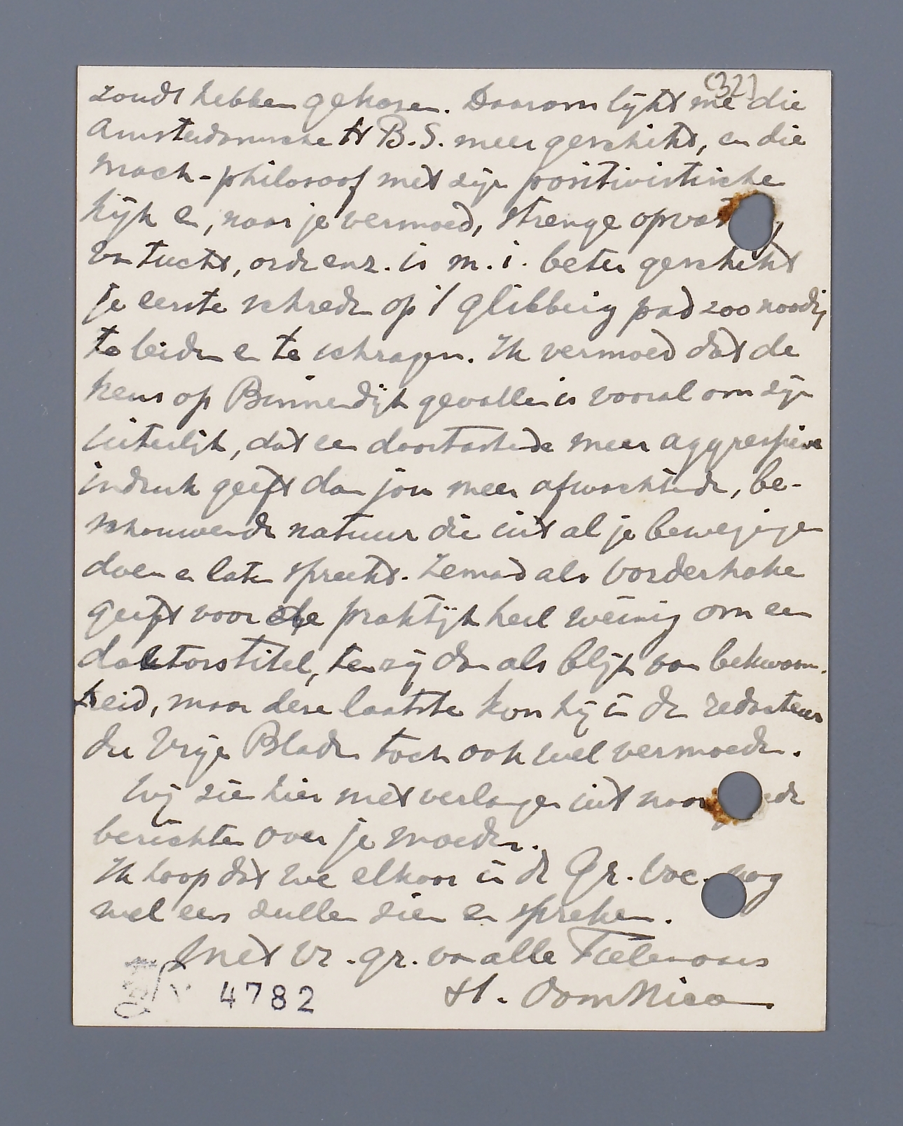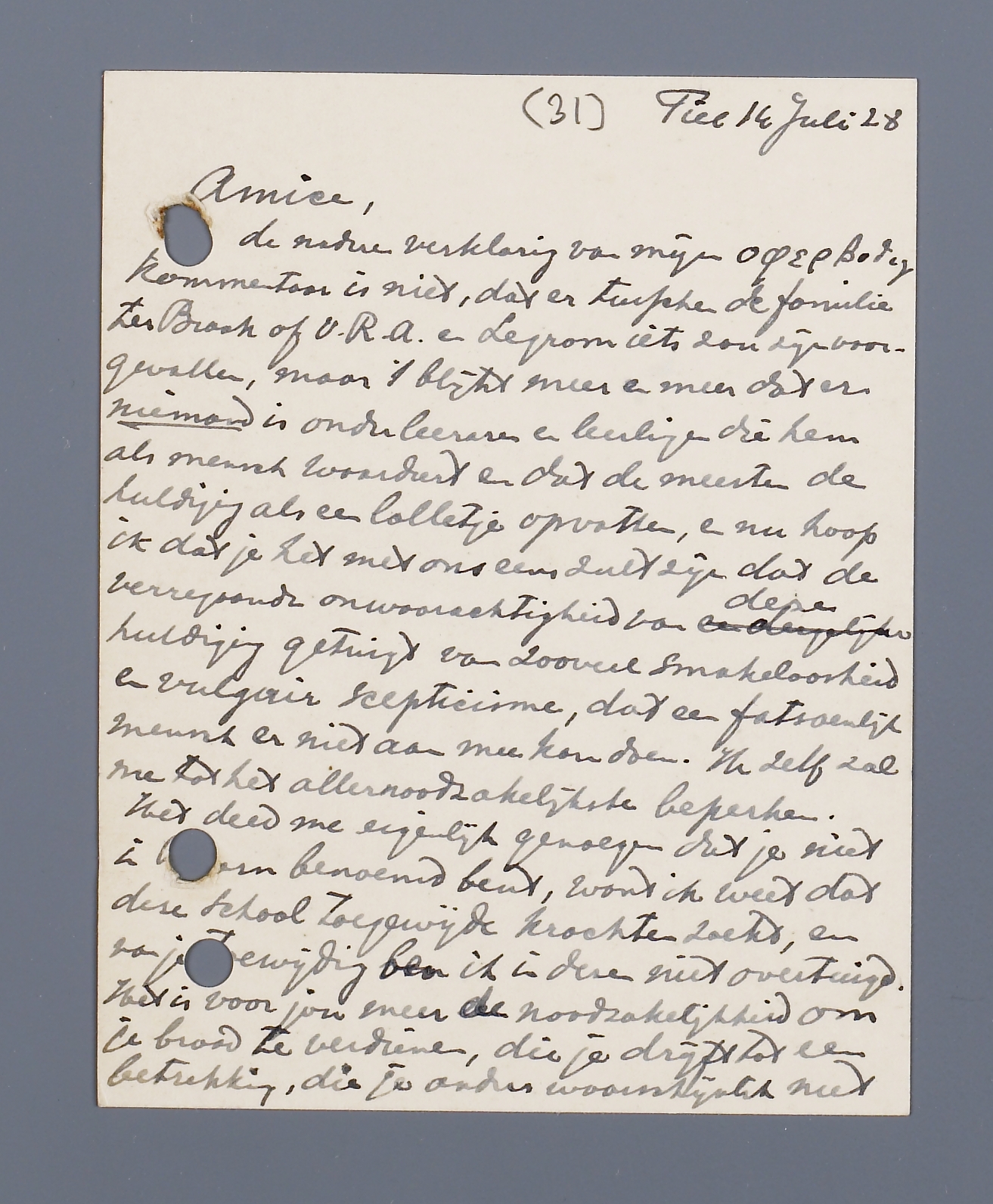 De nadere verklaring van mijn overbodig [in Grieks schrift] kommentaar is niet, dat er tusschen de familie ter Braak of v. R.A. en Legrom iets zou zijn voorgevallen, maar 't blijkt meer en meer dat er niemand is onder leeraren en leerlingen die hem als mensch waardeert en dat de meesten de huldiging als een lolletje opvatten, en nu hoop ik dat je het met ons eens zult zijn dat de verregaande onwaarachtigheid van deze huldiging getuigt van zooveel smakeloosheid en vulgair scepticisme, dat een fatsoenlijk mensch er niet aan mee kan doen. Ik zelf zal me tot het allernoodzakelijkste beperken.