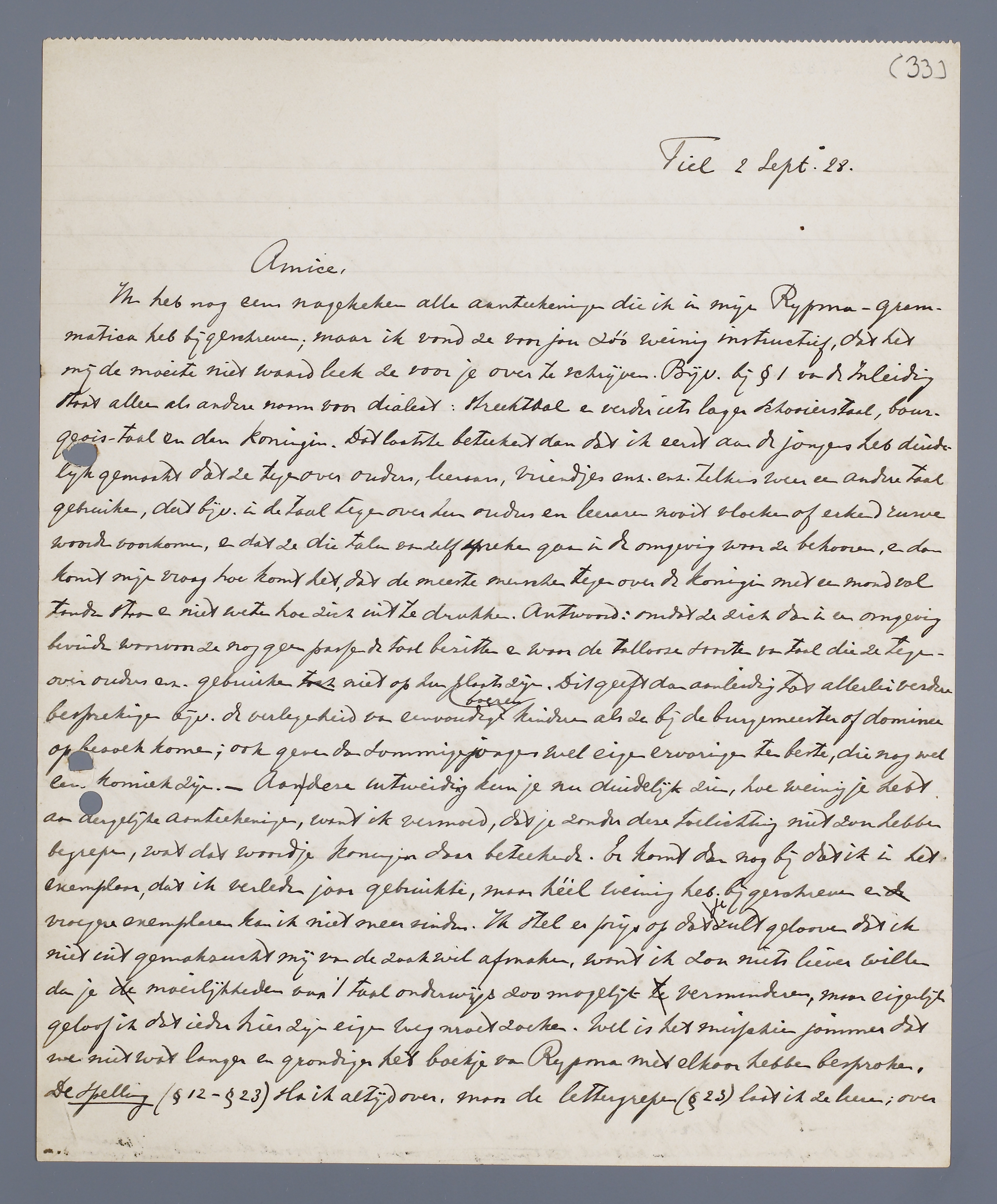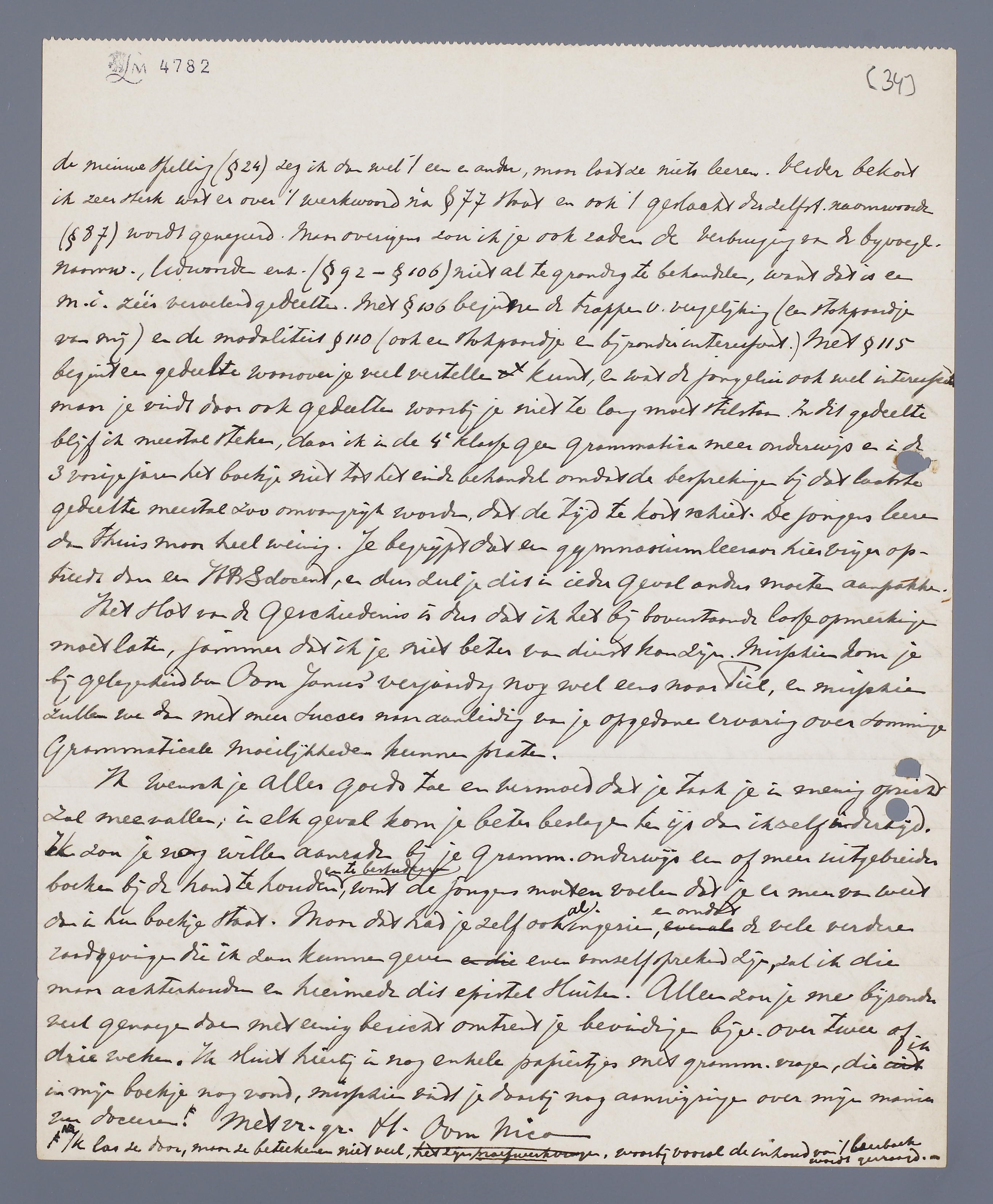 Ik wensch je alles goeds toe en vermoed dat je taak je in menig opzicht zal meevallen; in elk geval kom je beter beslagen ten ijs dan ik zelf indertijd. Ik zou je nog willen aanraden bij je gramm. onderwijs een of meer uitgebreider boeken bij de hand te houden en te bestudeeren, want de jongens moeten voelen dat je er meer van weet dan in hun boekje staat. Maar dat had je zelf ook al ingezien, en omdat de vele verdere raadgevingen die ik zou kunnen geven even vanzelfsprekend zijn, zal ik die maar achterhouden en hiermede dit epistel sluiten. Alleen zou je me bijzonder veel genoegen doen met eenig bericht omtrent je bevindingen bijv. over twee of drie weken. Ik sluit hierbij in nog enkele papiertjes met gramm. vragen, die ik in mijn boekje nog vond, misschien vind je daarbij nog aanwijzingen over mijn manier van doceeren (ik las ze door, maar ze beteekenen niet veel, het zijn proefwerkvragen, waarbij vooral de inhoud van 't leerboek wordt gevraagd).
