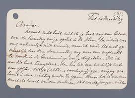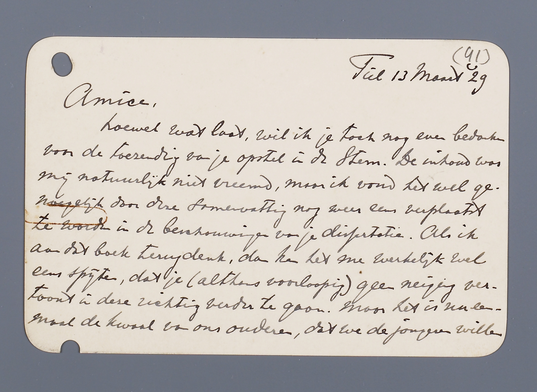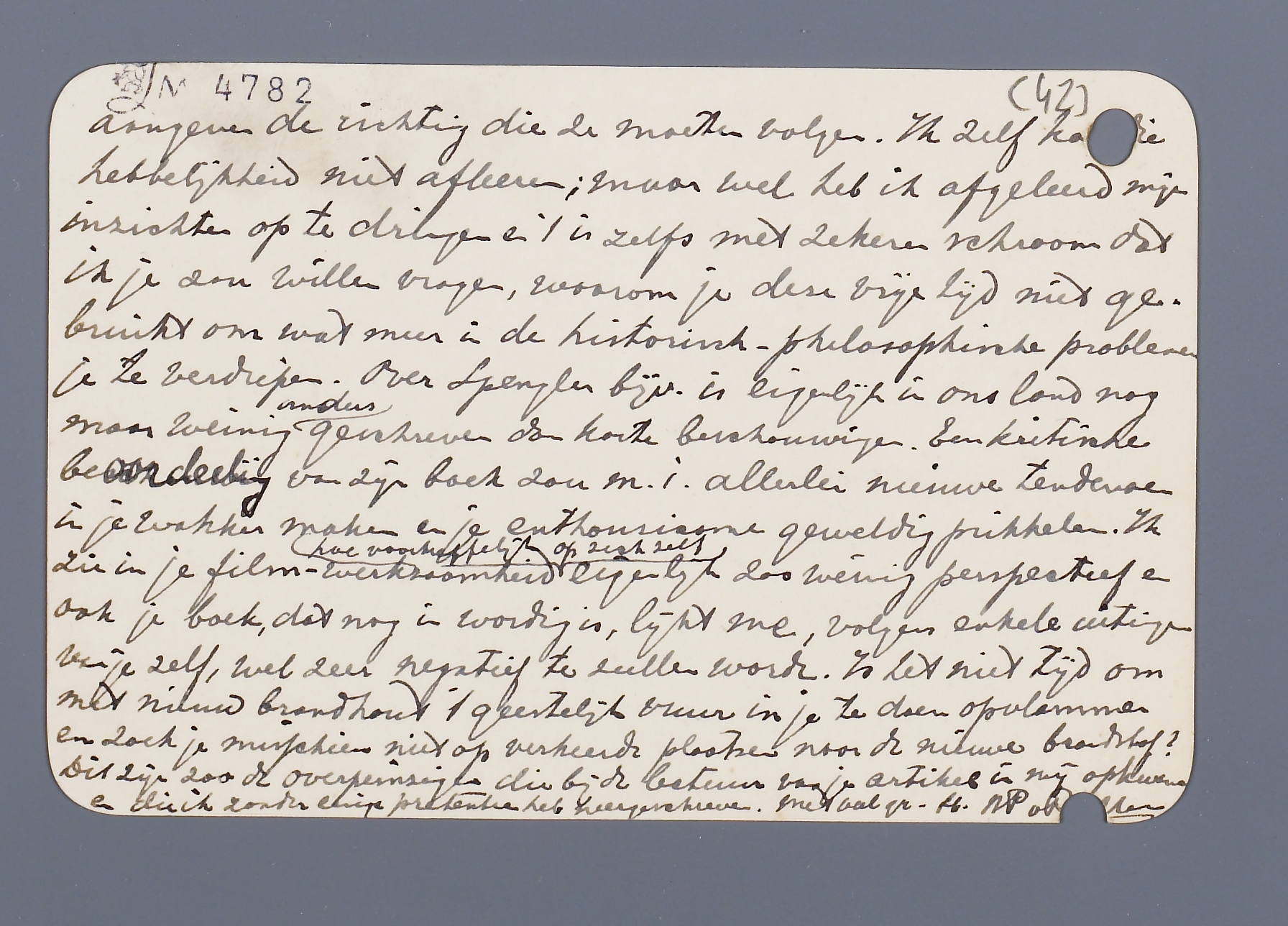 Hoewel wat laat, wil ik je toch nog even bedanken voor de toezending van je opstel in de Stem. De inhoud was mij natuurlijk niet vreemd, maar ik vond het wel genoegelijk door deze samenvatting nog weer eens verplaatst te worden in de beschouwingen van je dissertatie. Als ik aan dat boek terugdenk, dan kan het me werkelijk wel eens spijten, dat je (althans voorloopig) geen neiging vertoont in deze richting verder te gaan. Maar het is nu eenmaal de kwaal van ons ouderen, dat we de jongeren willen aangeven de richting die ze moeten volgen. Ik zelf kan die hebbelijkheid niet afleeren; maar wel heb ik afgeleerd mijn inzichten op te dringen en 't is zelfs met zekeren schroom dat ik je zou willen vragen, waarom je deze vrije tijd niet gebruikt om wat meer in de historisch-philosophische problemen je te verdiepen. Over Spengler bijv. is eigenlijk in ons land nog maar weinig anders geschreven dan korte beschouwingen. Een kritische beoordeeling van zijn boek zou m.i. allerlei nieuwe tendenzen in je wakker maken en je enthousiasme geweldig prikkelen. Ik zie in je film-werkzaamheid, hoe voortreffelijk op zich zelf, eigenlijk zoo weinig perspectief en ook je boek, dat nog in wording is, lijkt me, volgens enkele uitingen van je zelf, wel zeer negatief te zullen worden. Is het niet tijd om met nieuw brandhout 't geestelijk vuur in je te doen opvlammen en zoek je misschien niet op verkeerde plaatsen naar de nieuwe brandstof? Dit zijn zoo de overpeinzingen die bij de lectuur van je artikel in mij opkwamen en die ik zonder eenige pretentie heb neergeschreven.