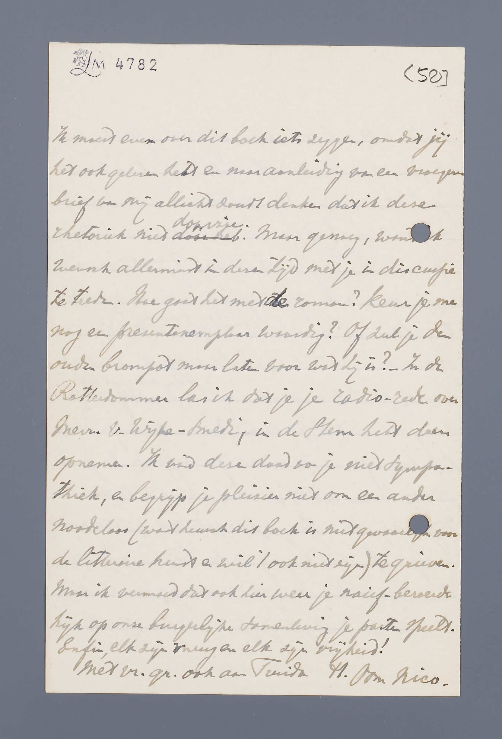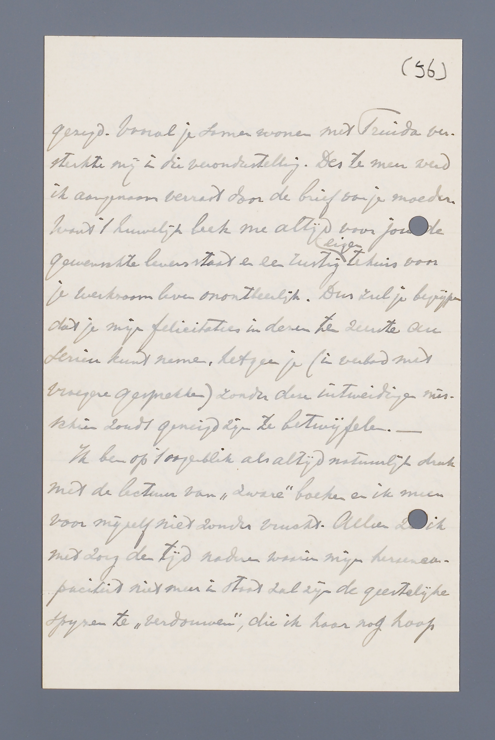 Van je moeder kregen wij het bericht dat je sinds eenige weken verloofd bent en in de Paaschvacantie hoopt te trouwen. Je toekomstige vrouw heb ik eenige malen zeer vluchtig ontmoet, maar ik weet dat jullie vriendschap reeds van ouden datum is en daar je voorgenomen plan een zéér goede pers heeft, durf ik met genoegen te vertrouwen, dat mijn gelukwenschen, die ik je hierbij mede namens tante Cato toezend, een redelijke kans hebben om vervuld te worden. Het verheugt me, dat je je blijkbaar na de tegenslag van 't vorige jaar, niet hebt laten ontmoedigen. Ik was toen bang dat je misschien alle huwelijksideeën had bonjour gezegd. Vooral je samen wonen met Truida versterkte mij in die veronderstelling. Des te meer werd ik aangenaam verrast door de brief van je moeder. Want 't huwelijk leek me altijd voor jou de gewenschte levensstaat en een rustig eigen tehuis voor je werkzaam leven onontbeerlijk. Dus zul je begrijpen dat je mijn felicitaties in dezen ten zeerste au serieu kunt nemen, hetgeen je (in verband met vroegere gesprekken) zonder deze uitweidingen misschien zoudt geneigd zijn te betwijfelen. -
