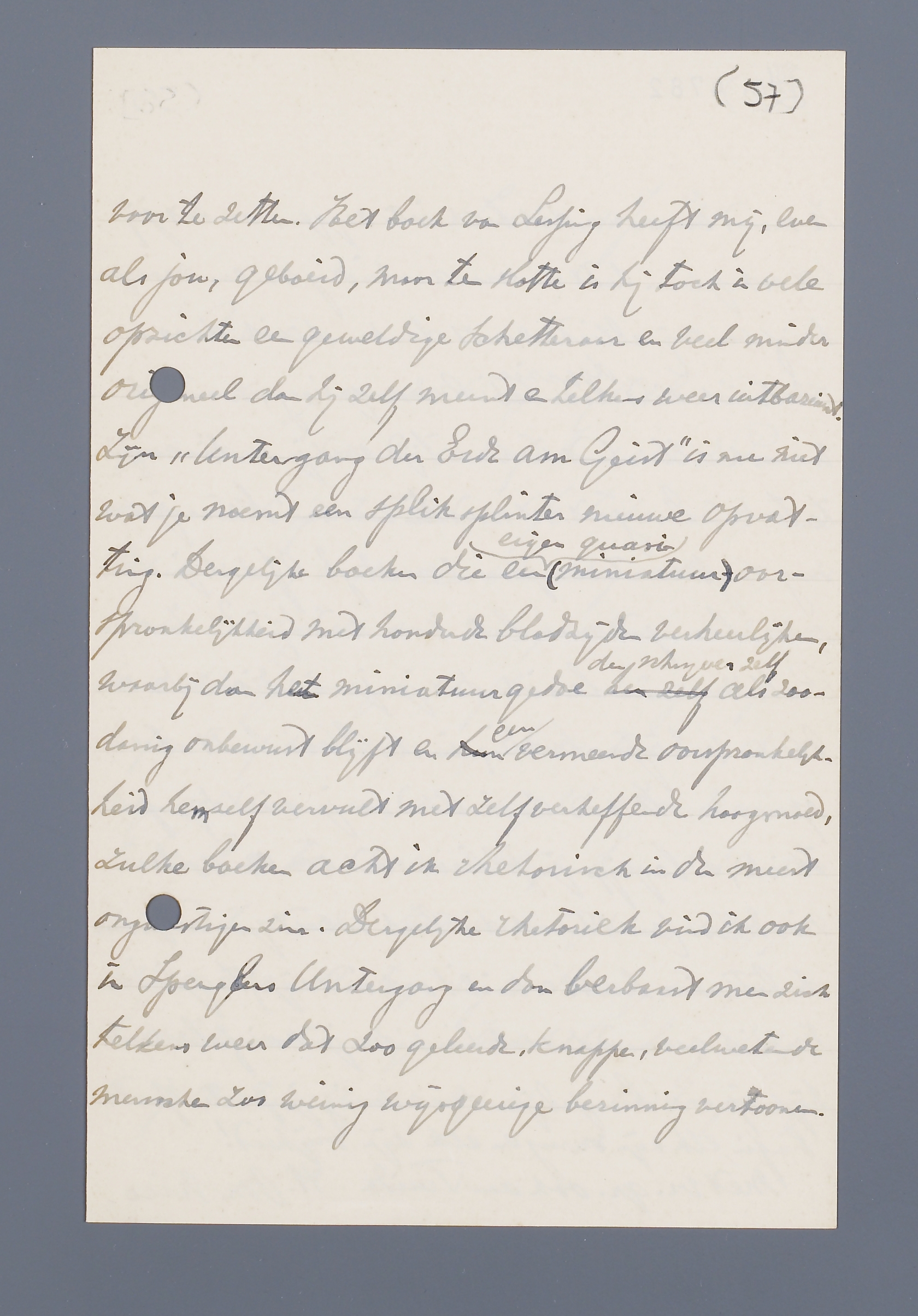 Ik ben op 't oogenblik als altijd natuurlijk druk met de lectuur van ‘zware’ boeken en ik meen voor mijzelf niet zonder vrucht. Alleen zie ik met zorg den tijd naderen waarin mijn hersencapaciteit niet meer in staat zal zijn de geestelijke spijzen te ‘verdouwen’, die ik haar nog hoop voor te zetten. Het boek van Lessing heeft mij, evenals jou, geboeid, maar ten slotte is hij toch in vele opzichten een geweldige schetteraar en veel minder origineel dan hij zelf meent en telkens weer uitbazuint. Zijn ‘Untergang der Erde am Geist’ is nu niet wat je noemt een spiksplinter nieuwe opvatting. Dergelijke boeken die een eigen quasi- (miniatuur-) oorspronkelijkheid met honderden bladzijden verheerlijken, waarbij dan het miniatuurgedoe den schrijver zelf als zoodanig onbewust blijft en een vermeende oorspronkelijkheid hemzelf vervult met zelfverheffende hoogmoed, zulke boeken acht ik rhetorisch in den meest ongunstigen zin. Dergelijke rhetoriek vind ik ook in Spenglers Untergang en dan verbaast men zich telkens weer dat zoo geleerde, knappe, veelwetende menschen zoo weinig wijsgeerige bezinning vertoonen. Ik moest even over dit boek iets zeggen, omdat jij het ook gelezen hebt en naar aanleiding van een vroegeren brief van mij allicht zoudt denken dat ik deze rhetoriek niet doorzie. Maar genoeg, want ik wensch allerminst in dezen tijd met je in discussie te treden. Hoe gaat het met de roman? Keur je me nog een presentexemplaar waardig? Of zul je den ouden brompot maar laten voor wat hij is? - In den Rotterdammer las ik dat je je radio-rede over Mevr. V. Wijhe-Smeding in de Stem hebt doen opnemen. Ik vind deze daad van je niet sympathiek, en begrijp je pleizier niet om een ander noodeloos (want heusch dit boek is niet gevaarlijk voor de litteraire kunst en wil 't ook niet zijn) te grieven. Maar ik vermoed dat ook hier weer je naief-beroerde kijk op onze burgerlijke samenleving je parten speelt. Enfin, elk zijn meug en elk zijn vrijheid!