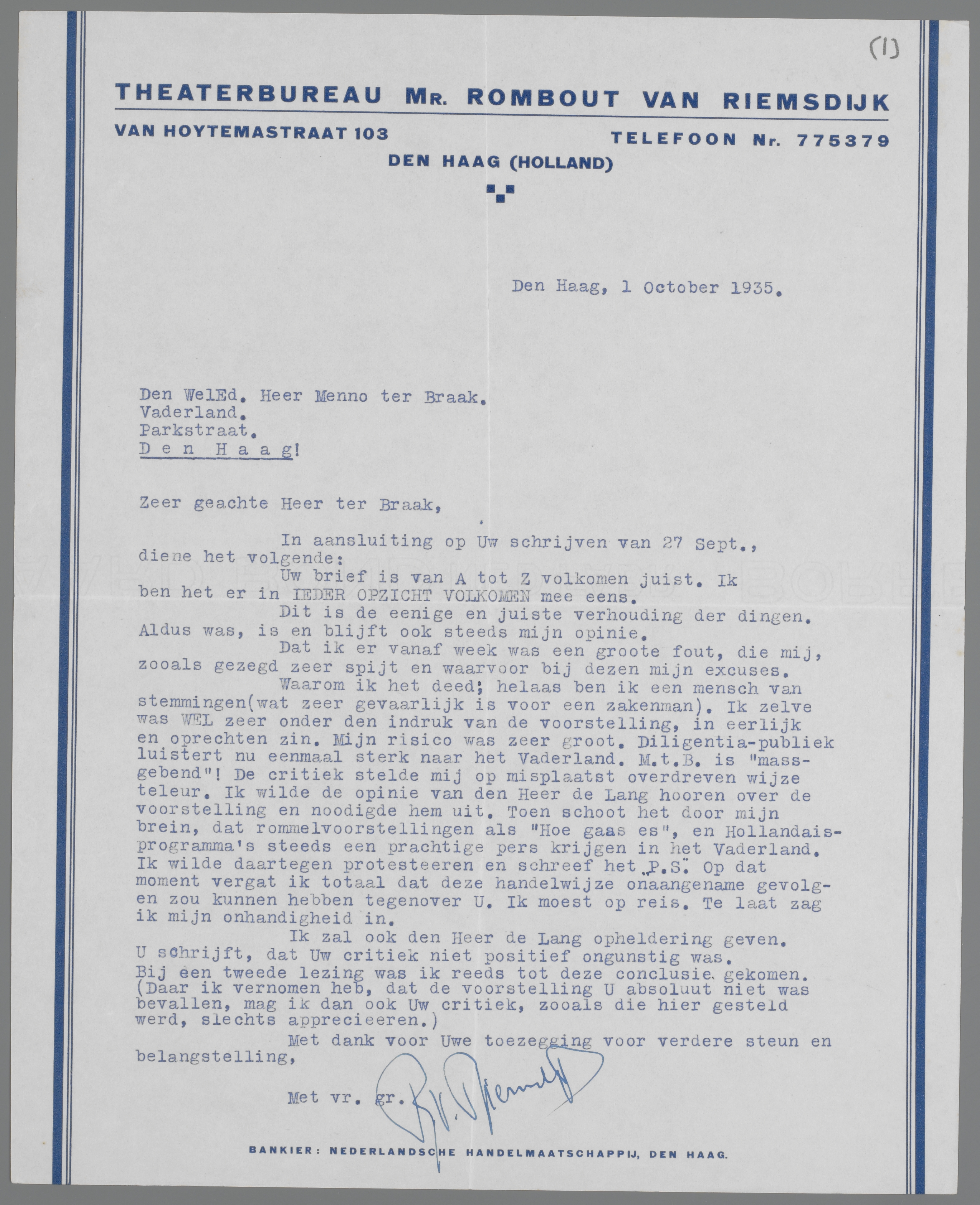 Waarom ik het deed; helaas ben ik een mensch van stemmingen (wat zeer gevaarlijk is voor een zakenman). Ik zelve was WEL zeer onder den indruk van de voorstelling, in eerlijk en oprechten zin. Mijn risico was zeer groot. Diligentia-publiek luistert nu eenmaal sterk naar het Vaderland. M.t.B is ‘massgebend’! De critiek stelde mij op misplaatst overdreven wijze teleur. Ik wilde de opinie van den Heer de Lang hooren over de voorstelling en noodigde hem uit. Toen schoot het door mijn brein, dat rommelvoorstellingen als ‘Hoe gaas es’, en Hollandais-programma's steeds een prachtige pers krijgen in het Vaderland. Ik wilde daartegen protesteeren en schreef het ‘P.S.’ Op dat moment vergat ik totaal dat deze handelwijze onaangename gevolgen zou kunnen hebben tegenover U. Ik moest op reis. Te laat zag ik mijn onhandigheid in.