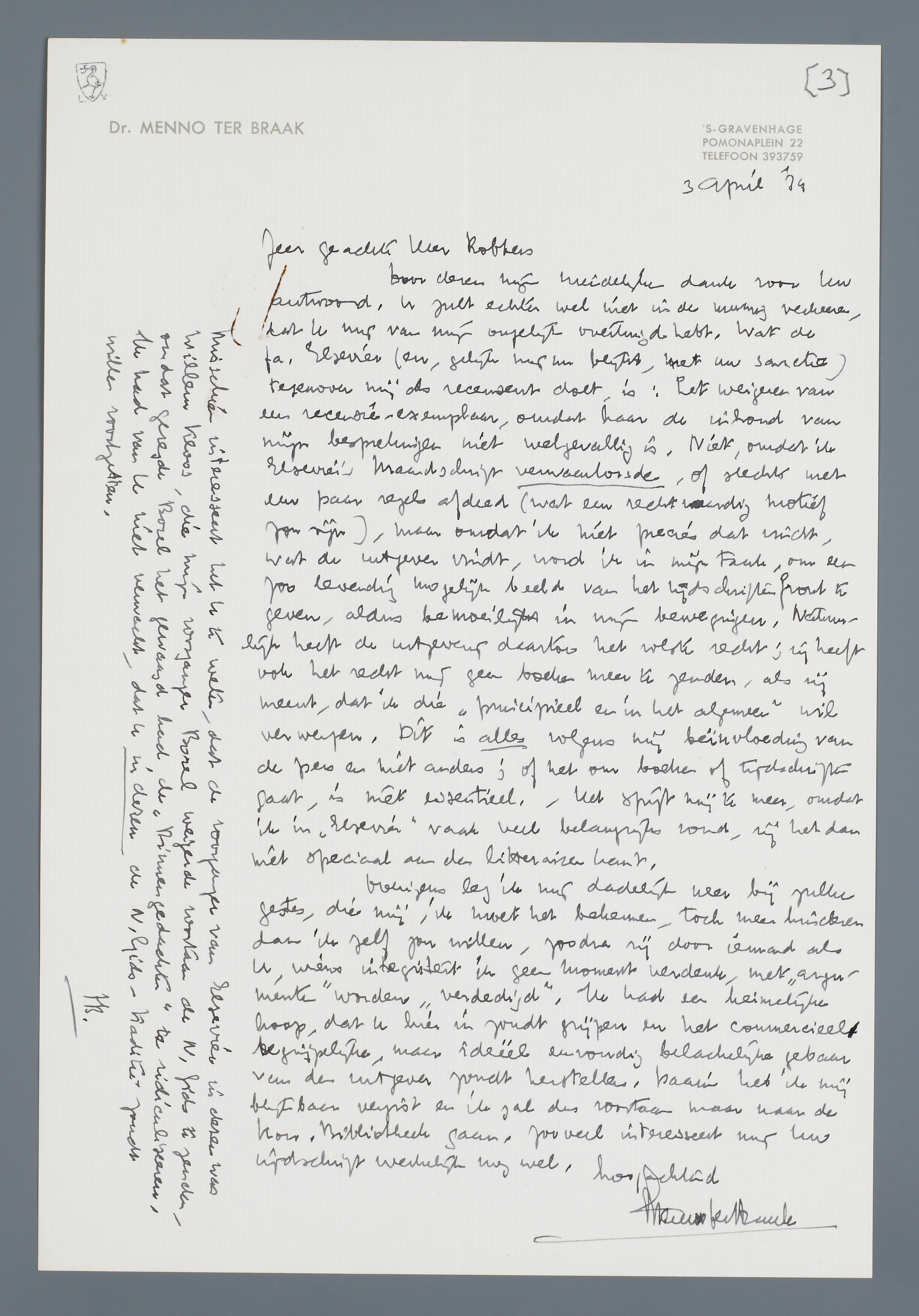 Overigens leg ik mij dadelijk neer bij zulke gestes, die mij, ik moet het bekennen, toch meer hinderen dan ik zelf zou willen, zoodra zij door iemand als U, wiens integriteit ik geen moment verdenk, met ‘argumenten’ worden ‘verdedigd’. Ik had een heimelijke hoop, dat u hier in zoudt grijpen en het commercieel begrijpelijke, maar ideeël eenvoudig belachelijke gebaar van den uitgever zoudt herstellen. Daarin heb ik mij blijkbaar vergist en ik zal dus voortaan maar naar de Kon. Bibliotheek gaan. Zooveel interesseert mij uw tijdschrift werkelijk nog wel.
