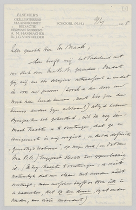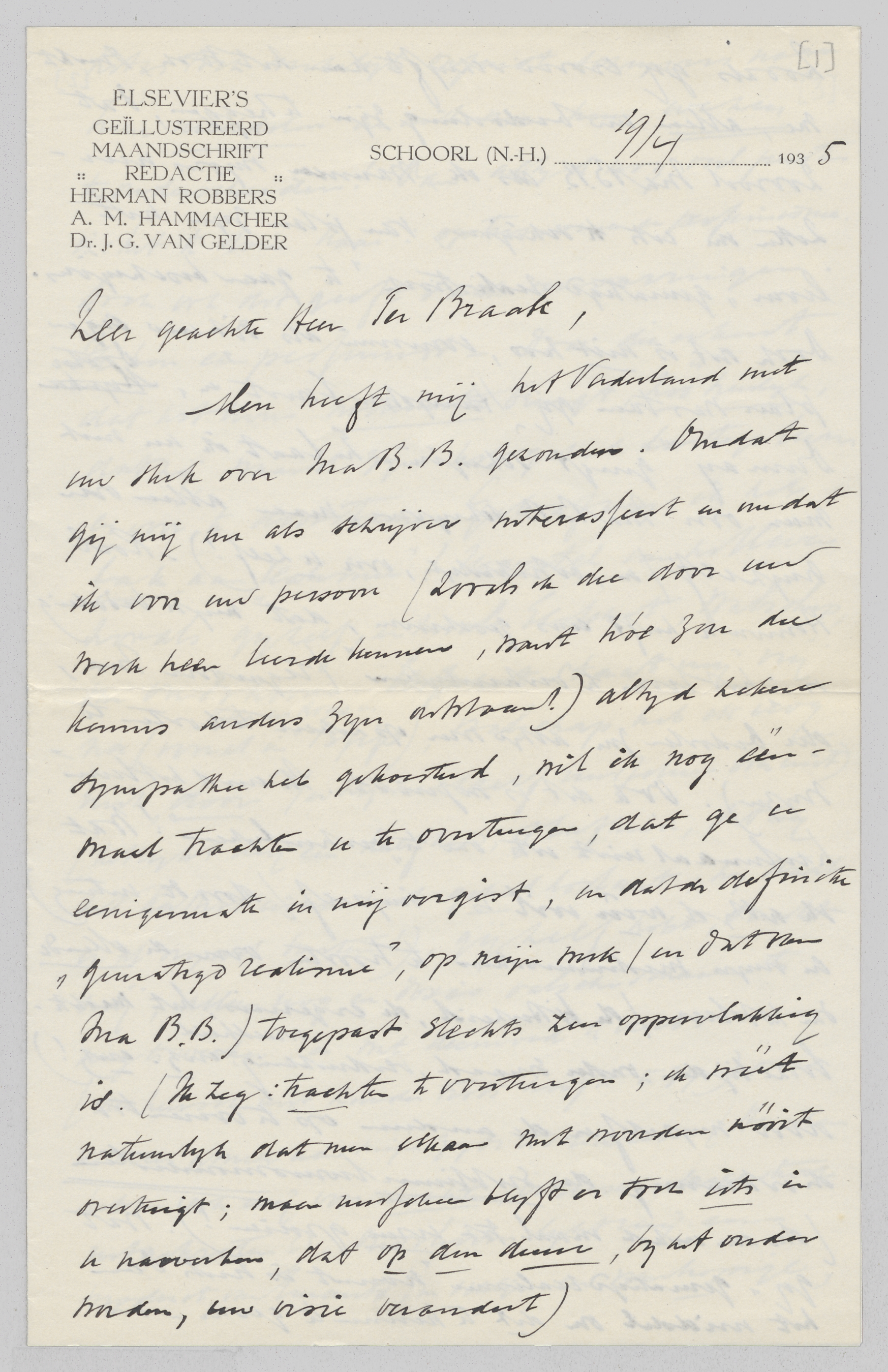 Men heeft mij het Vaderland met uw stuk over Ina B.B. gezonden. Omdat gij mij nu als schrijver interesseert en omdat ik voor uw persoon (zooals ik die door uw werk heen leerde kennen, want hóe zou die kennis anders zijn ontstaan?) altijd zekere sympathie heb gekoesterd, wil ik nog éénmaal trachten u te overtuigen, dat ge u eenigermate in mij vergist, en dat de definitie ‘gematigd realisme’, op mijn werk (en dat van Ina B.B.) toegepast slechts zeer oppervlakkig is. (Ik zeg: trachten te overtuigen; ik wéét natuurlijk dat men elkaar met woorden nóóit overtuigd; maar misschien blijft er toch iets in u nawerken, dat op den duur, bij het ouder worden, uw visie verandert).