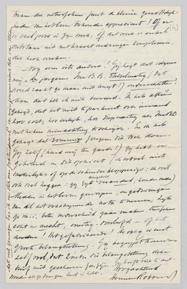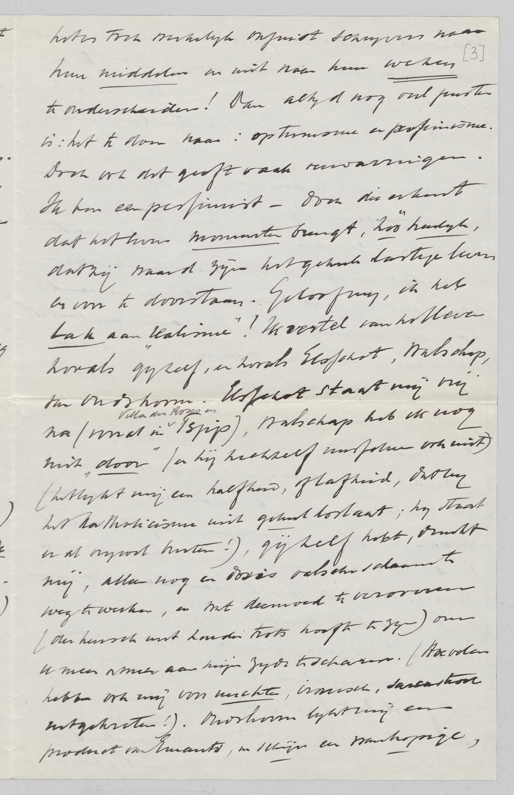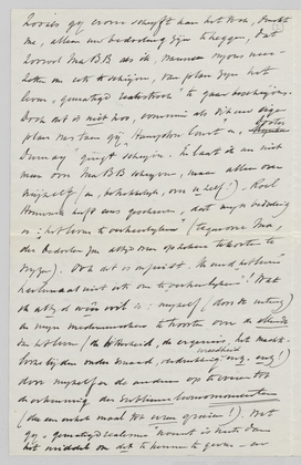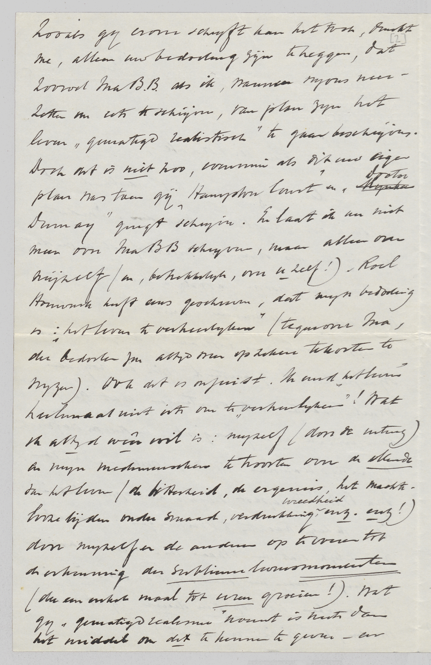 Zooals gij erover schrijft kan het toch, dunkt me, alleen uw bedoeling zijn te zeggen, dat zoowel Ina B.B. als ik, wanneer wij ons neerzetten om iets te schrijven, van plan zijn het leven ‘gematigd realistisch’ te gaan beschrijven. Doch dat is niet zoo, evenmin als dit uw eigen plan was toen gij ‘Hampton Court’ en ‘Doctor Dumay’ gingt schrijven. En laat ik nu niet meer over InaBB schrijven, maar alleen over mijzelf (en, betrekkelijk, over u zelf!). Roel Houwink heeft eens geschreven, dat mijn bedoeling is: ‘het leven te verheerlijken’ (tegenover Ina, die bedoelen zou] altijd weer op zekere tekorten te wijzen). Ook dat is onjuist. Ik vind ‘het leven’ helemaal niet iets om te ‘verheerlijken’! Wat ik altijd weér wil is: mijzelf (door de uiting) en mijn medemenschen te troosten over de ellende van het leven (de bitterheid, de ergernis, het machtelooze lijden onder smaad, verdrukking, wreedheid enz.enz!) door mijzelf en de anderen op te voeren tot de erkenning der sublieme levensmomenten (die een enkele maal tot uren groeien!). Wat gij ‘gematigd realisme’ noemt is niets dan het middel om dit te kunnen geven - en het is toch werkelijk onjuist schrijvers naar hun middelen en niet naar hun wezen te onderscheiden! Dan altijd nog veel juister is: het te doen naar: optimisme en pessimisme. Doch ook dat geeft vaak verwarringen. Ik ben een pessimist - doch die erkent dat het leven momenten brengt, zoo heerlijk, dat zij waard zijn het geheele lastige leven er voor te doorstaan. Geloof mij, ik heb lak aan ‘realisme’! Ik vertel van het leven zooals gijzelf, en zooals Elsschot, Walschap, van Oudshoorn. Elsschot staat mij vrij na (vooral in Villa des Roses en Tsjip), Walschap heb ik nog niet ‘door’ (en hij zichzelf misschien ook niet) (het lijkt mij een halfheid, of lafheid, zoolang het katholicisme niet geheel loslaat; hij staat er al [vrijwel buiten!], gijzelf hebt, dunkt mij, alleen nog een dosis valsche schaamte weg te werken, en wat deemoed te veroveren ([4 woorden onleesbaar] trots hoeft te zijn) om u meer en meer aan mijn zijde te scharen. (Hoevelen hebben ook mij voor nuchter, ironisch, sarcastisch uitgekreten!). Oudshoorn lijkt mij een product van Emants, in schijn een wanhopige, maar die intusschen juist de kleine genoeglijkheden van het leven bizonder apprecieert! Of er is veel pose in zijn werk, óf dat werk is enkel ontstaan uit met kracht verdrongen complexen, die zich wreken.
