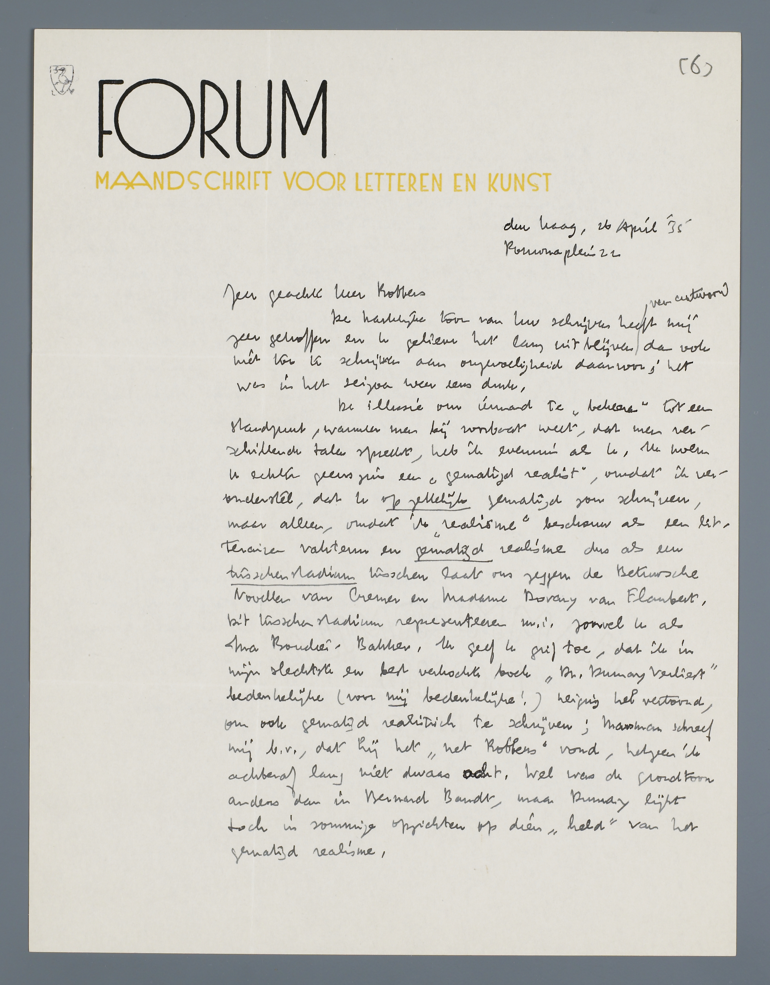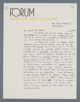 De illusie om iemand te ‘bekeeren’ tot een standpunt, wanneer men bij voorbaat weet, dat men verschillende talen spreekt, heb ik evenmin als U. Ik noem U echter geenszins een ‘gematigd realist’, omdat ik veronderstel, dat U opzettelijk gematigd zou schrijven, maar alleen, omdat ik ‘realisme’ beschouw als een litterairen vakterm en gematigd realisme dus als een tusschenstadium tusschen laat ons zeggen de Betuwsche Novellen van Cremer en Madame Bovary van Flaubert. Dit tusschenstadium representeeren m.i. zoowel U als Ina Boudier-Bakker. Ik geef U grif toe, dat ik in mijn slechtste en best verkochte boek ‘Dr. Dumay verliest’ bedenkelijke (voor mij bedenkelijke!) neiging heb vertoond, om ook gematigd realistisch te schrijven; Marsman schreef mij b.v., dat hij het ‘net Robbers’ vond, hetgeen ik achteraf lang niet dwaas acht. Wel was de grondtoon anders dan in Bernard Bandt, maar Dumay lijkt toch in sommige opzichten op dien ‘held’ van het gematigd realisme.