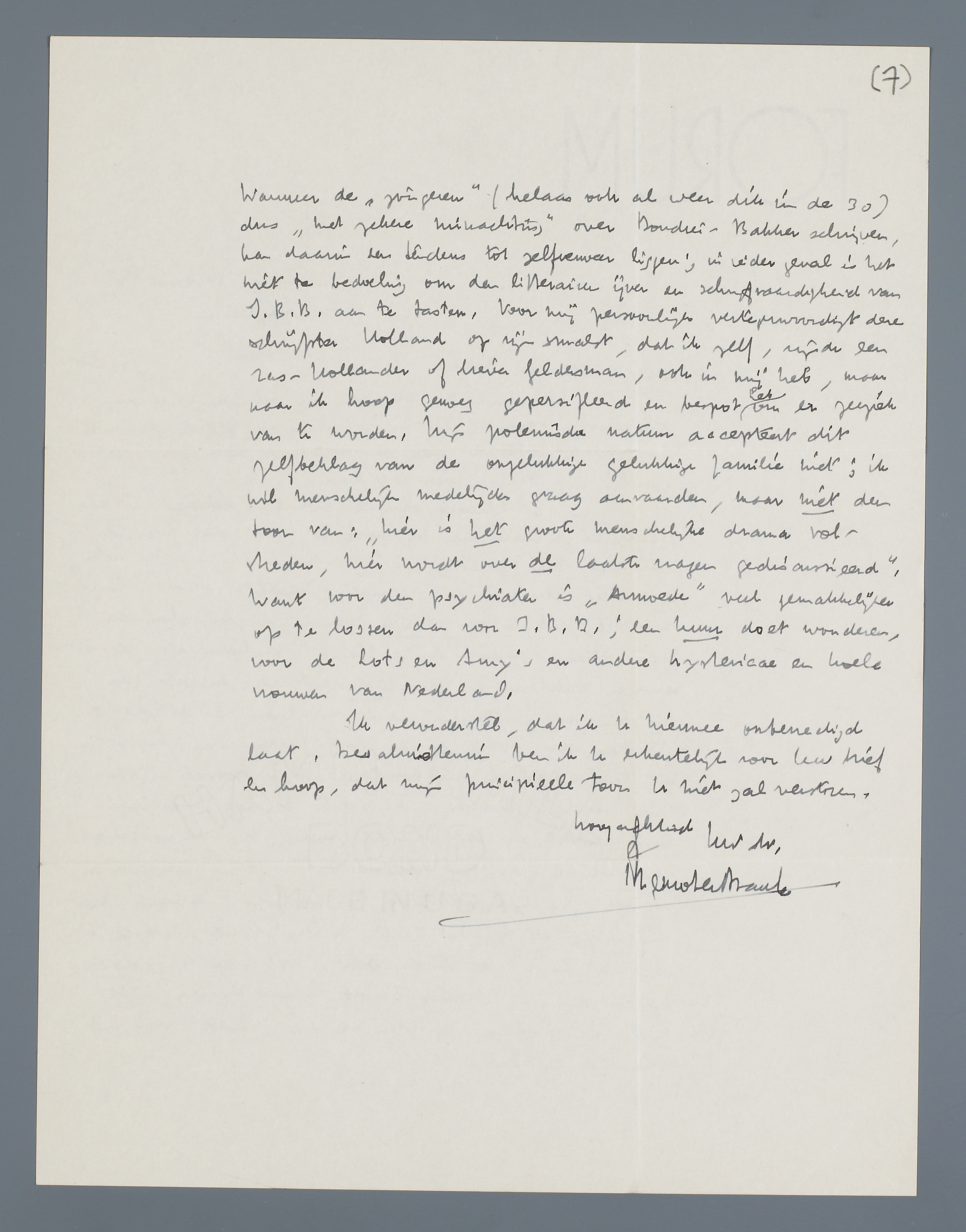 Wanneer de ‘jongeren’ (helaas ook al weer dik in de 30) dus ‘met zekere minachting’ over Boudier-Bakker schrijven, kan daarin een tendens tot zelfverweer liggen; in ieder geval is het niet de bedoeling om den litterairen ijver en schrijfvaardigheid van I.B.B. aan te tasten. Voor mij persoonlijk vertegenwoordigt deze schrijfster Holland op zijn smalst, dat ik zelf, zijnde een ras-Hollander of liever Geldersman, ook in mij heb, maar naar ik hoop genoeg gepersifleerd en bespot heb om er zeeziek van te worden. Mijn polemische natuur accepteert dit zelfbeklag van de ongelukkige gelukkige familie niet; ik wil menschelijk medelijden graag aanvaarden, maar niet den toon van: ‘hier is het groote menschelijke drama volstreden, hier wordt over de laatste vragen ‘gediscussieerd’. Want voor den psychiater is ‘Armoede’ veel gemakkelijker op te lossen dan voor I.B.B.; een kuur doet ook wonderen, voor de Lots en Amy's en andere hystericae en koele vrouwen van Nederland.