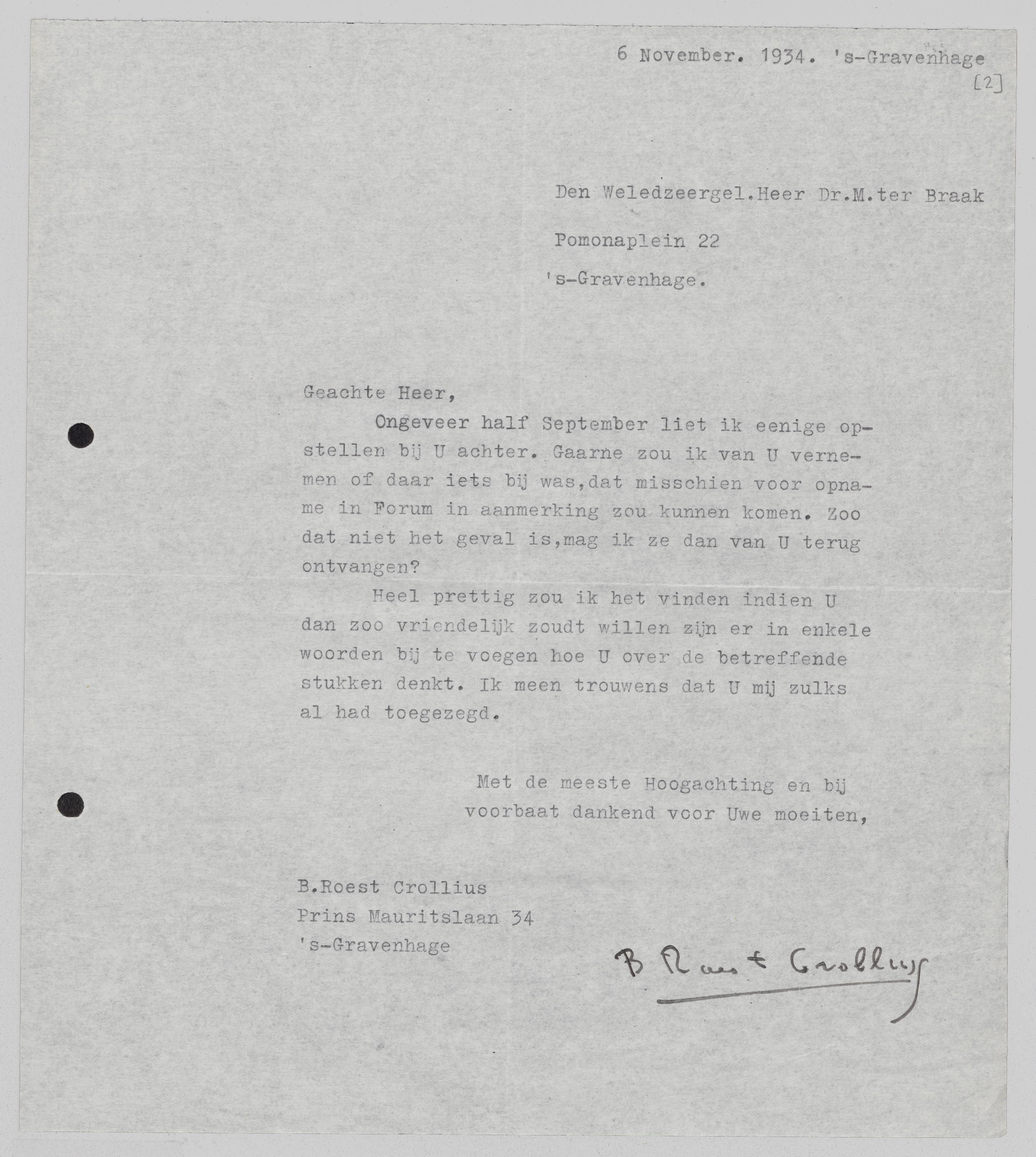 Ongeveer half September liet ik eenige opstellen bij U achter. Gaarne zou ik van U vernemen of daar iets bij was, dat misschien voor opname in Forum in aanmerking zou kunnen komen. Zoo dat niet het geval is, mag ik ze dan van U terug ontvangen?