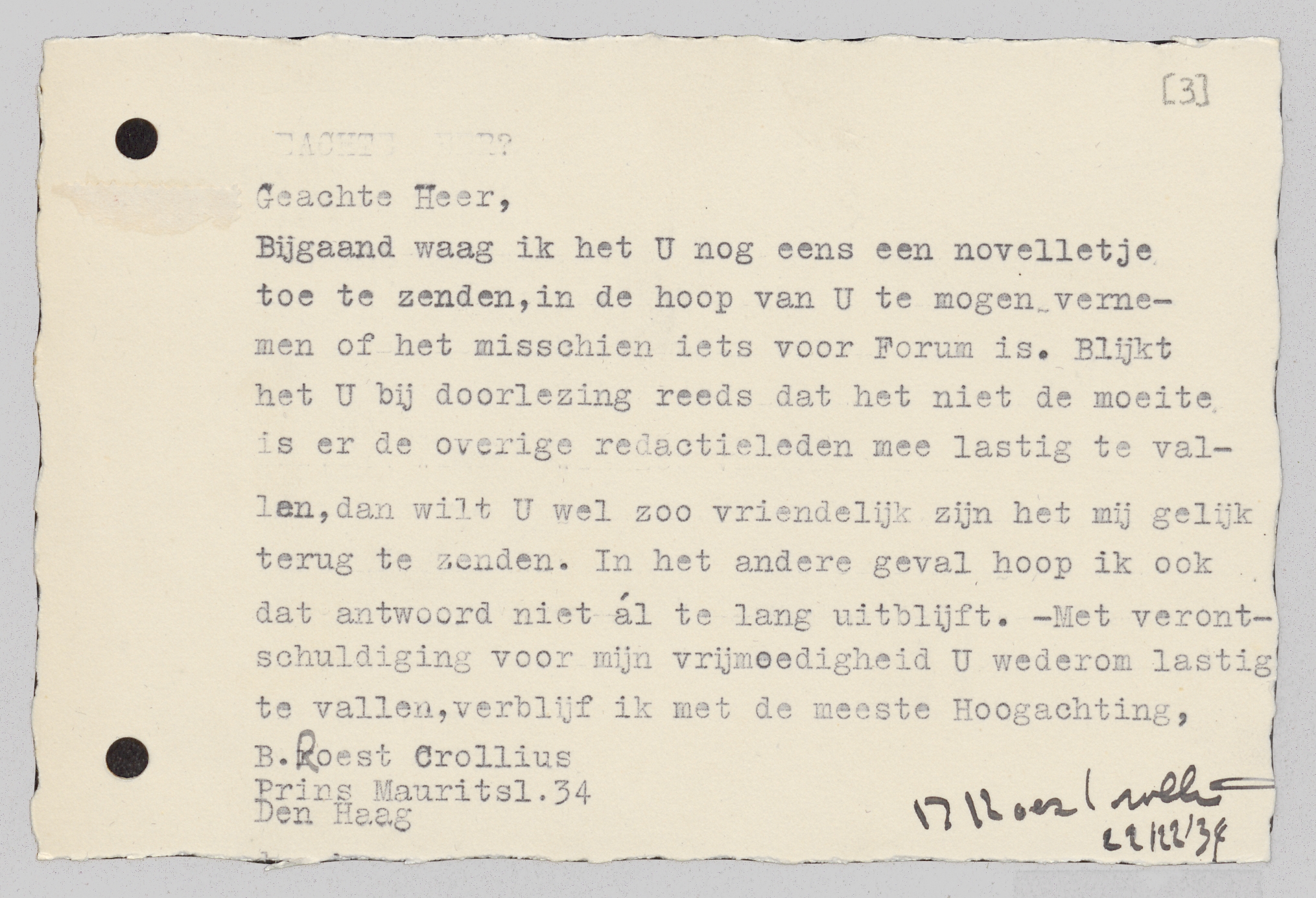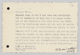 Bijgaand waag ik het U nog eens een novelletje toe te zenden, in de hoop van U te mogen vernemen of het misschien iets voor Forum is. Blijkt het U bij doorlezing reeds dat het niet de moeite is er de overige redactieleden mee lastig te vallen, dan wilt U wel zoo vriendelijk zijn het mij gelijk terug te zenden. In het andere geval hoop ik ook dat antwoord niet ál te lang uitblijft. - Met verontschuldiging voor mijn vrijmoedigheid U wederom lastig te vallen, verblijf ik met de meeste Hoogachting,