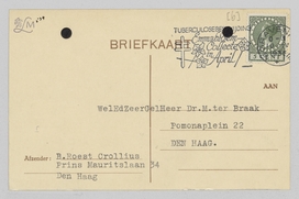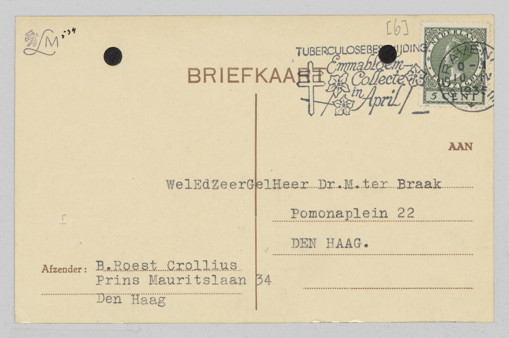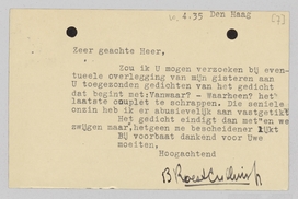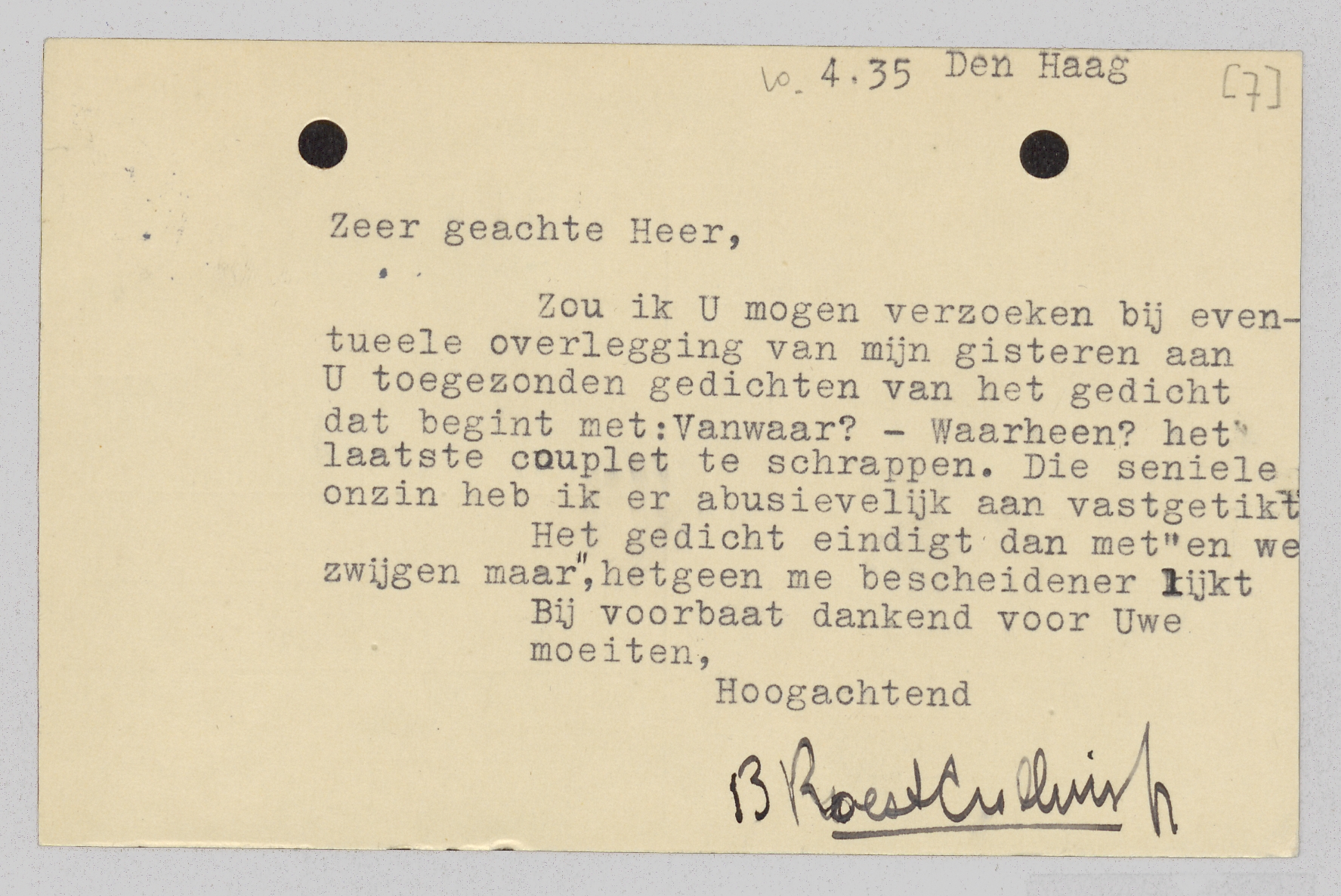 Zou ik U mogen verzoeken bij eventueele overlegging van mijn gisteren aan U toegezonden gedichten van het gedicht dat begint met: Vanwaar? - Waarheen? het laatste couplet te schrappen. Die seniele onzin heb ik er abusievelijk aan vastgetikt.