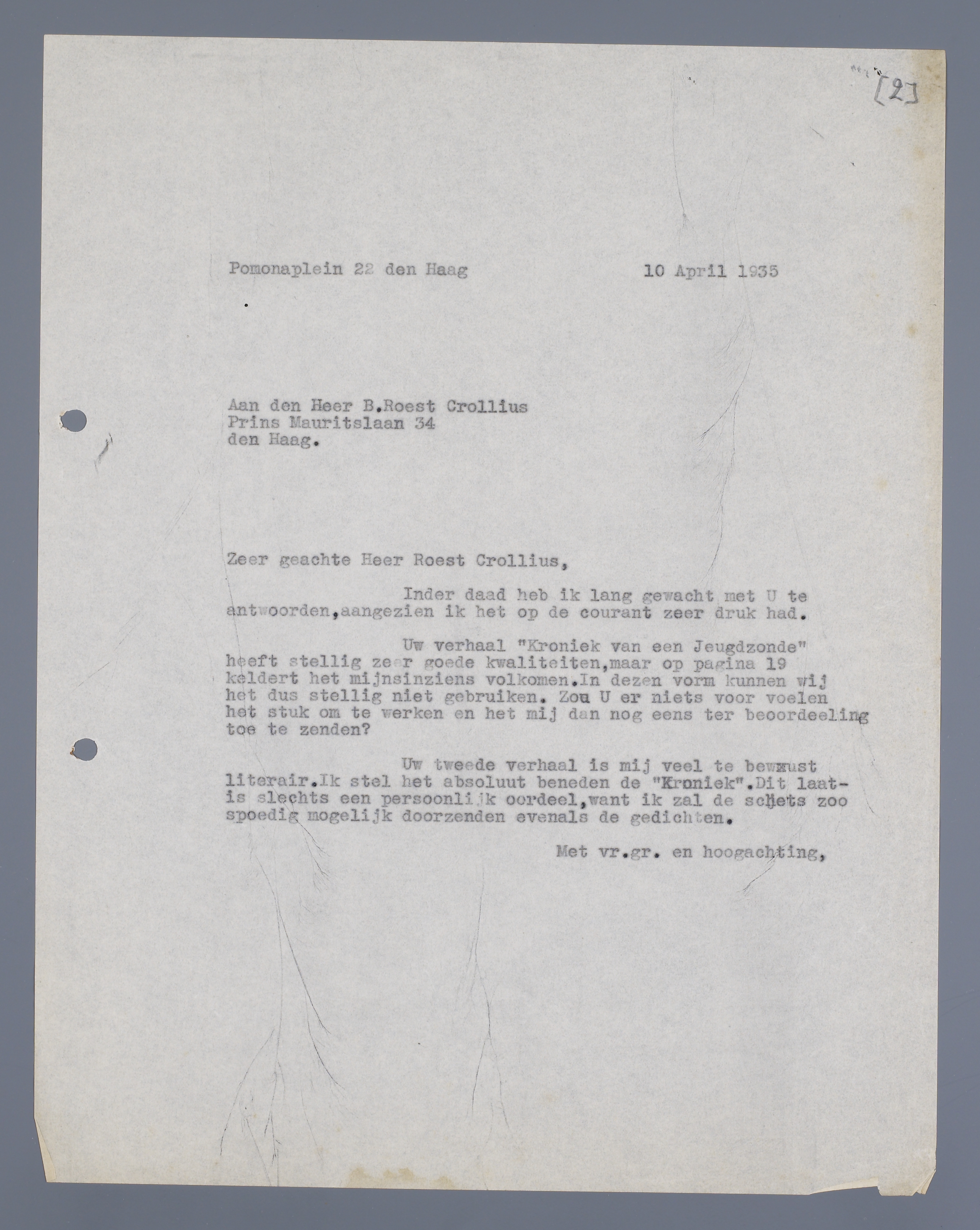 Uw verhaal ‘kroniek van een Jeugdzonde’ heeft stellig zeer goede kwaliteiten, maar op pagina 19 keldert het mijns inziens volkomen. In dezen vorm kunnen wij het dus stellig niet gebruiken. Zou U er niets voor voelen het stuk om te werken en het mij dan nog eens ter beoordeeling toe te zenden?