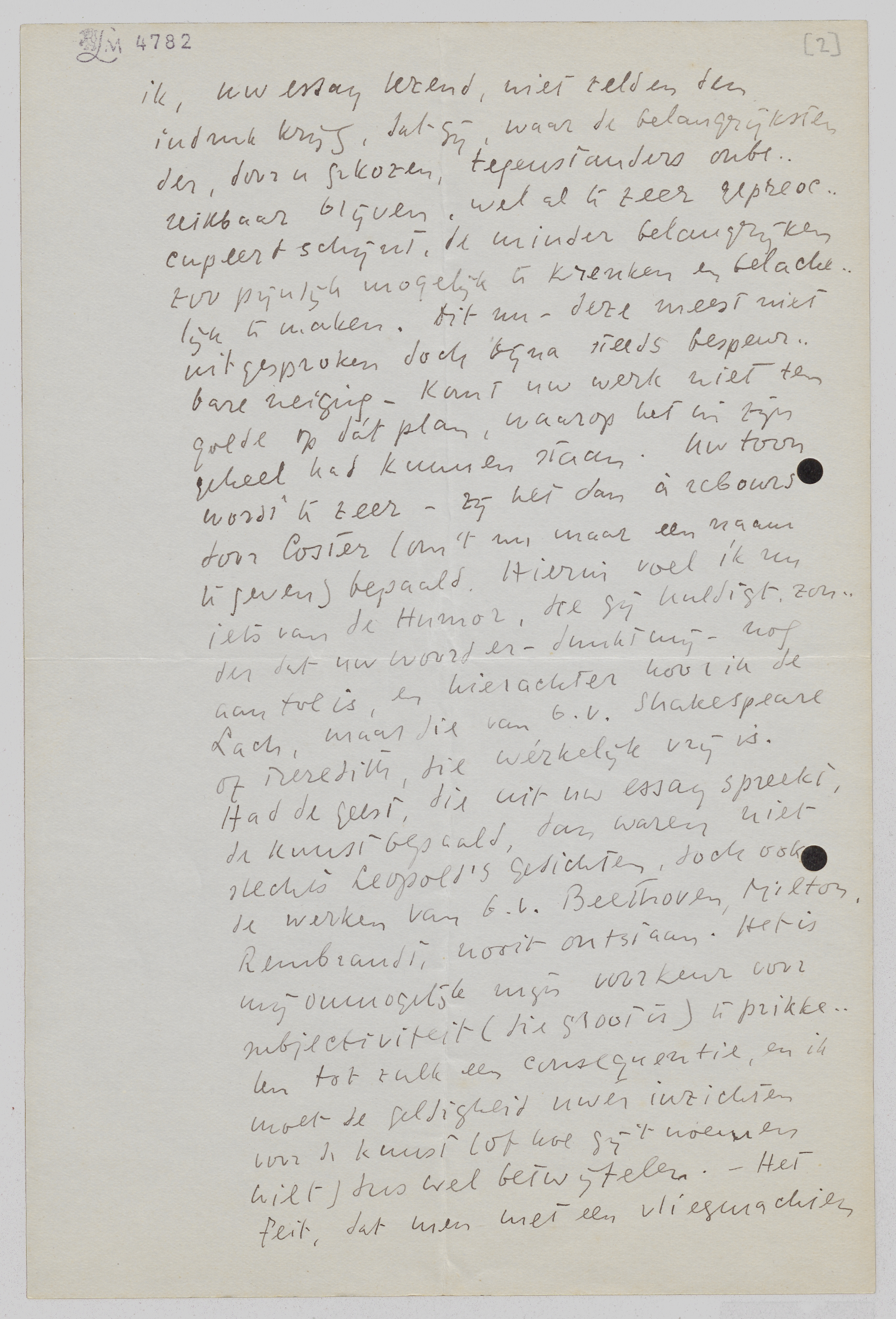 Ik heb wel zeer ‘at random’ enkele bezwaren opgegeven, die ik voelde bij het lezen van uw essay, en die minder uit verschil van meening voortkomen dan wel uit de overtuiging, dat gij, door de wijze waarop gij u instelt, uw eigen meeningen niet altijd tot hun volle waarde laat komen. Met die meeningen als zoodanig ben ik het dikwijls geheel eens; zoo b.v. op p. 19: ‘de schoonheid leidt den dichter van de natuur tot de kunst’ - en de volgende alinea: ‘die kunst is de derde mogelijkheid’ - en waar gij zegt: ‘de schoonheid opent ons de wereld van het verlies’. Slechts beseft gijzelf niet, hoe - door uw verkeerde kijk op wat esthetisch is en wat niet - de diepste mogelijkheden uwer eigen meeningen u ontgaan.