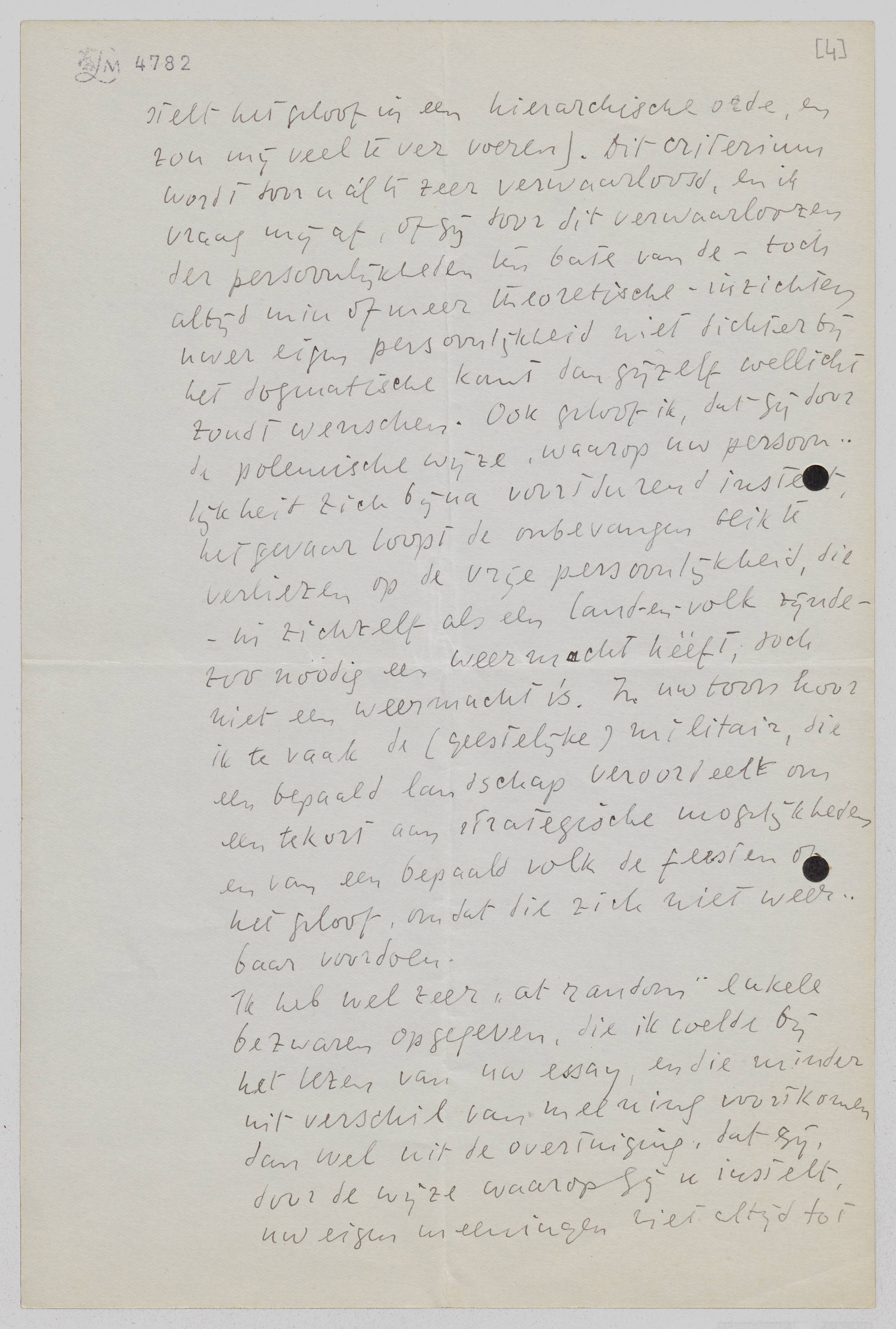 Wellicht verbaast het u na dit alles, dat ik uw essay toch in ‘De Gids’ hoop te zien. Ik vind echter, dat uw persoonlijkheid er zich op een hoezeer door het polemische ook beperkte, toch zoo klare wijze in uitspreekt, dat een geestelijke ontmoeting inderdaad, lezende, plaats grijpt. Bovendien geef ik graag toe, dat de zoo dilwijls polemische toon, door haar groote bekwaamheid, ook haar voordeel heeft - dát n.m. van te prikkelen tot verweer tegen díe dogmatiek- à rebours, waarvan de humor mij u nu eenmaal als een voorvechter doet zien.