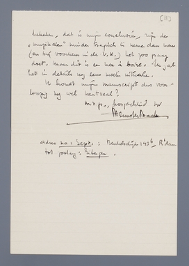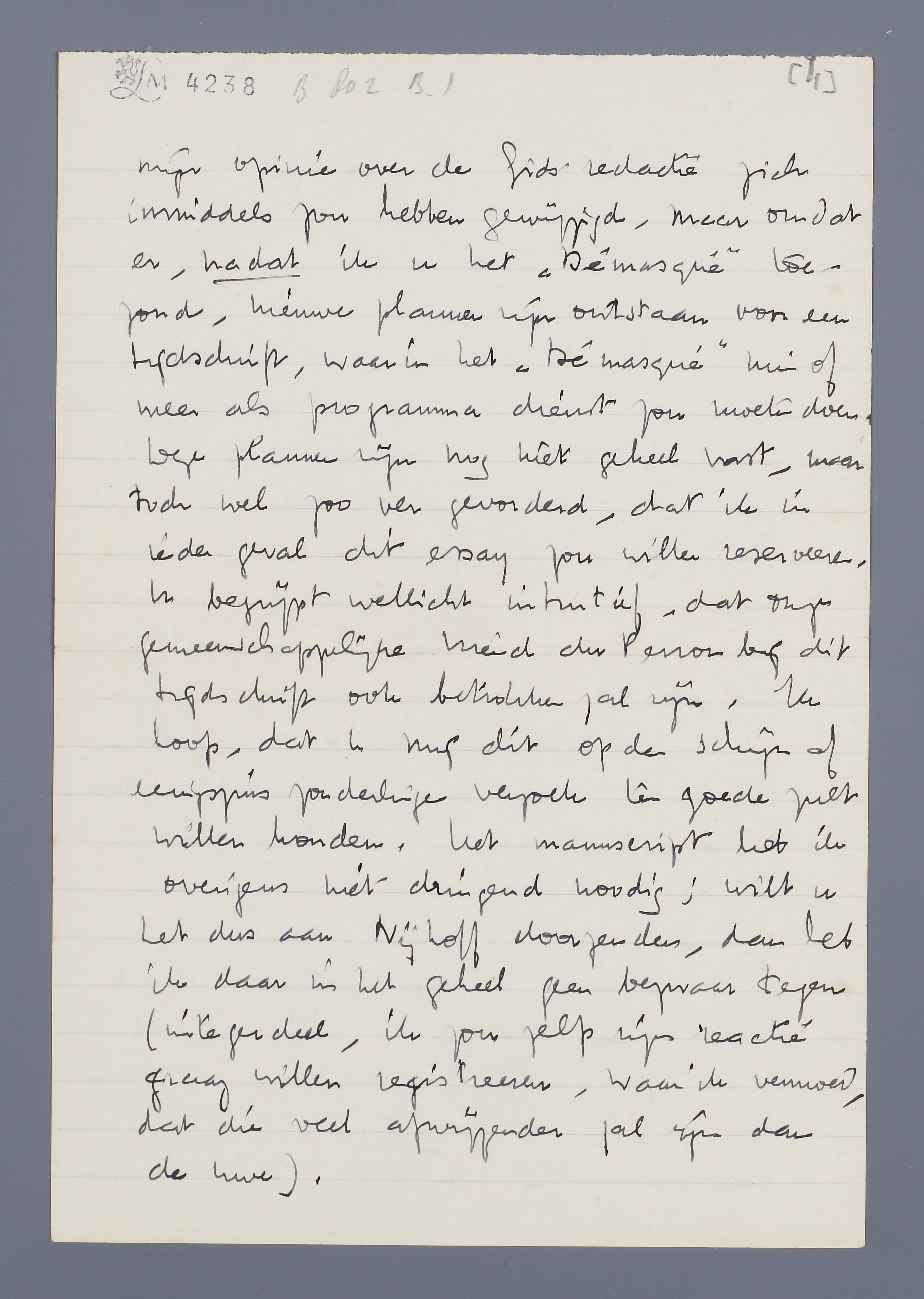 Ik moet u eerst met een verzoek lastig vallen, dat u misschien ietwat grillig zal toeschijnen. Ik zou n.l. voorloopig dit essay niet aan de Gids-redactie willen aanbieden; niet, omdat mijn opinie over de Gids-redactie zich inmiddels zou hebben gewijzigd, maar omdat er, nadat ik u het ‘Démasqué’ toezond, nieuwe plannen zijn ontstaan voor een tijdschrift, waarin het ‘Démasqué’ min of meer als programma dienst zou moeten doen. Deze plannen zijn nog niet geheel vast, maar toch wel zoo ver gevorderd, dat ik in ieder geval dit essay zou willen reserveeren. U begrijpt wellicht intuitief, dat onze gemeenschappelijke vriend du Perron bij dit tijdschrift ook betrokken zal zijn. Ik hoop, dat u mij dit op den schijn af eenigszins zonderlinge verzoek ten goede zult willen houden. Het manuscript heb ik overigens niet dringend noodig; wilt u het dus aan Nijhoff doorzenden, dan heb ik daar in het geheel geen bezwaar tegen (integendeel, ik zou zelfs zijn reactie graag willen registreeren, waar ik vermoed, dat die veel afwijzender zal zijn dan de uwe).