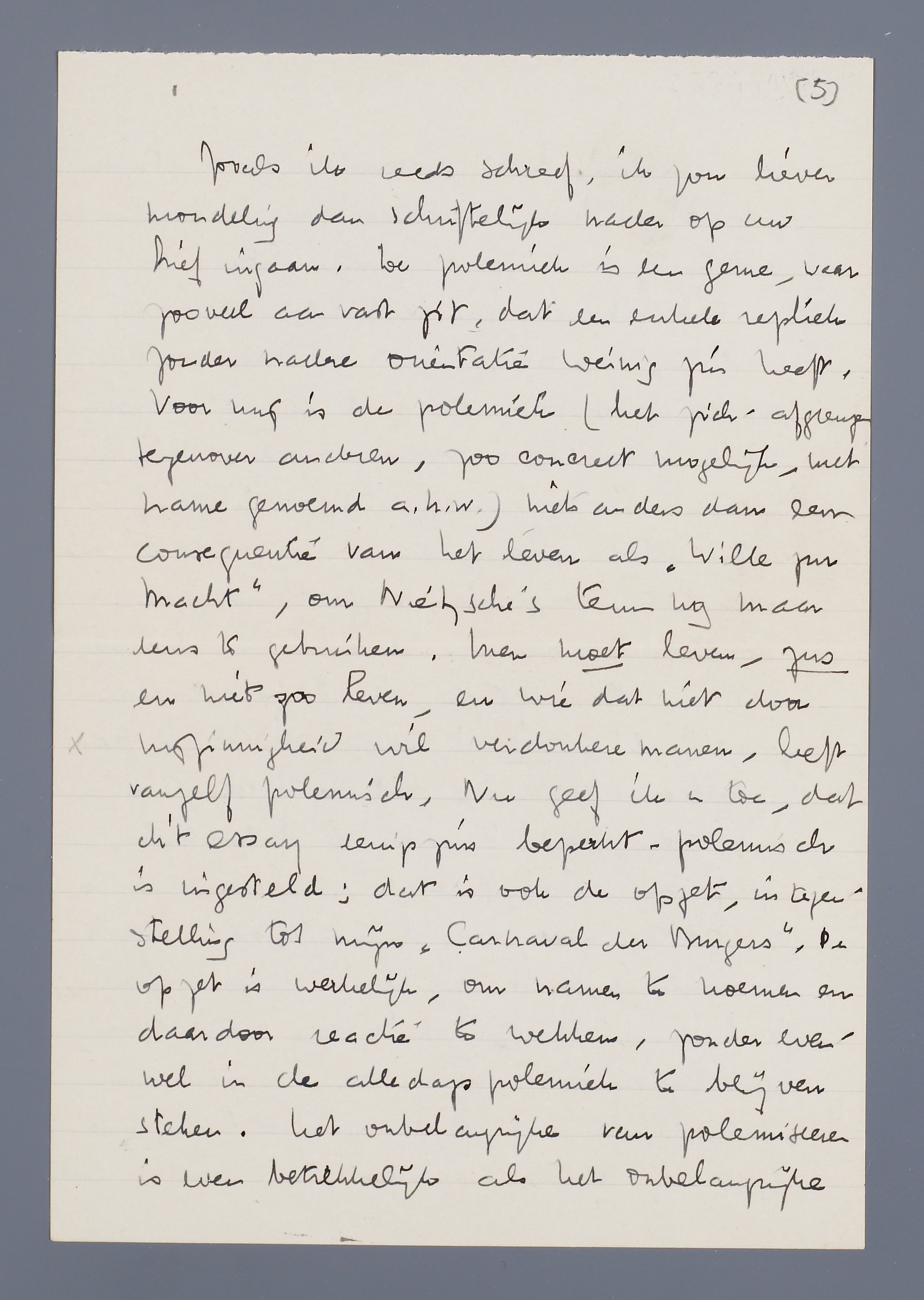 Zooals ik reeds schreef, ik zou liever mondeling dan schriftelijk nader op uw brief ingaan. De polemiek is een genre, waar zooveel aan vast zit, dat een enkele repliek zonder nadere orientatie weinig zin heeft. Voor mij is de polemiek (het zich-afgrenzen tegenover anderen, zoo concreet mogelijk, met name genoemd a.h.w.) niets anders dan een consequentie van het leven als ‘Wille zur Macht’, om Nietzsche's term nog maar eens te gebruiken. Men moet leven, zus en niet zoo leven, en wie dat niet door vrijzinnigheid wil verdonkeremanen, leeft vanzelf polemisch. Nu geef ik u toe, dat dit essay eenigszins beperkt polemisch is ingesteld; dat is ook de opzet, in tegenstelling tot mijn ‘Carnaval der Burgers’. De opzet is werkelijk, om namen te noemen en daardoor reactie te wekken, zonder evenwel in de alledagspolemiek te blijven steken. Het onbelangrijke van polemiseeren is even betrekkelijk als het onbelangrijke van dichten; het forceeren van ontmoetingen zal de één hier, de ander daar wagen; maar qualitatief verschil is er m.i. niet.