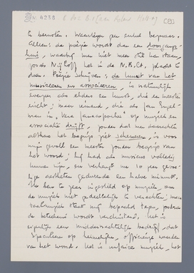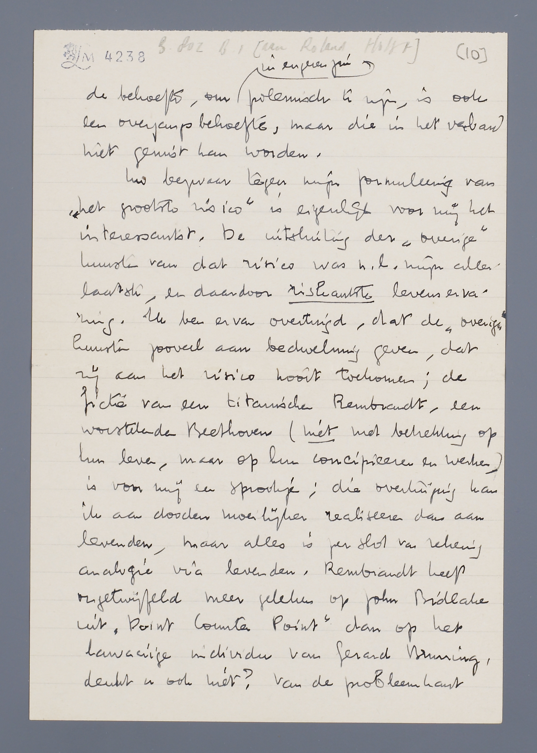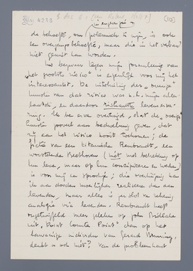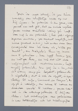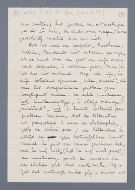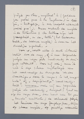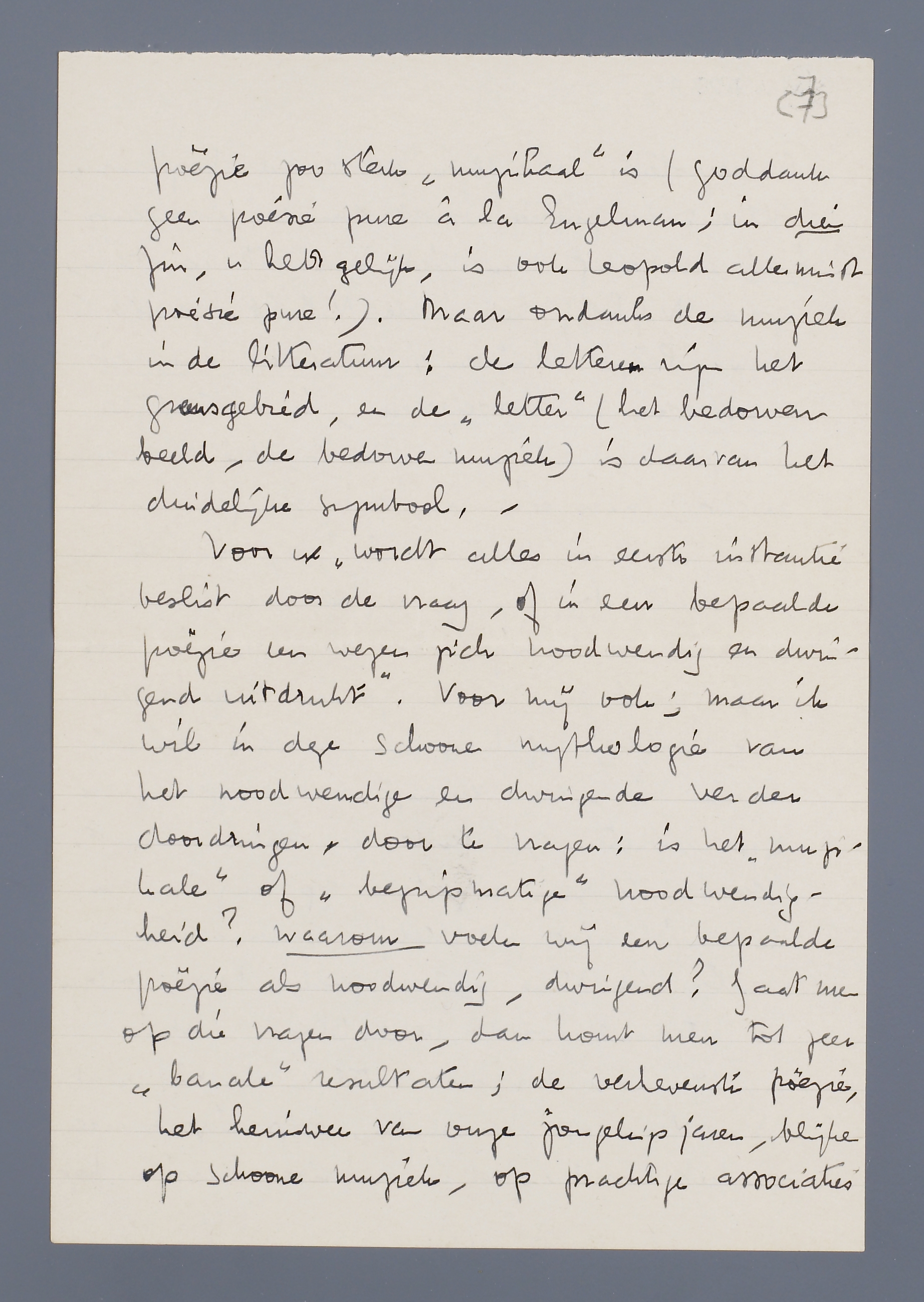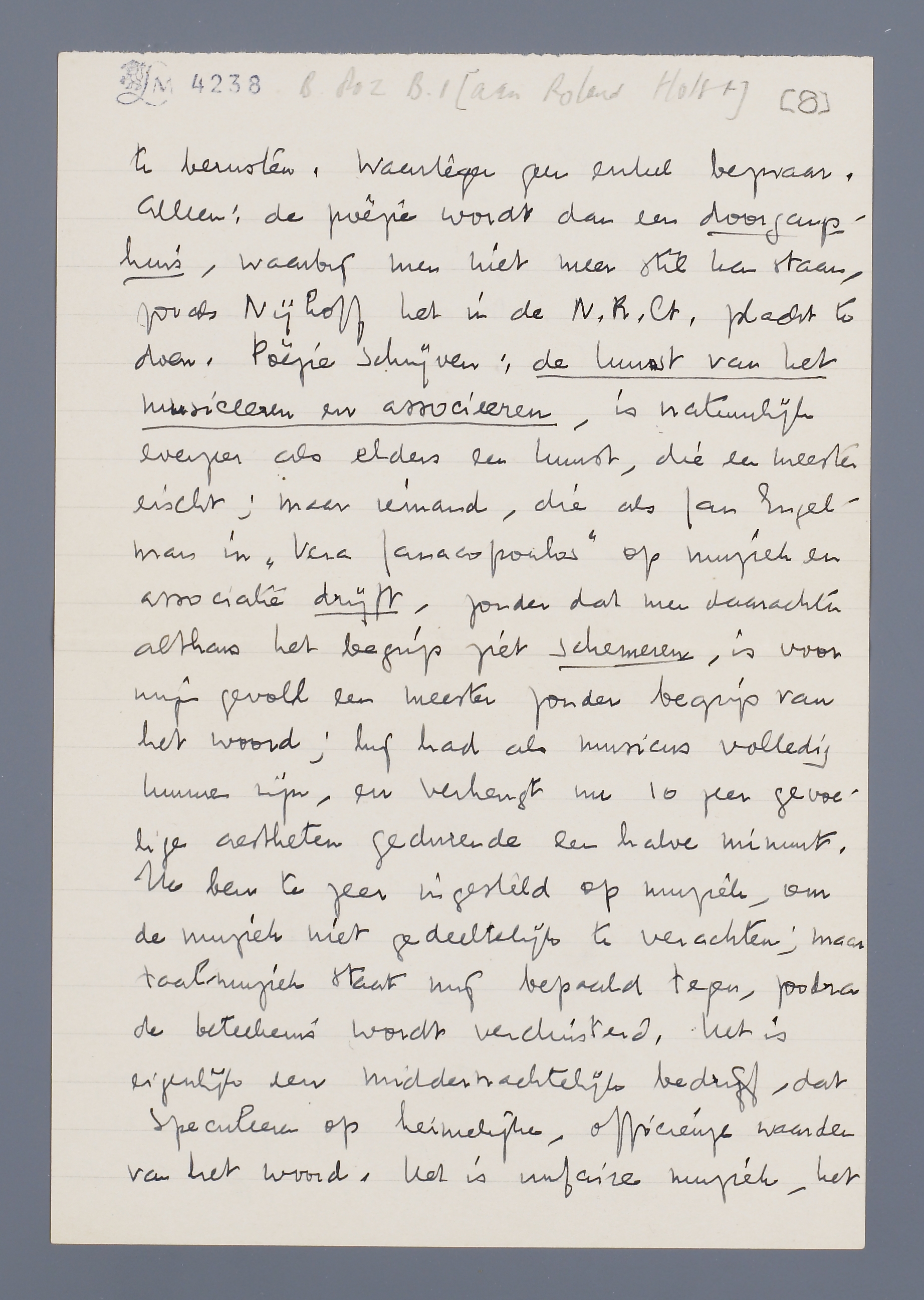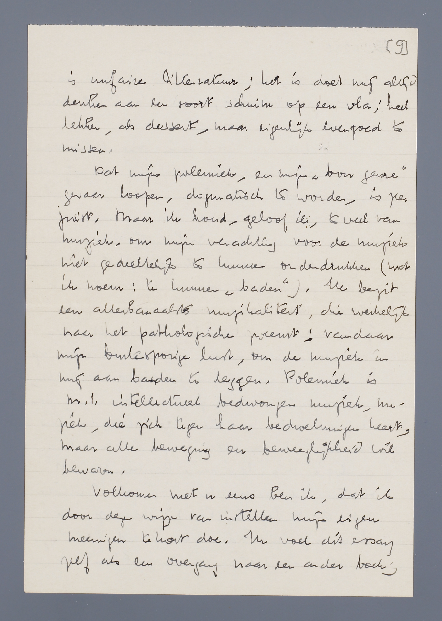Dat mijn polemiek, en mijn ‘bon genre’ gevaar loopen, dogmatisch te worden, is zeer juist. Maar ik houd, geloof ik, te veel van muziek, om mijn verachting voor de muziek niet gedeeltelijk te kunnen onderdrukken (wat ik noem: te kunnen ‘baden’). Ik bezit een allerbanaalste muzikaliteit, die werkelijk naar het pathologische zweemt; vandaar mijn buitensporige lust, om de muziek in mij aan banden te leggen. Polemiek is m.i. intellectueel bedwongen muziek, muziek, die zich tegen haar bedoelingen keert, maar alle beweging en beweeglijkheid wil bewaren.
