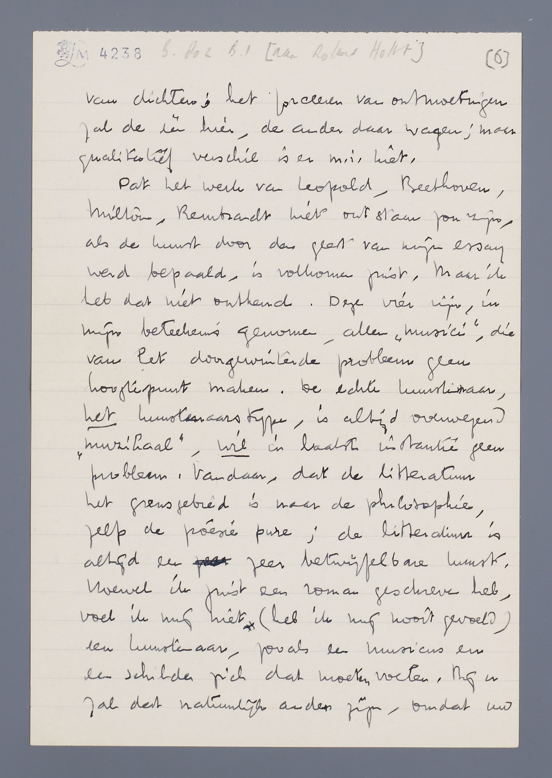 Dat het werk van Leopold, Beethoven, Milton, Rembrandt niet ontstaan zou zijn, als de kunst door den geest van mijn essay werd bepaald, is volkomen juist. Maar ik heb dat niet ontkend. Deze vier zijn, in mijn beteekenis genomen, allen ‘musici’, die van het doorgewinterde probleem geen hoogtepunt maken. De echte kunstenaar, het kunstenaarstype, is altijd overwegend ‘muzikaal’, wil in laatste instantie geen probleem. Vandaar, dat de litteratuur het grensgebied is naar de philosophie, zelfs de poésie pure; de litteratuur is altijd een zeer betwijfelbare kunst. Hoewel ik juist een roman geschreven heb, voel ik mij niet (heb ik mij nog nooit gevoeld) een kunstenaar, zooals een musicus en een schilder zich dat moeten voelen. Bij u zal dat natuurlijk anders zijn, omdat uw poëzie zoo sterk ‘muzikaal’ is (goddank geen poésie pure à la Engelman; in dien zin, u hebt gelijk, is ook Leopold allerminst poésie pure!). Maar ondanks de muziek in de litteratuur: de letteren zijn het grensgebied, en de ‘letter’ (het bedorven beeld, de bedorven muziek) is daarvan het duidelijke symbool. -