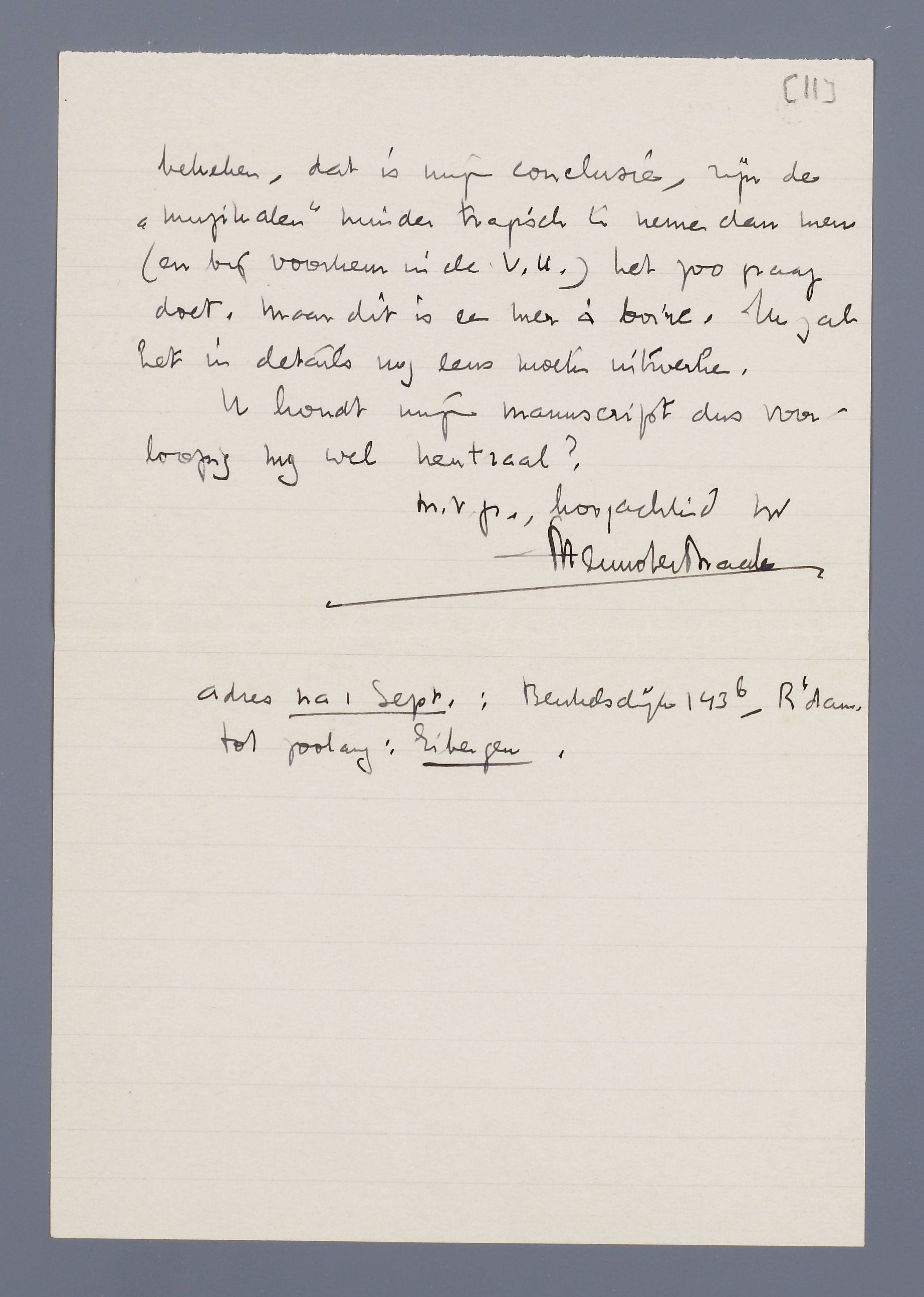 Uw bezwaar tegen mijn formuleering van ‘het grootste risico’ is eigenlijk voor mij het interessantst. De uitsluiting der ‘overige’ kunsten van dat risico was n.l. mijn allerlaatste, en daardoor riskantste levenservaring. Ik ben ervan overtuigd, dat de ‘overige’ kunsten zooveel aan bedwelming geven, dat zij aan het risico nooit toekomen; de fictie van een titanische Rembrandt, een worstelende Beethoven (niet met betrekking op hun leven, maar op concipieeren en werken) is voor mij een sprookje; die overtuiging kan ik aan dooden moeilijker realiseeren dan aan levenden, maar alles is per slot van rekening analogie via levenden. Rembrandt heeft ongetwijfeld meer geleken op John Bidlake uit ‘Point Counter Point’ dan op het lawaaïge individu van Gerard Bruning, denkt u ook niet? Van de probleemkant bekeken, dat is mijn conclusie, zijn de ‘muzikalen’ minder tragisch te nemen dan men (en bij voorkeur in de V.U.) het zoo graag doet. Maar dit is een mer à boire. Ik zal het in details nog eens moeten uitwerken.
