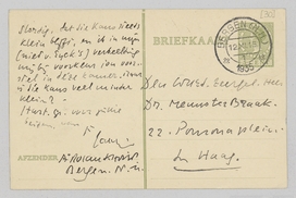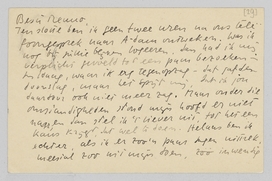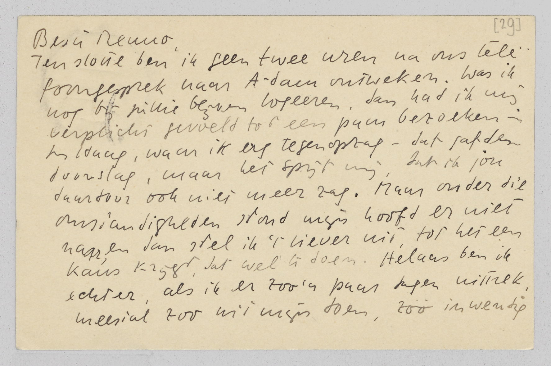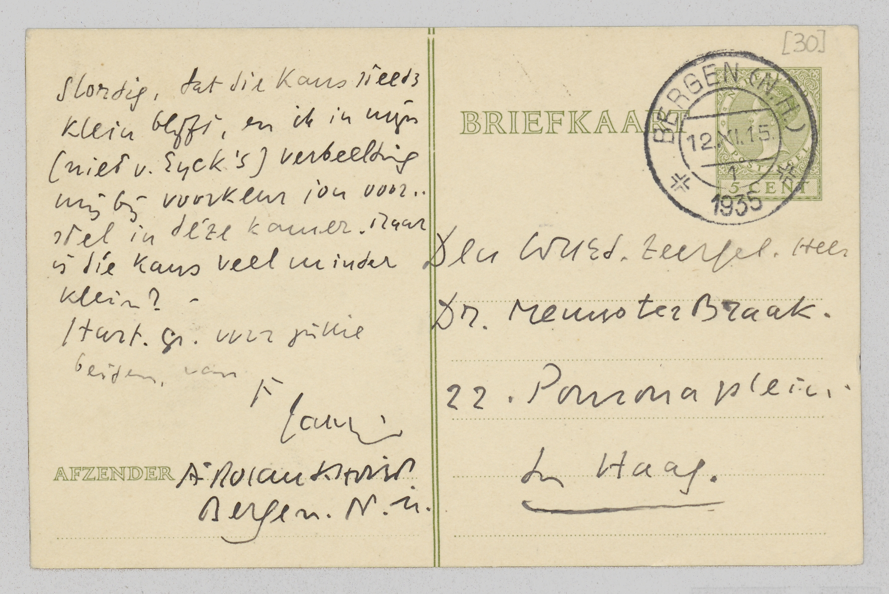 Tenslotte ben ik geen twee uren na ons telefoongesprek naar A'dam ontweken. Was ik nog bij jullie blijven logeeren, dan had ik mij verplicht gevoeld tot een paar bezoeken in Den Haag, waar ik erg tegenop zag - dat gaf den doorslag, maar het spijt mij, dat ik jou daardoor ook niet meer zag. Maar onder die omstandigheden stond mijn hoofd er niet naar, en dan stel ik 't liever uit, tot het een kans krijgt, dat wel te doen is. Helaas ben ik echter, als ik er zoo'n paar dagen uittrek, meestal zoo uit mijn doen, zóó inwendig slordig, dat die kans steeds klein blijft, en ik in mijn (niet v. Eyck's) verbeelding mij bij voorkeur jou voorstel in deze kamer. Maar is die kans veel minder klein?