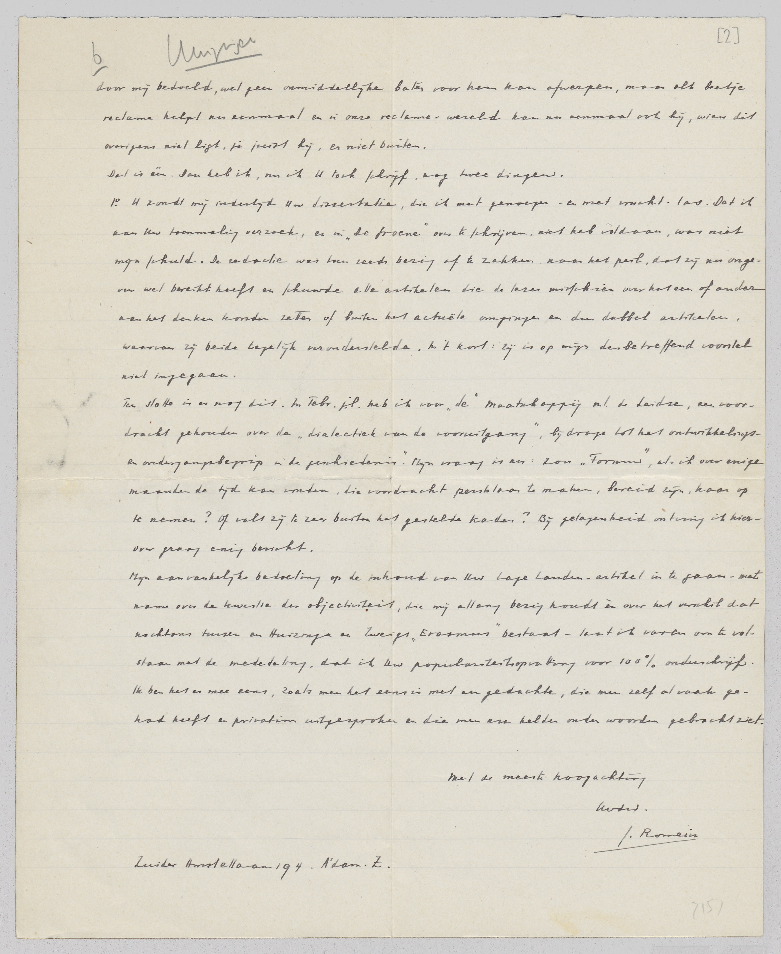 Mijn aanvankelijke bedoeling op de inhoud van Uw Lage Landen-artikel in te gaan - met name over de kwestie der objectiviteit, die mij allang bezig houdt èn over het verschil dat nochtans tussen Huizinga en Zweigs ‘Erasmus’ bestaat - laat ik varen om te volstaan met de mededeling, dat ik Uw populariteitsopvatting voor 100% onderschrijf. Ik ben het er mee eens, zoals men het eens is met een gedachte, die men zelf al vaak gehad heeft en privatum uitgesproken en die men nu helder onder woorden gebracht ziet.