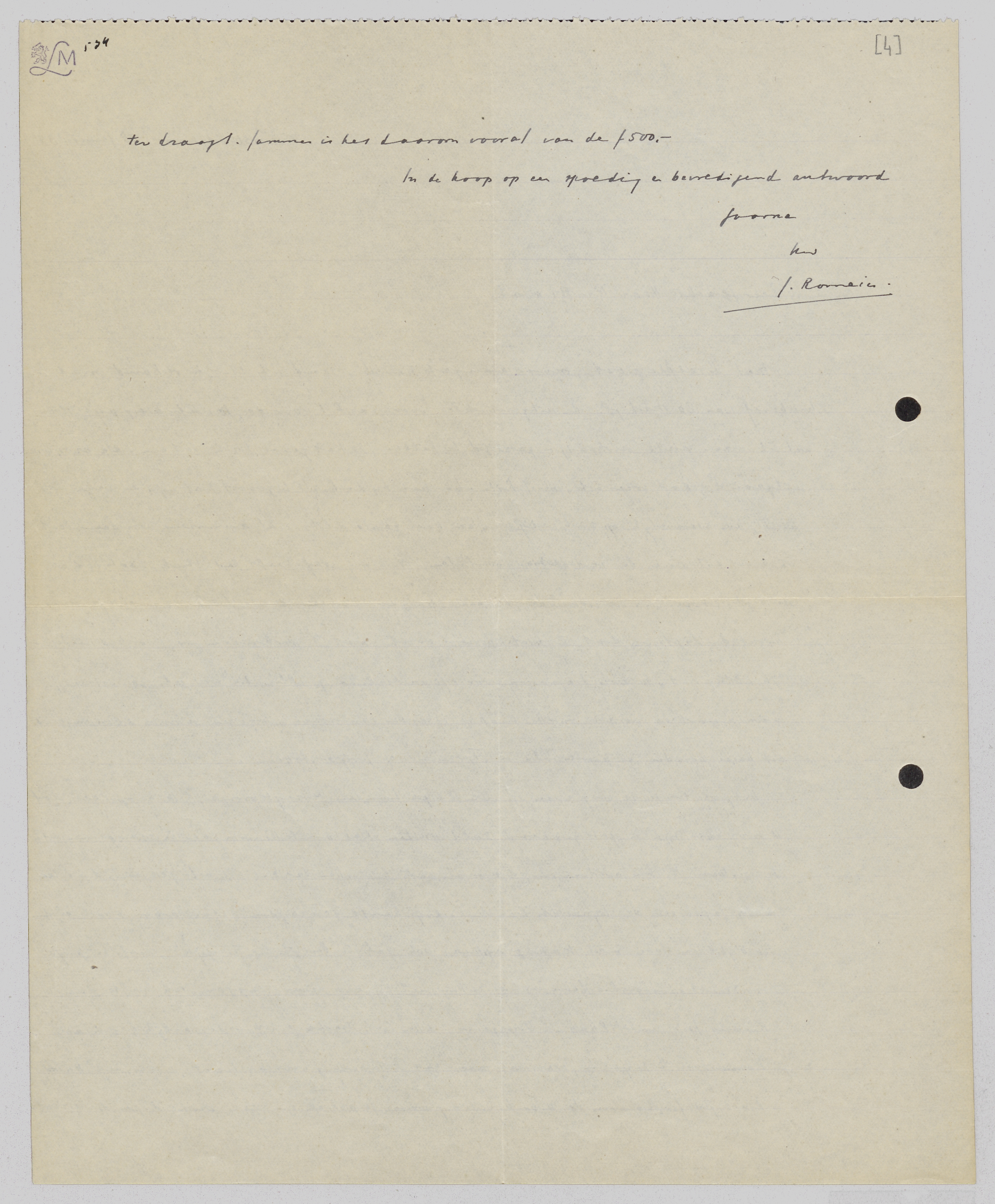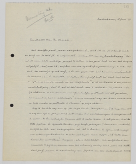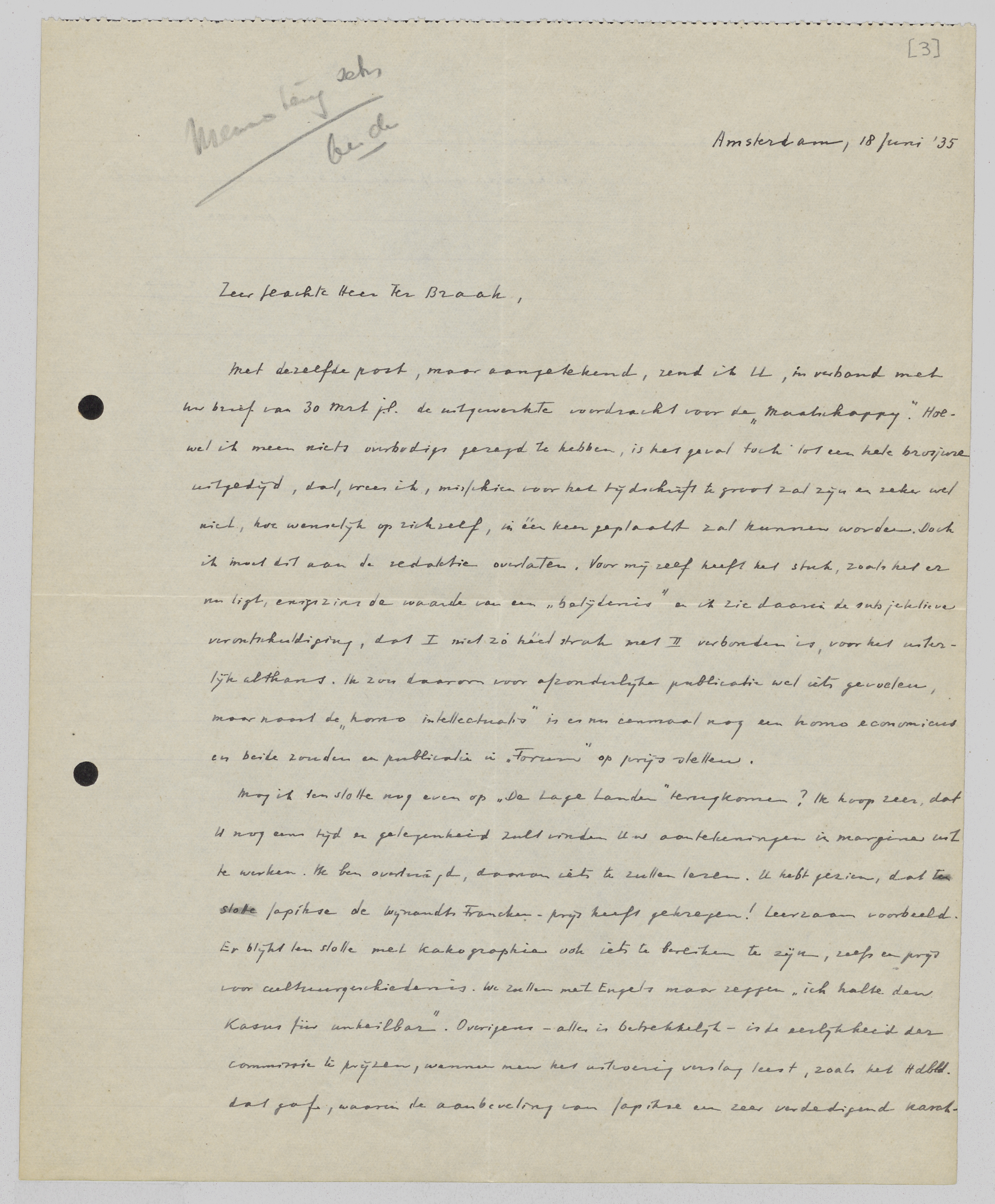 Met dezelfde post, maar aangeteekend, zend ik U, in verband met uw brief van 30 Mrt. j.l. de uitgewerkte voordracht voor de ‘Maatschappij’. Hoewel ik meen niets overbodigs gezegd te hebben, is het geval toch tot een hele brosjure uitgedijd, dat, vrees ik, misschien voor het tijdschrift te groot zal zijn en zeker wel niet, hoe wenselijk op zichzelf, in één keer geplaatst zal kunnen worden. Doch ik moet dit aan de redactie overlaten. Voor mij zelf heeft het stuk, zoals het er nu ligt, enigszins de waarde van een ‘belijdenis’ en ik zie daarin de subjectieve verontschuldiging, dat I niet zo héél strak met II verbonden is, voor het uiterlijk althans. Ik zou daarom voor afzonderlijke publicatie wel iets gevoelen, maar naast de ‘homo intellectualis’ is er nu eenmaal nog een homo economicus en beide zouden een publicatie in ‘Forum’ op prijs stellen.