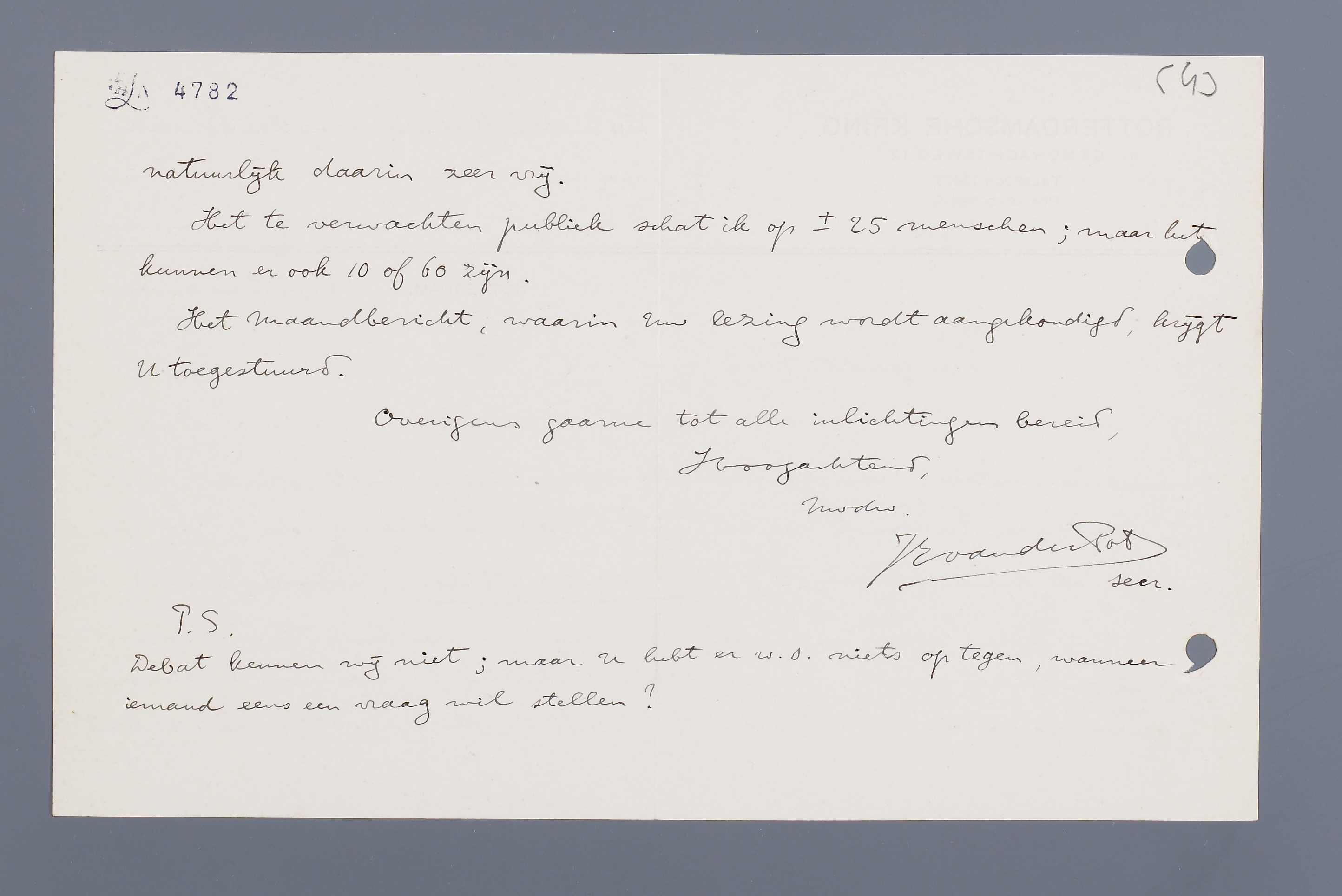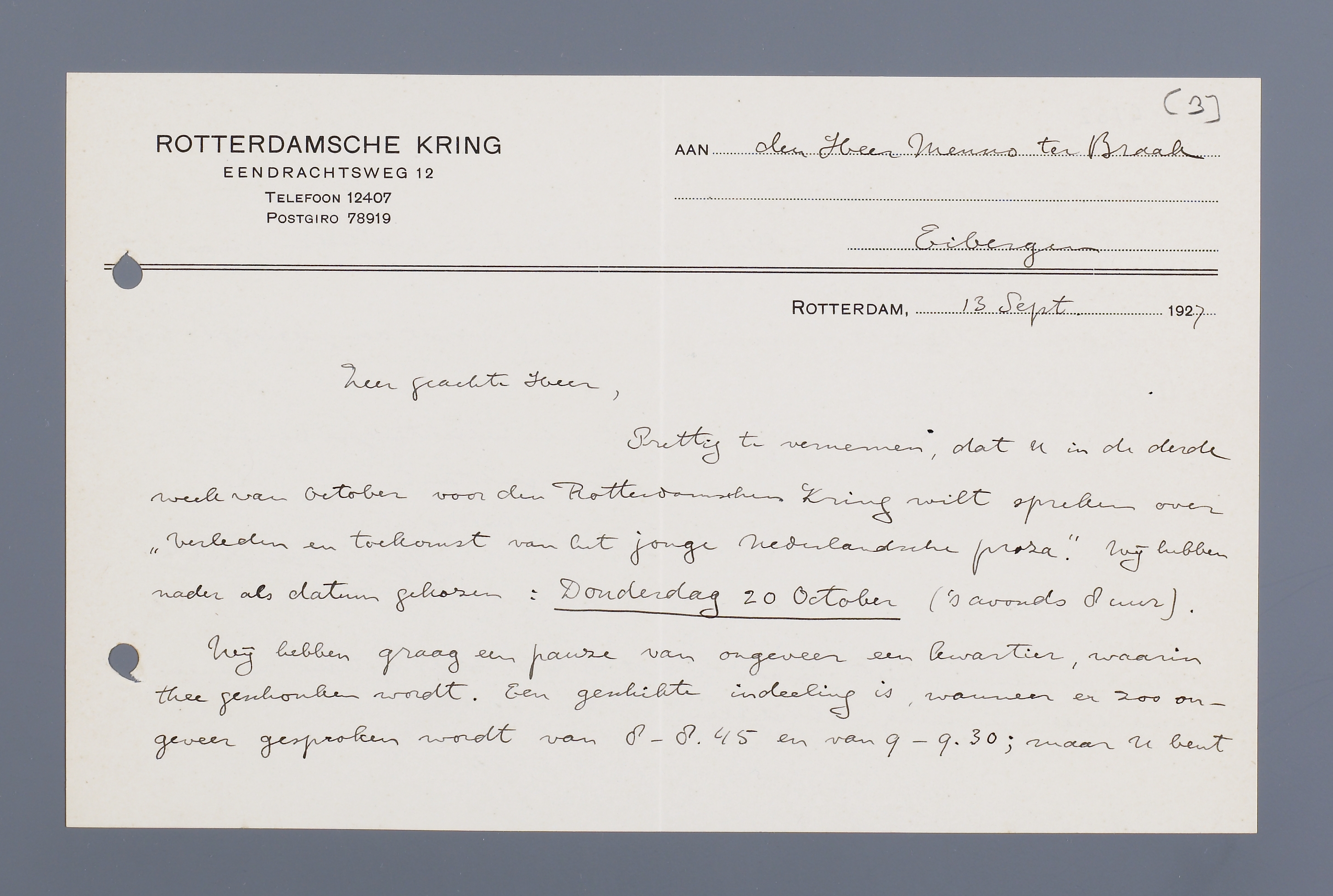 Prettig te vernemen, dat u in de derde week van October voor den Rotterdamschen Kring wilt spreken over ‘verleden en toekomst van het jonge Nederlandsche proza’. Wij hebben nader als datum gekozen: Donderdag 20 October ('s avonds 8 uur).