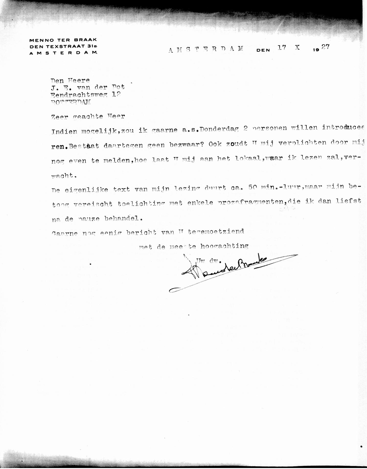 Indien mogelijk, zou ik gaarne a.s. Donderdag 2 personen willen introduceeren. Bestaat daartegen bezwaar? Ook zoudt U mij verplichten door mij nog even te melden, hoe laat U mij aan het lokaal, waar ik lezen zal, verwacht.