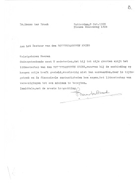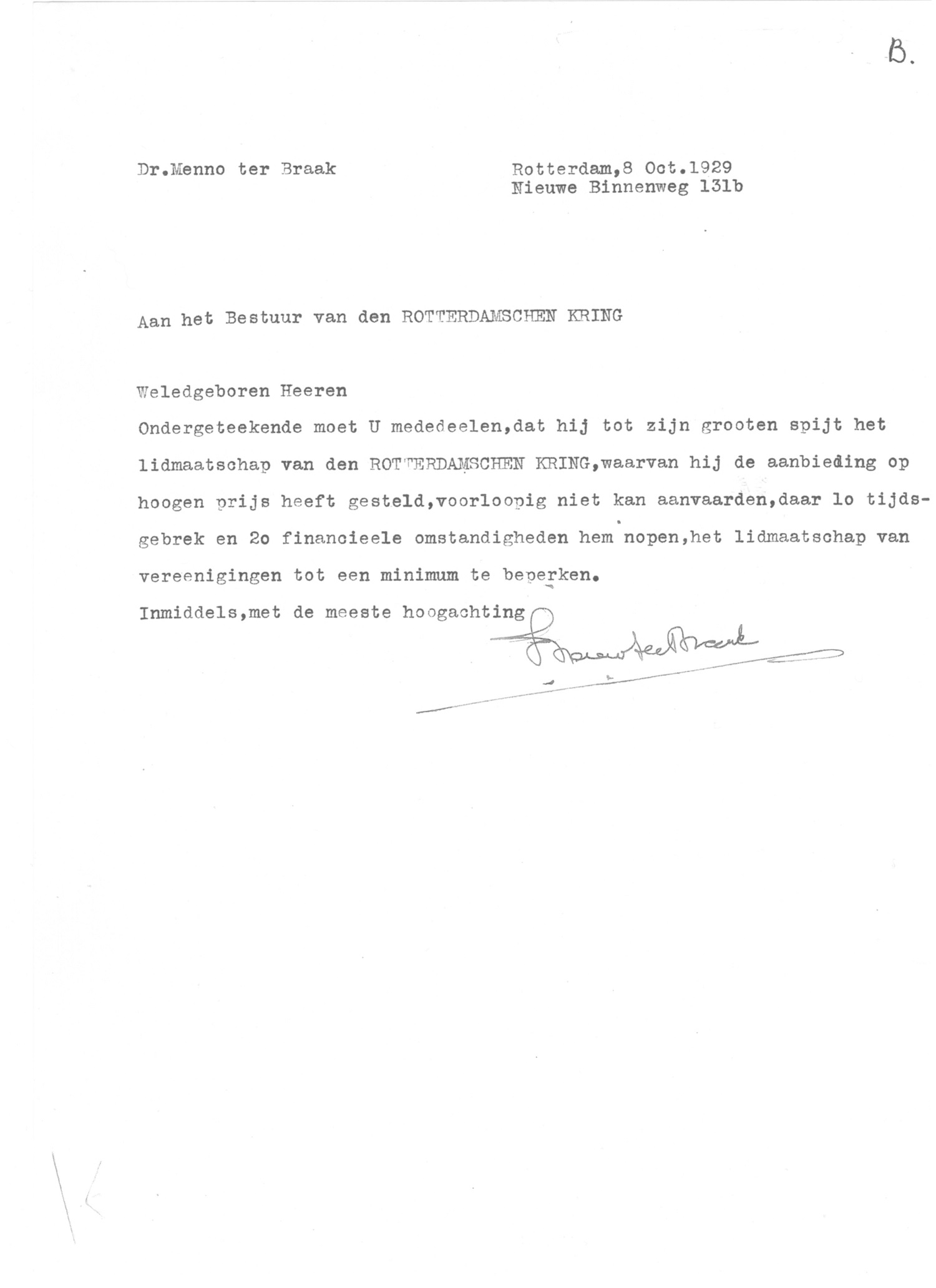 Ondergeteekende moet U mededeelen, dat hij tot zijn grooten spijt het lidmaatschap van de ROTTERDAMSCHEN KRING, waarvan hij den aanbieding op hoogen prijs heeft gesteld, voorloopig niet kan aanvaarden, daar 1e tijdsgebrek en 2e financieele omstandigheden hem nopen, het lidmaatschap van vereenigingen tot een minimum te beperken.