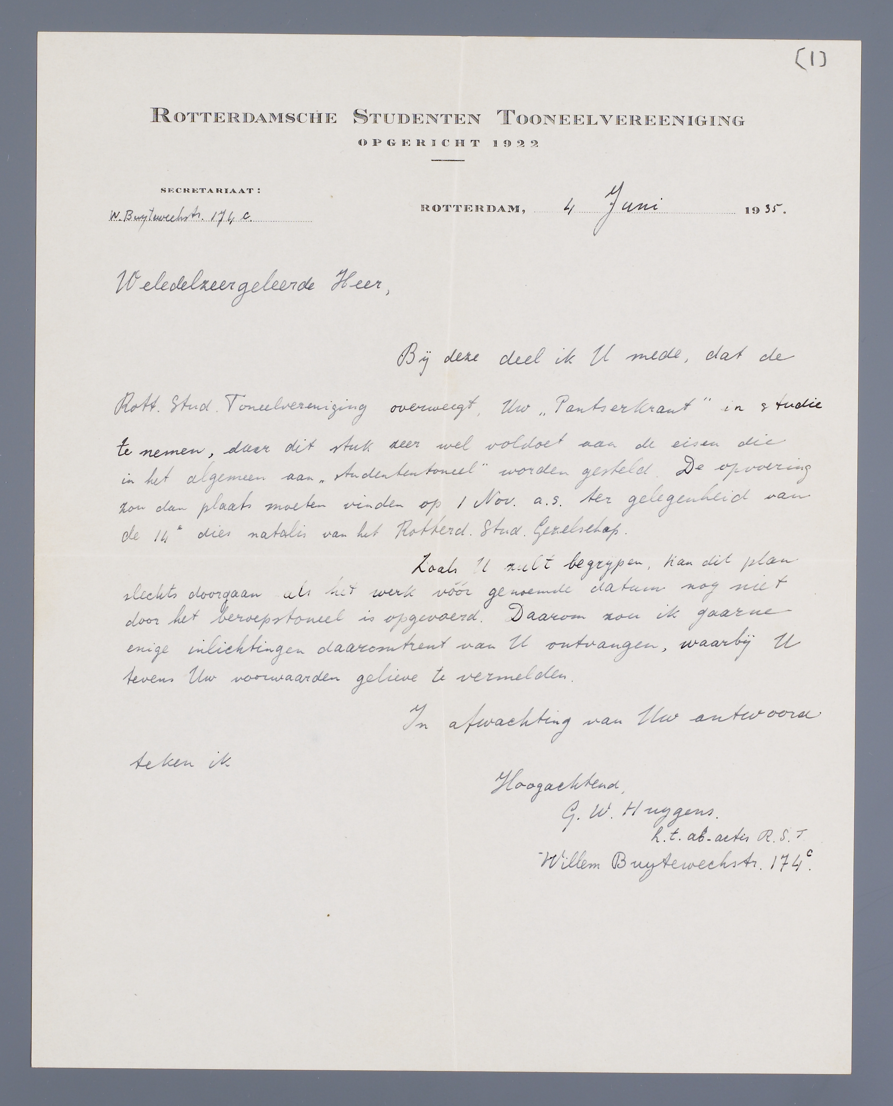 Bij deze deel ik U mede, dat de Rott. Stud. Toneelvereniging overweegt, Uw ‘Pantserkrant’ in studie te nemen, daar dit stuk zeer wel voldoet aan de eisen die in het algemeen aan ‘studententoneel’ worden gesteld. De opvoering zou dan plaats moeten vinden op 1 Nov. a.s. ter gelegenheid van de 14e dies natalis van het Rotterd. Stud. Gezelschap.