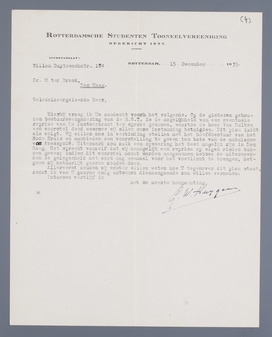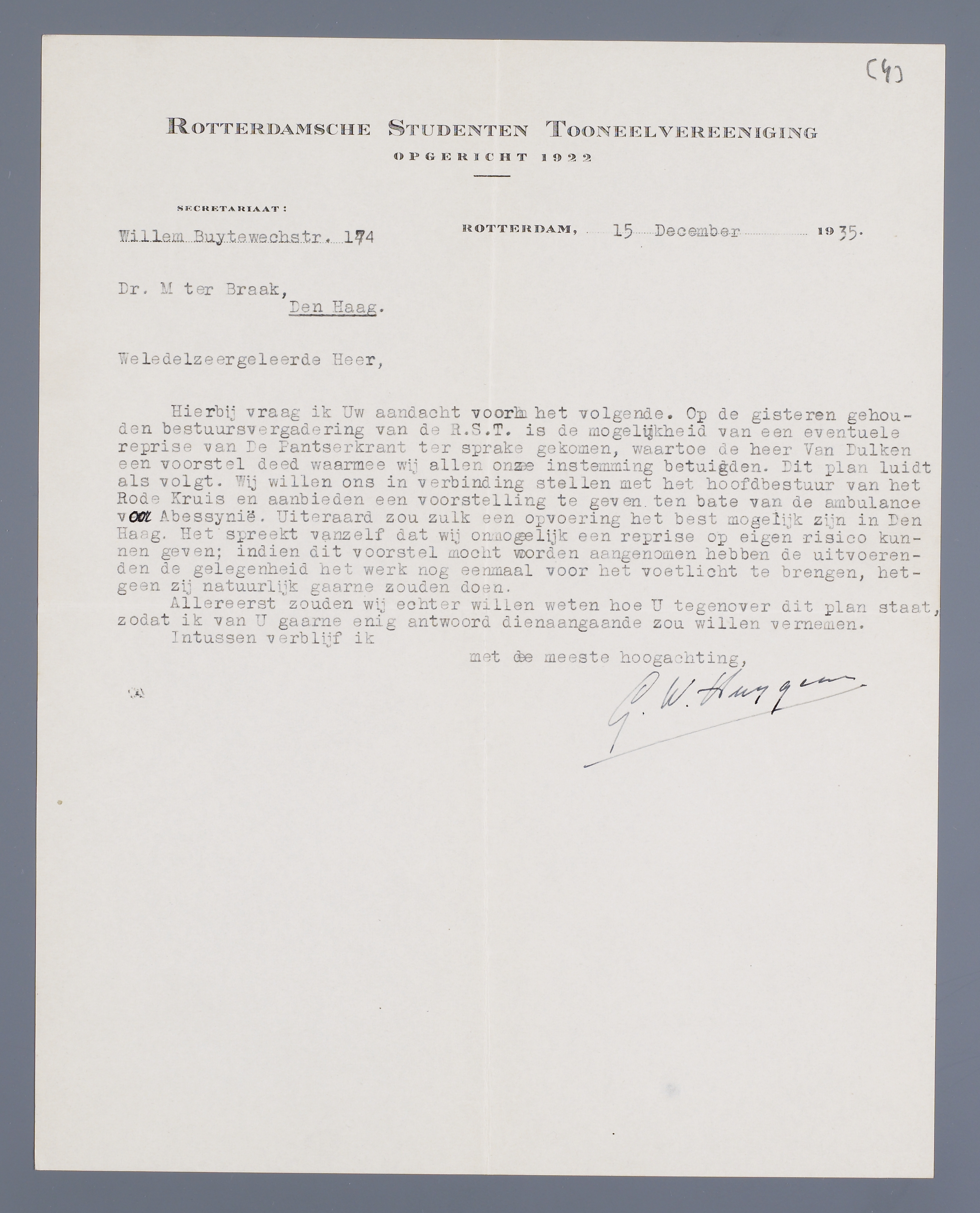 Hierbij vraag ik Uw aandacht voor het volgende. Op de gisteren gehouden bestuursvergadering van de R.S.T. is de mogelijkheid van een eventuele reprise van De Pantserkrant ter sprake gekomen, waartoe de heer Van Dulken een voorstel deed waarmee wij allen onze instemming betuigden. Dit plan luidt als volgt. Wij willen ons in verbinding stellen met het hoofdbestuur van het Rode Kruis en aanbieden een voorstelling te geven ten bate van de ambulance voor Abessynië. Uiteraard zou zulk een opvoering het best mogelijk zijn in Den Haag. Het spreekt vanzelf dat wij onmogelijk een reprise op eigen risico kunnen geven; indien dit voorstel mocht worden aangenomen hebben de uitvoerenden de gelegenheid het werk nog eenmaal voor het voetlicht te brengen, hetgeen zij natuurlijk gaarne zouden doen.