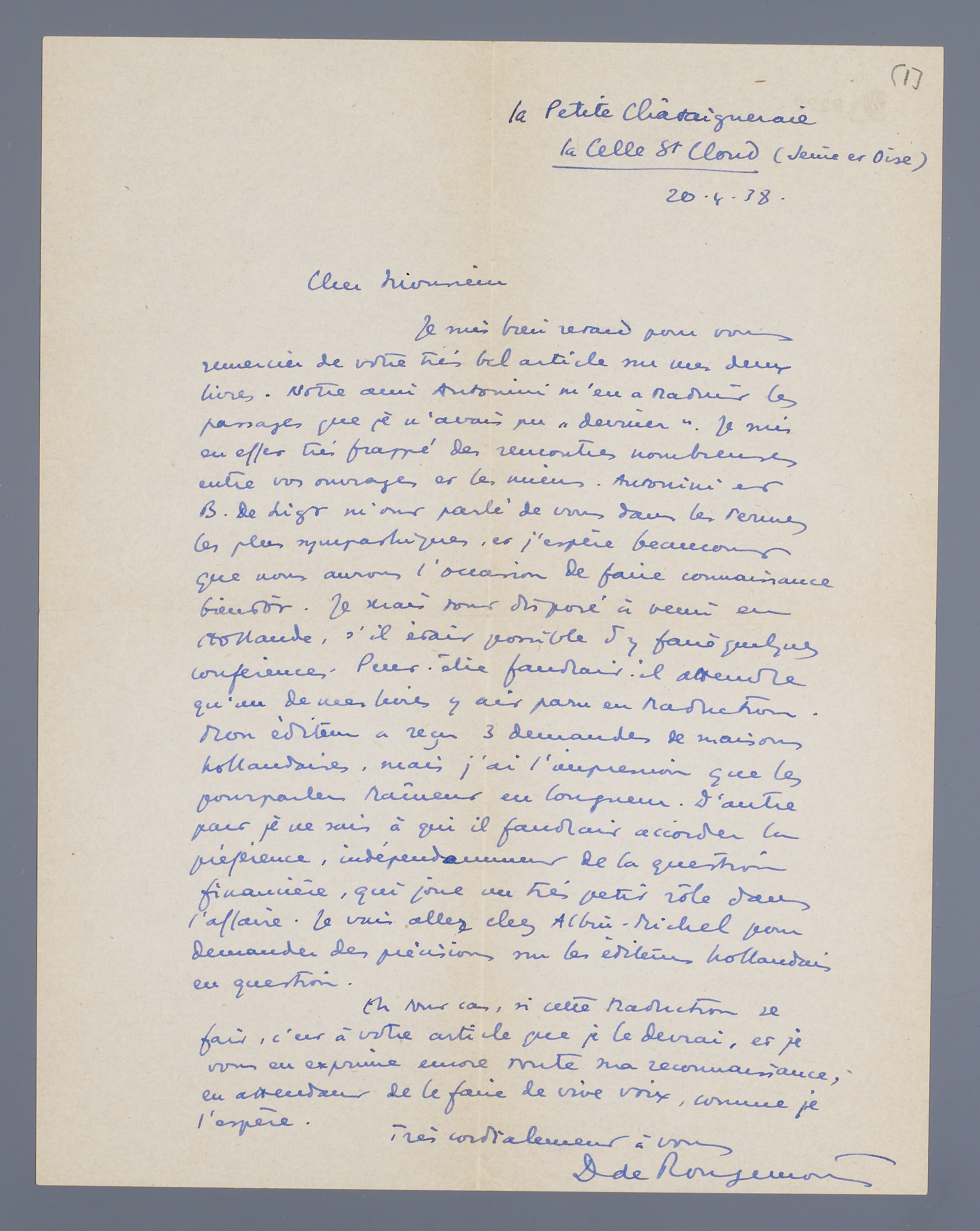 Je suis bien retard pour vous remercier de votre très bel article sur mes deux livres. Notre ami Antonini m'en a traduit les passages que je n'avais pu ‘deviner’. Je suis en effet très frappé des rencontres nombreuses entre vos ouvrages et les miens. Antonini et B. De Ligt m'ont parlé de vous dans les termes les plus sympathiques, et j'espère beaucoup que nous aurons l'occasion de faire connaissance bientôt. Je serais tout disposé à venir en Hollande, s'il était possible d'y faire quelques conférences. Peut-être faudrait-il attendre qu'un de mes livres y ait paru en traduction. Mon éditeur a reçu 3 demandes de maisons hollandaises, mais j'ai l'impression que les pourparlers traînent en longeur. D'autre part je ne sais à qui il faudrait accorder la préférence, indépendamment de la question financière, qui joue un très petit rôle dans l'affaire. Je vais aller chez Albin-Michel pour demander des précisions sur les éditeurs hollandais en question.