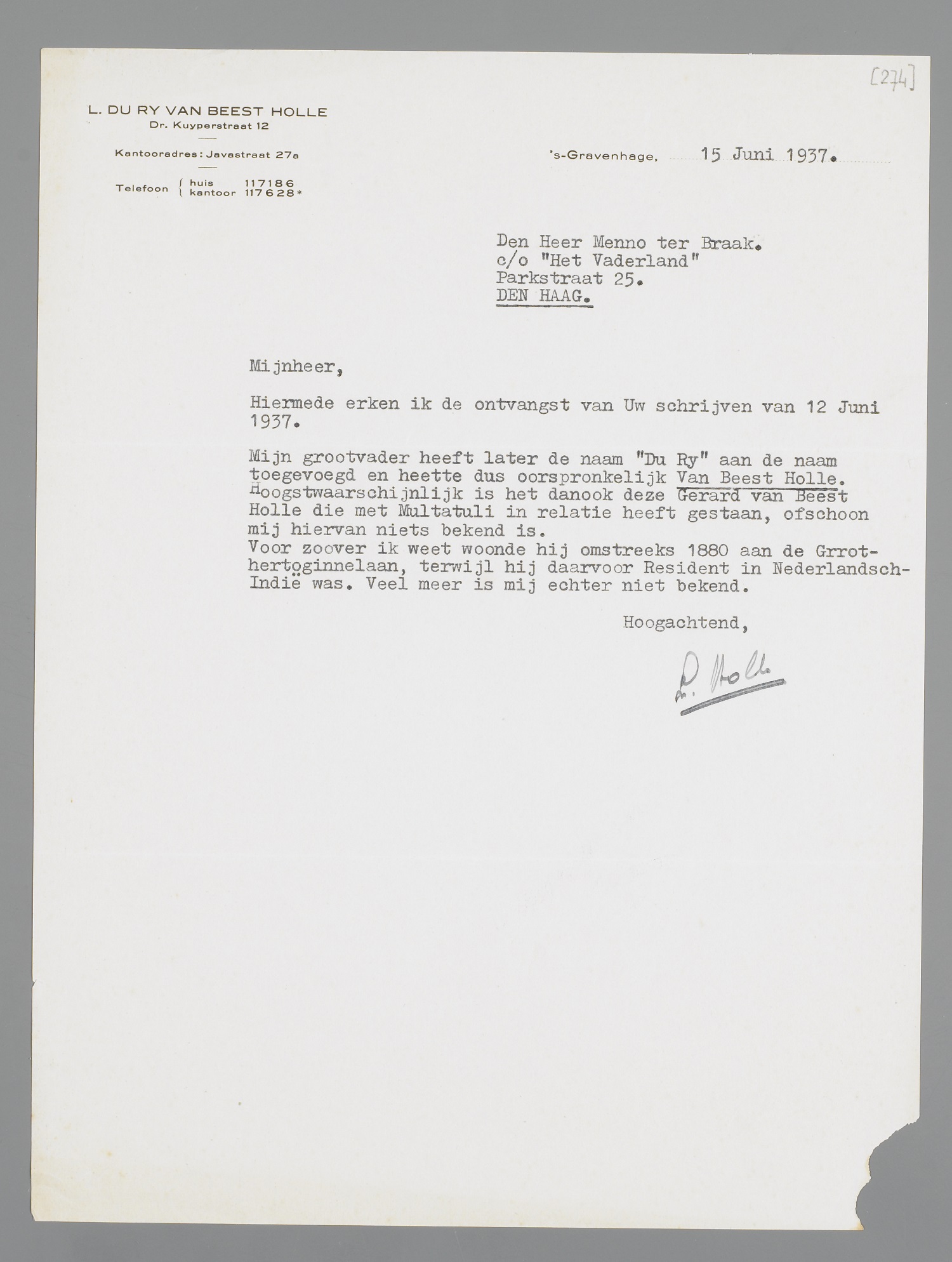 Mijn grootvader heeft later de naam ‘Du Ry’ aan de naam toegevoegd en heette dus oorspronkelijk Van Beest Holle. Hoogstwaarschijnlijk is het danook deze Gerard van Beest Holle die met Multatuli in relatie heeft gestaan, ofschoon mij hiervan niets bekend is.