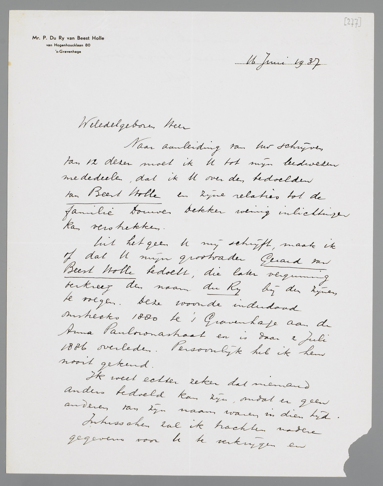 Uit hetgeen U mij schrijft, maak ik op dat U mijn grootvader Gerard van Beest Holle bedoelt, die later vergunning verkreeg den naam du Ry bij den zijnen te voegen. Deze woonde inderdaad omstreeks 1880 te 's-Gravenhage aan de Anna Pavlovonastraat[?] en is daar 2 Juli 1886 overleden. Persoonlijk heb ik hem nooit gekend.