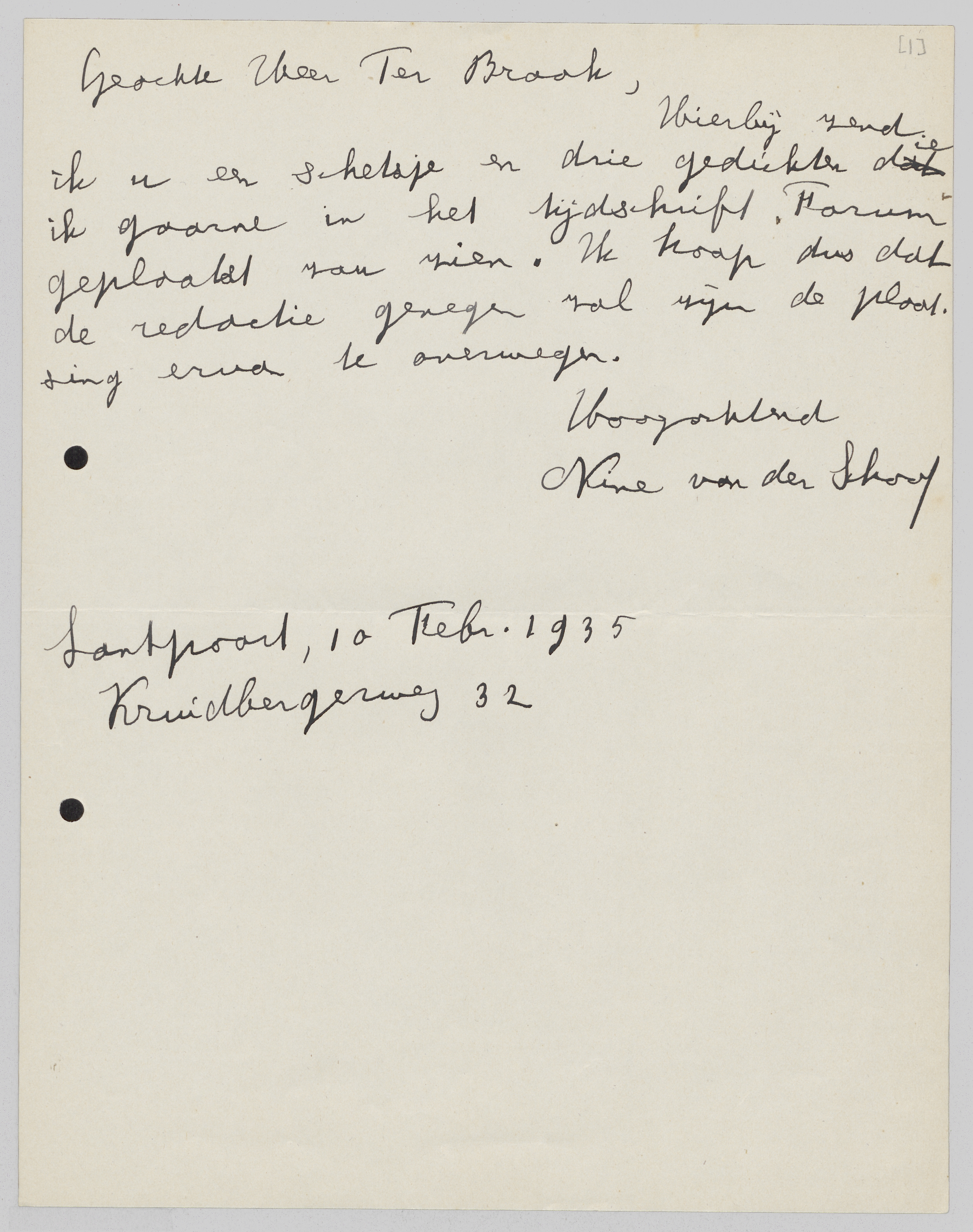 Hierbij zend ik u een schetsje en drie gedichten die ik gaarne in het tijdschrift Forum geplaatst zou zien. Ik hoop dus dat de redactie genegen zal zijn de plaatsing ervan te overwegen.