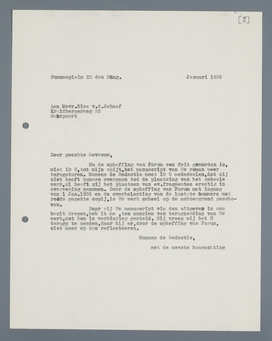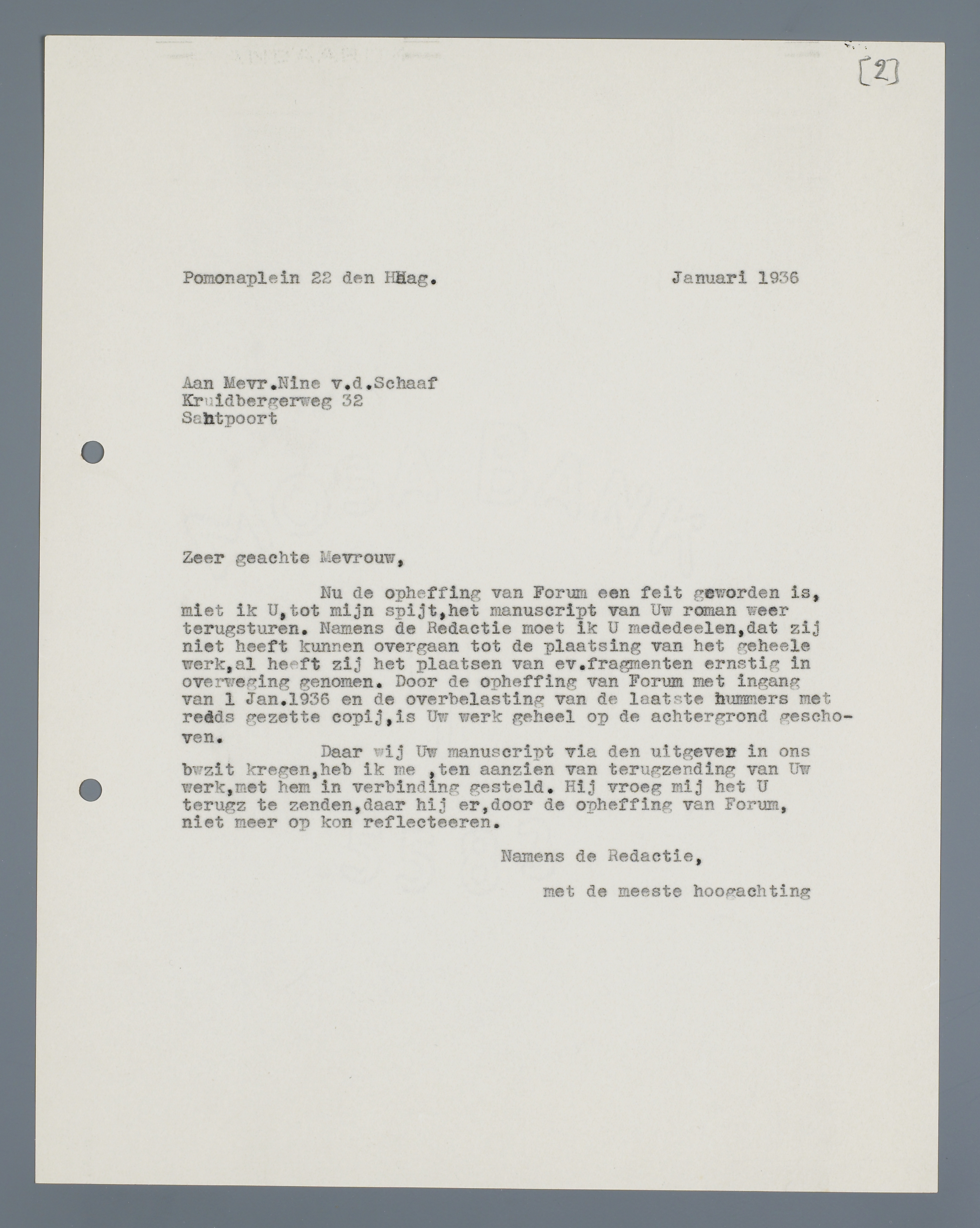 Nu de opheffing van Forum een feit geworden is, moet ik U, tot mijn spijt, het manuscript van Uw roman weer terugsturen. Namens de Redactie moet ik U mededeelen, dat zij niet heeft kunnen overgaan tot de plaatsing van het geheele werk, al heeft zij het plaatsen van ev. fragmenten ernstig in overweging genomen. Door de opheffing van Forum met ingang van 1 Jan. 1936 en de overbelasting van de laatste nummers met reeds gezette copij, is Uw werk geheel op de achtergrond geschoven.