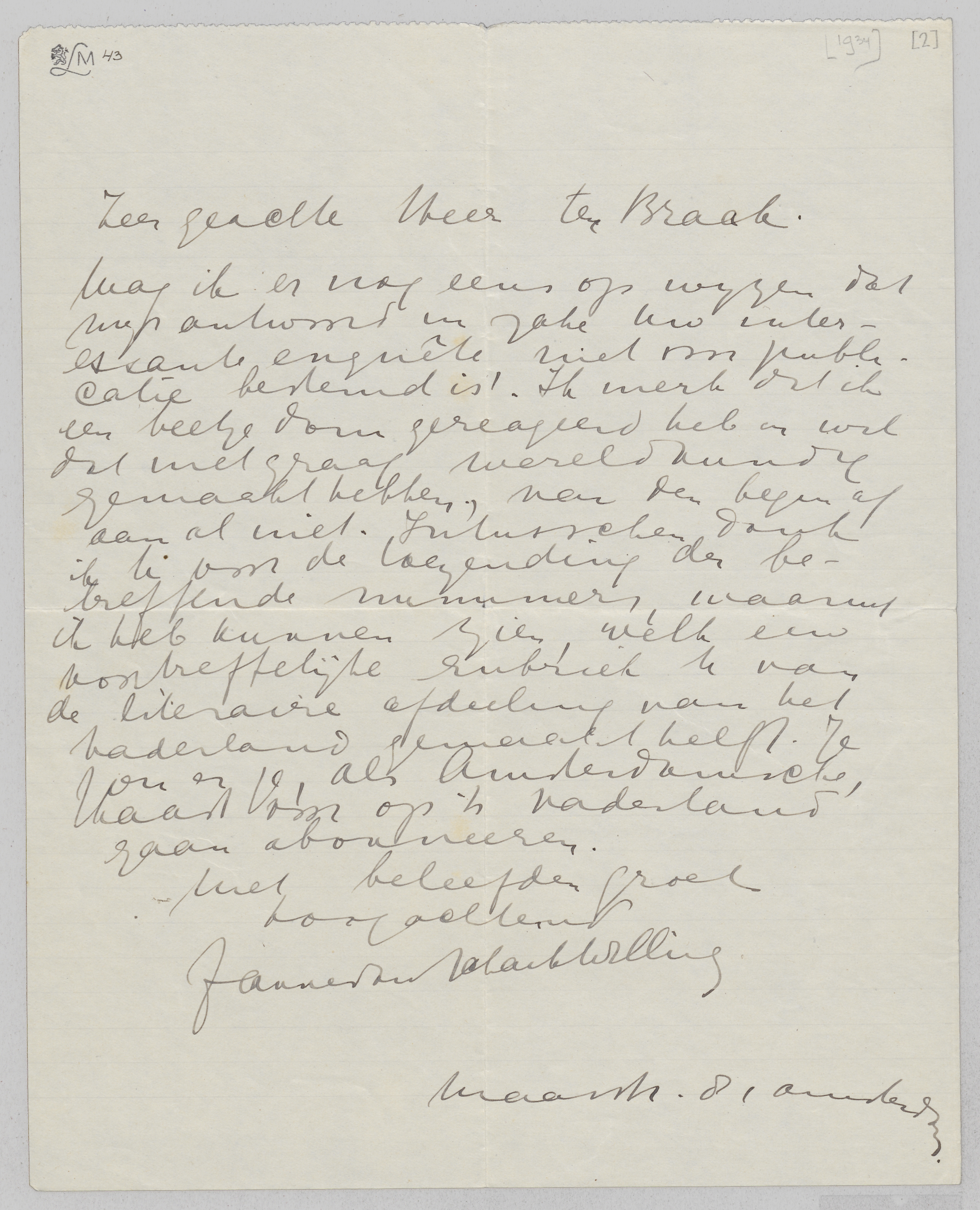 Mag ik er nog eens op wijzen dat mijn antwoord in zake uw interessante enquête niet voor publicatie bestemd is! Ik merk dat ik een beetje dom gereageerd heb en wil dat niet graag wereldkundig gemaakt hebben, van den begin af aan al niet. Intusschen dank ik U voor de toezending der betreffende nummers waaruit ik heb kunnen zien, welk een voortreffelijke rubriek U van de literaire afdeeling van het Vaderland gemaakt heeft. Ik zou me er, als Amsterdamsche, haast voor op 't Vaderland gaan abonneeren.