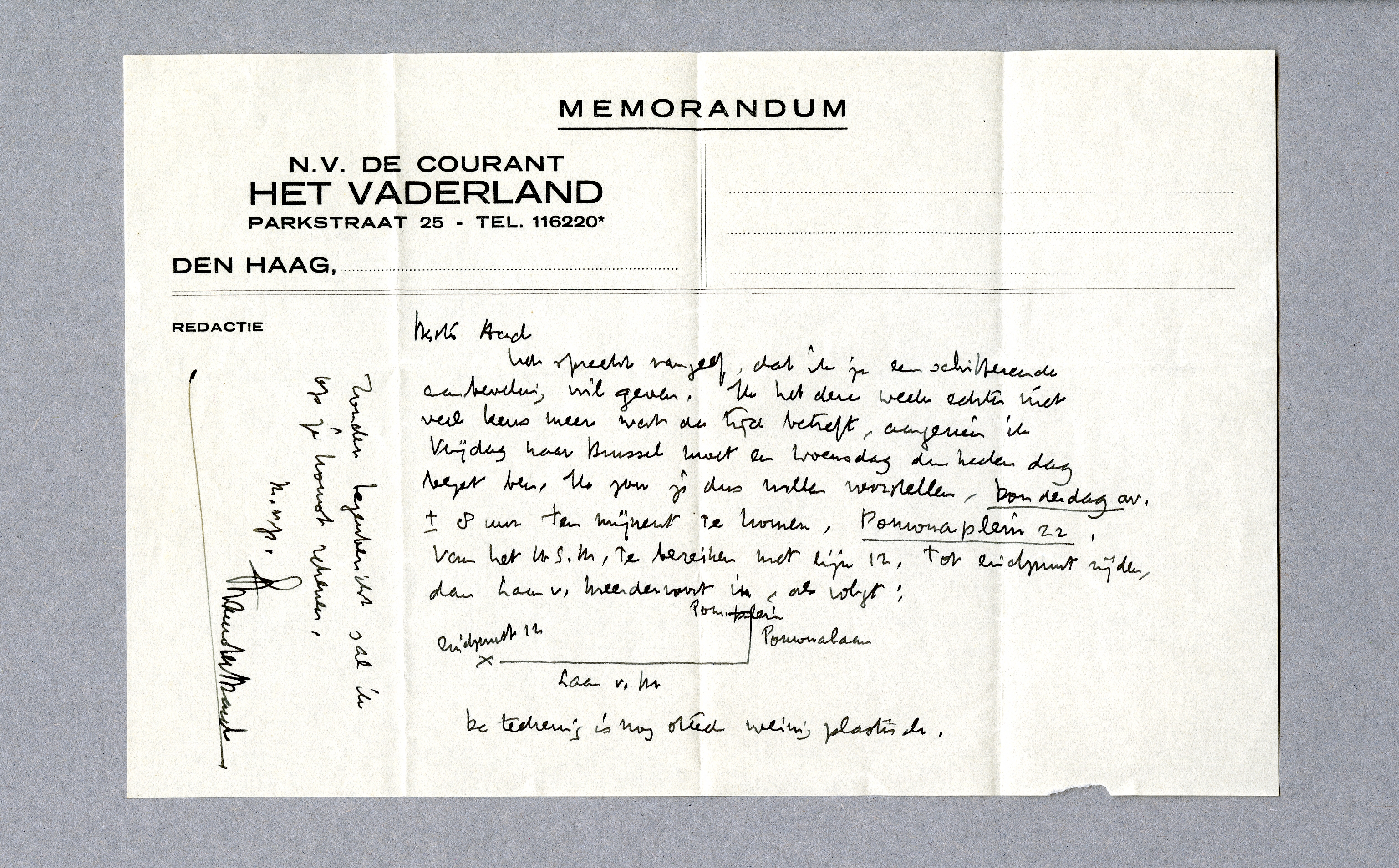 het spreekt vanzelf, dat ik je een schitterende aanbeveling wil geven. Ik heb deze week echter niet veel keus meer wat de tijd betreft, aangezien ik Vrijdag naar Brussel moet en Woensdag den heelen dag bezet ben. Ik zou je dus willen voorstellen, Donderdag av. ± 8 uur ten mijnent te komen, Pomonaplein 22. Van het H.S.M. te bereiken met lijn 12. Tot eindpunt rijden, dan Laan v. Meerdervoort in als volgt: