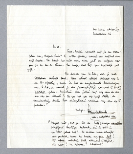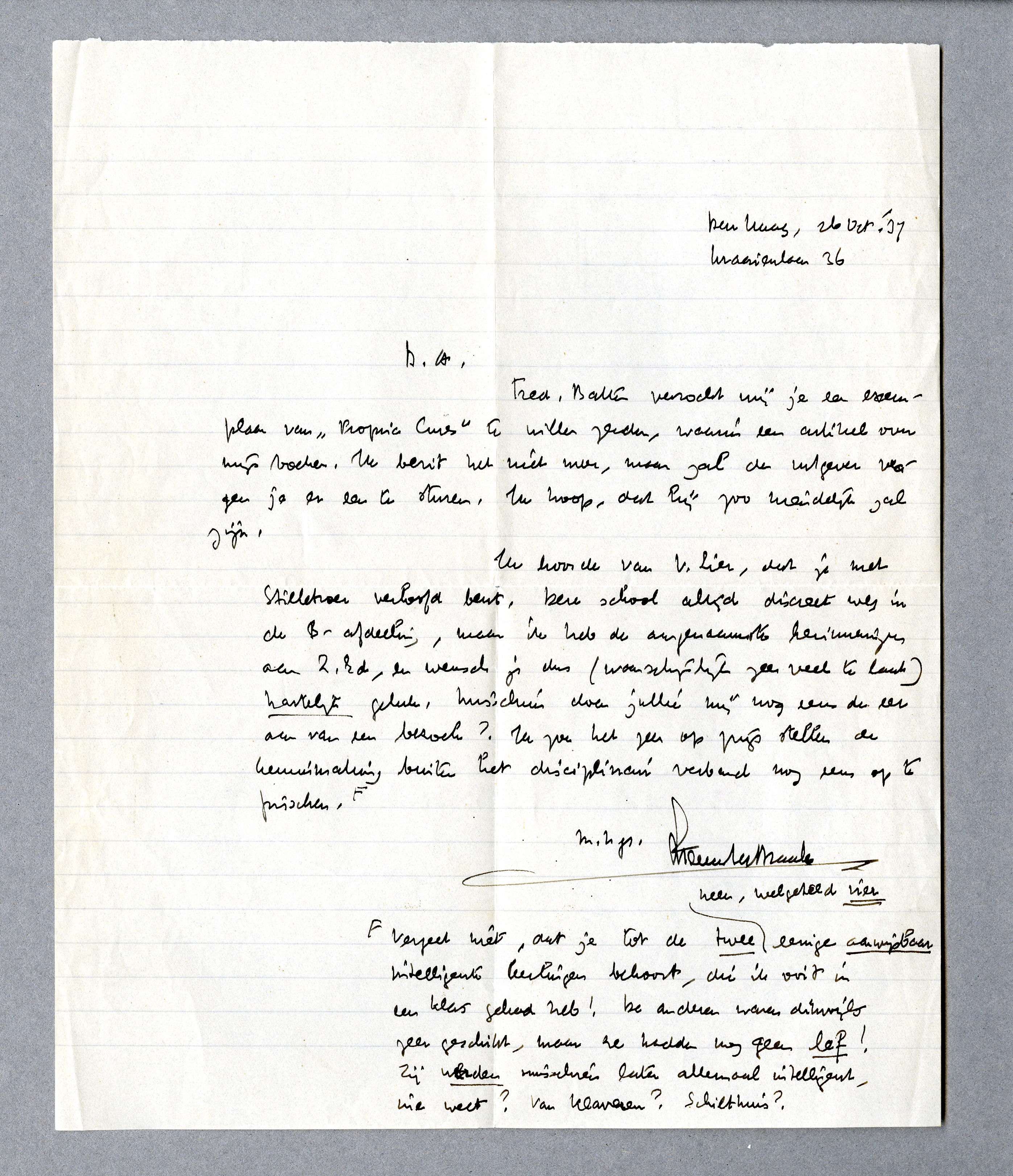 Ik hoorde van v. Lier, dat je met Stilleboer verloofd bent. Deze school altijd direct weg in de B-afdeeling, maar ik heb de aangenaamste herinneringen aan Z.Ed., en wensch je dus (waarschijnlijk zeer veel te laat) hartelijk geluk. Misschien doen jullie mij nog eens de eer aan van een bezoek? Ik zou het zeer op prijs stellen de kennismaking buiten het disciplinair verband nog eens op te frisschen.*