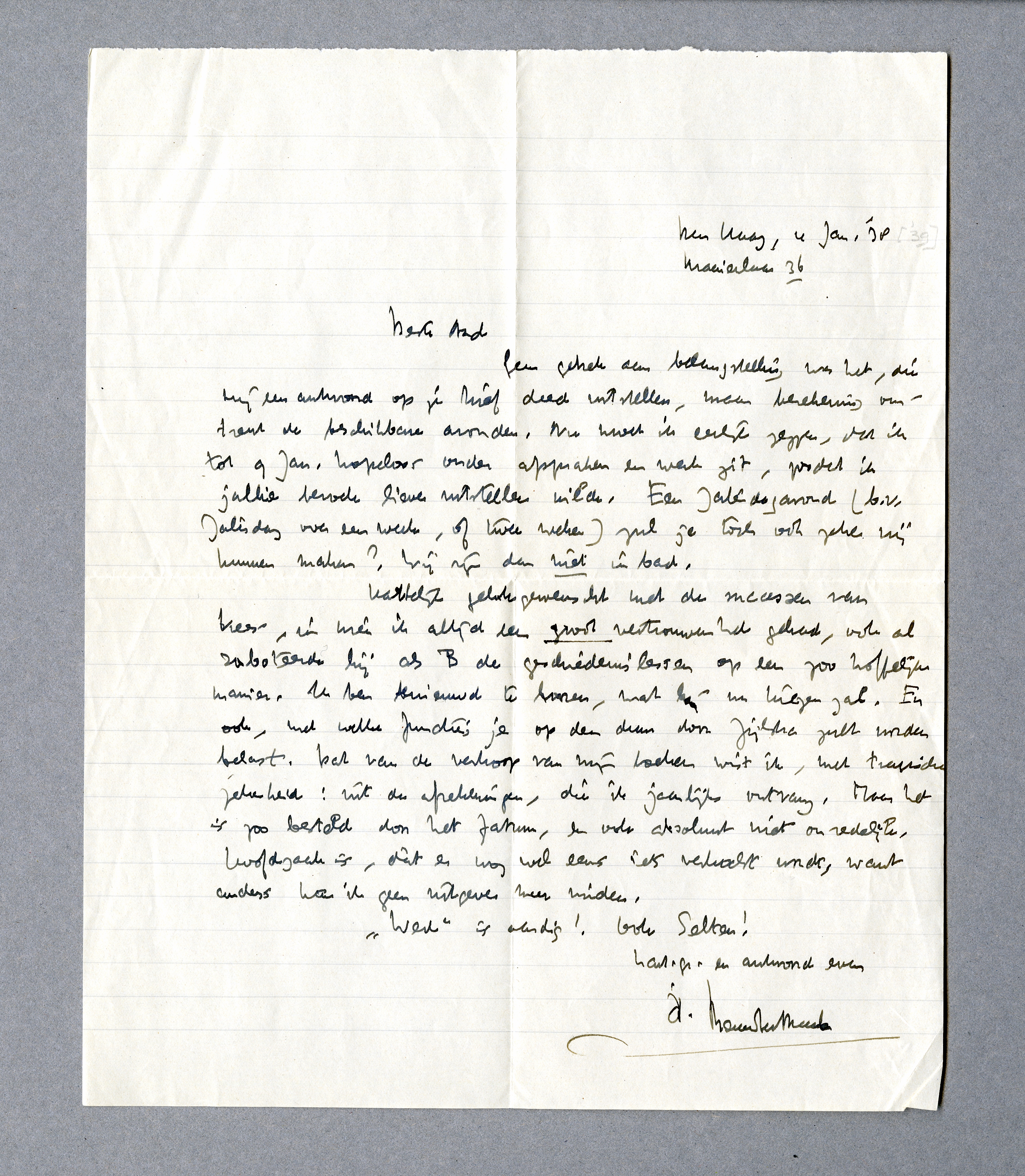 Geen gebrek aan belangstelling was het, die mij een antwoord op je brief deed uitstellen, maar [berekening] omtrent de beschikbare avonden. Nu moet ik eerlijk zeggen, dat ik tot 9 Jan. hopeloos onder afspraken en werk zit, zoodat ik jullie bezoek liever uitstellen wilde. Een Zaterdagavond (b.v. Zaterdag over een week, of twee weken) zul je toch ook zeker vrij kunnen maken? Wij zijn dan niet in bad.