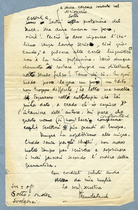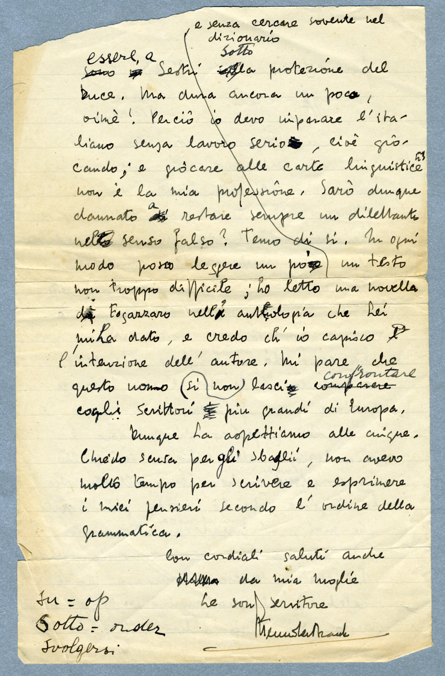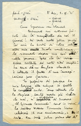 Io preferisco di prendere la mia lezione alle cinque se quello Le convenga anche. Temo soltanto che la stagione, benchè morta pui vivente che mai, m'impedisca di tradurre ‘Il Giornale Corazzato’ come io vorrei. Lo scrittore tedesco Tommaso Uomo celebrerà il suo anniversario, e il resto. Non sarò salvo prima di essere a Sestri sotto la protezione del Duce. Ma dura ancora un poco, oimè! Perciò io devo imparare l'italiano senza lavoro serio, cioè giocando; e giocare alle carte linguistiche non è la mia professione. Sarò dunque dannato a restare sempre un dilettante nel senso falso? Temo di si. In ogni modo posso leggere un po' e senza cercare sovente nel dizionario un testo non troppo difficile; ho letto una novella di Fogazzaro nell' antologia che Lei mi ha dato, e credo ch' io capisco l'intenzione dell' autore. Mi pare che questo uomo non si lasci confrontare cogli scrittori piu grandi di Europa.