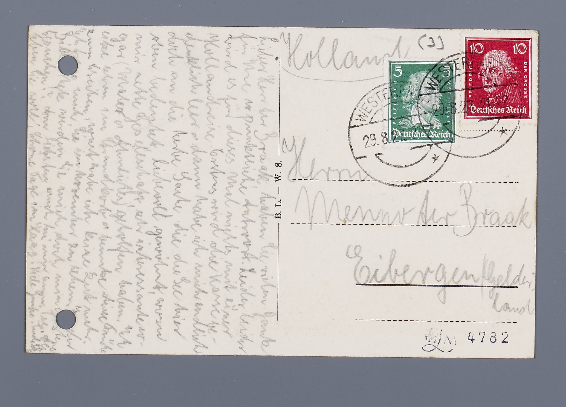 haben Sie vielen Dank für Ihre so pünktliche antwort. Leider, leider wird es für dieses mal nichts mit einer Hollandreise. Erstens wird die Kasse bedenklich leer und dann habe ich mich endlich doch an die herbe Sache die die See hier oben bedeutet liebevoll gewöhnt, wozu mir nette Gesellschaft, sehr interessante sogar (Maler und Ähnliches) geholfen haben. Ich sitze schon im Strandkorb und benutze diese Frühe zum Schreiben, sonst habe ich keine Zeit mehr. Ich freue mich, Sie im November zu sehen. In der Bibliothek werden Sie mich doch mindestens besuchen!? Am liebsten auch bei mir [drie woorden onleesbaar].