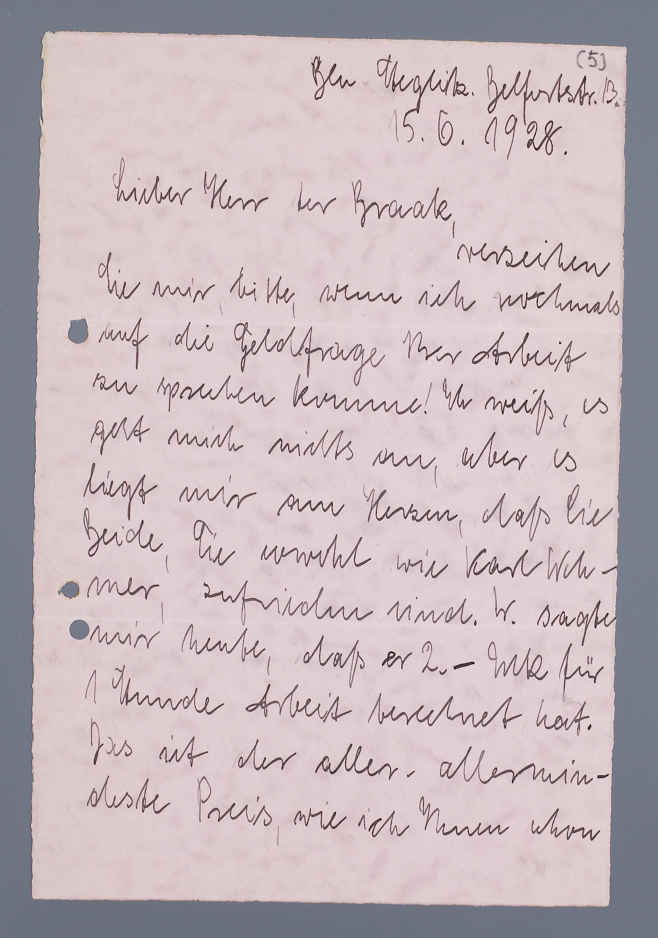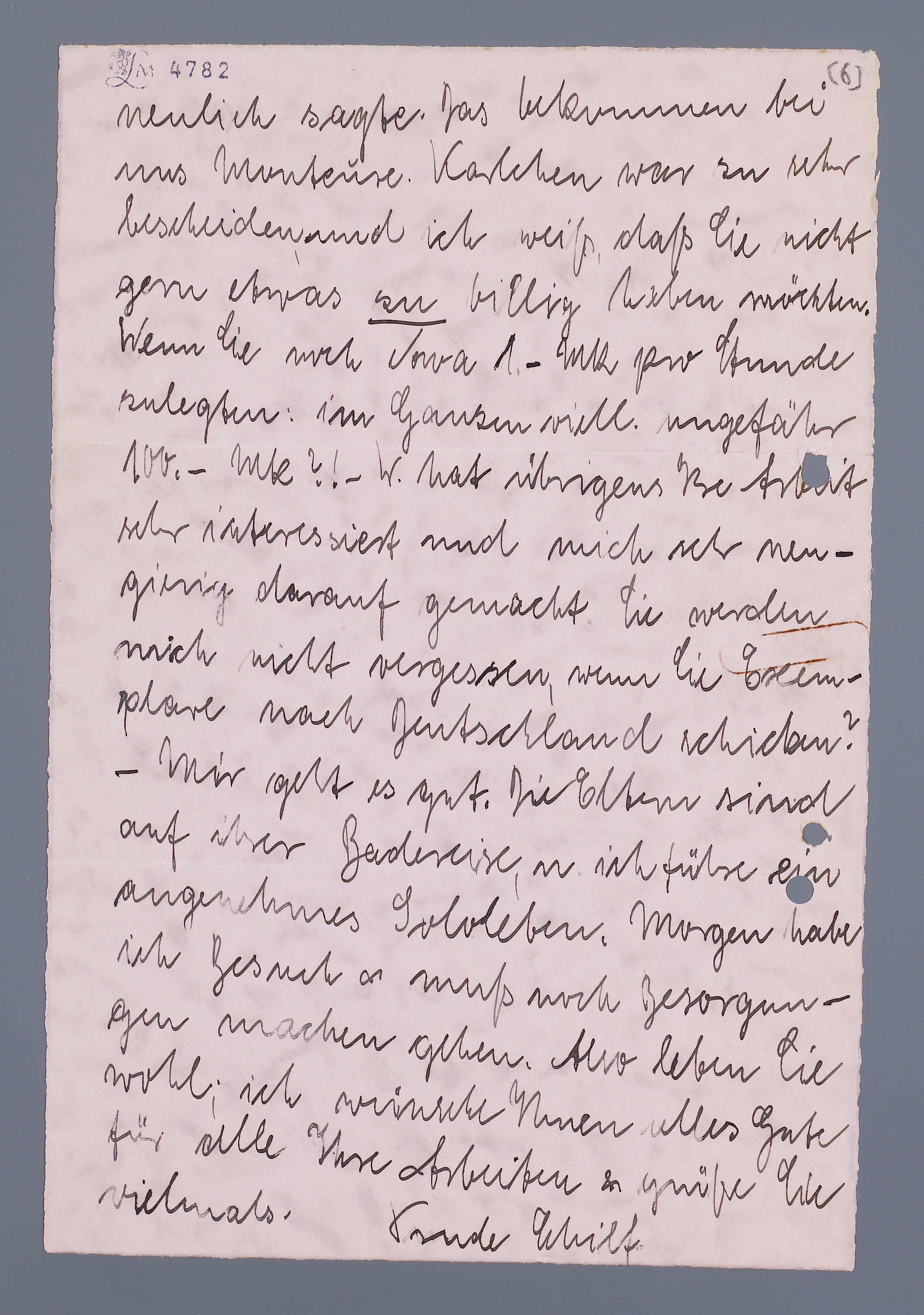 Verzeihen Sie mir, bitte, wenn ich nochmals auf die Geldfrage der Arbeit zu sprechen komme! Ich weiß, es geht mich nichts an, aber es liegt mir am Herzen, daß Sie Beide, Sie sowohl wie Karl Wehmer, zufrieden sind. W. sagte mir heute, daß er 2,- MK für 1 Stunde Arbeit berechnet hat. Das ist der aller- allermindeste Preis, wie ich Ihnen schon neulich sagte. Das bekommen bei uns Monteure. Karlchen war zu sehr bescheiden, und ich weiß, daß Sie nicht gern etwas zu billig haben möchten. Wenn Sie noch etwa 1,- MK pro Stunde zulegten: im Ganzen viell. ungefähr 100,- MK?! - W. hat übrigens Ihre Arbeit sehr interessiert und mich sehr neugierig darauf gemacht. Sie werden mich nicht vergessen, wenn Sie Exemplare nach Deutschland schicken?