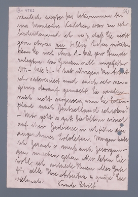 - Mir geht es gut. Die Eltern sind auf ihrer Badereise, u. ich führe ein angenehmes Sololeben. Morgen habe ich Besuch und muß noch Besorgungen machen gehen. Also leben sie wohl; ich wünsche Ihnen alles Gute für alle Ihre Arbeiten & grüße Sie vielmals,