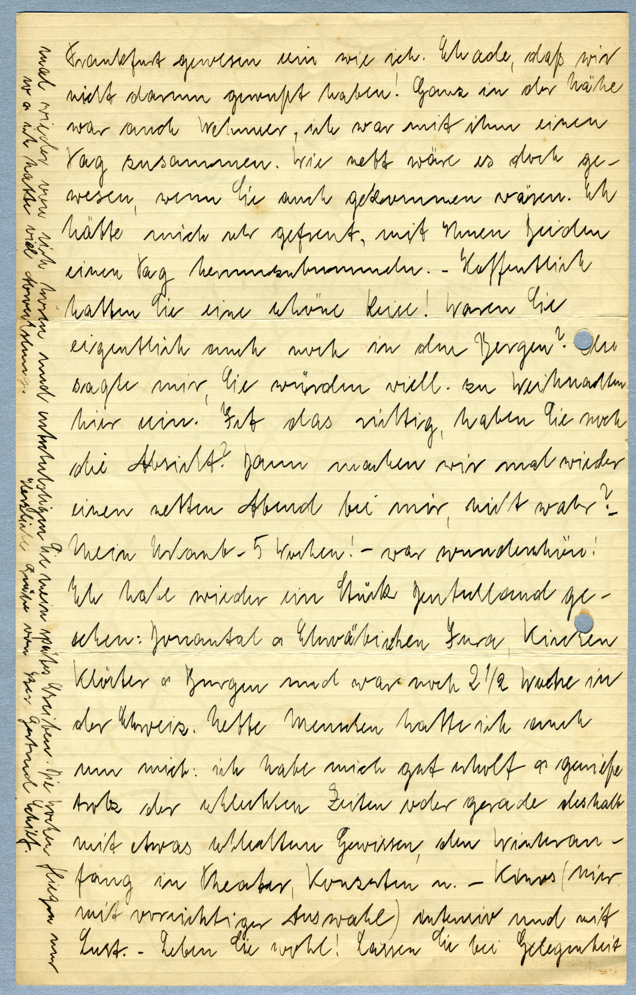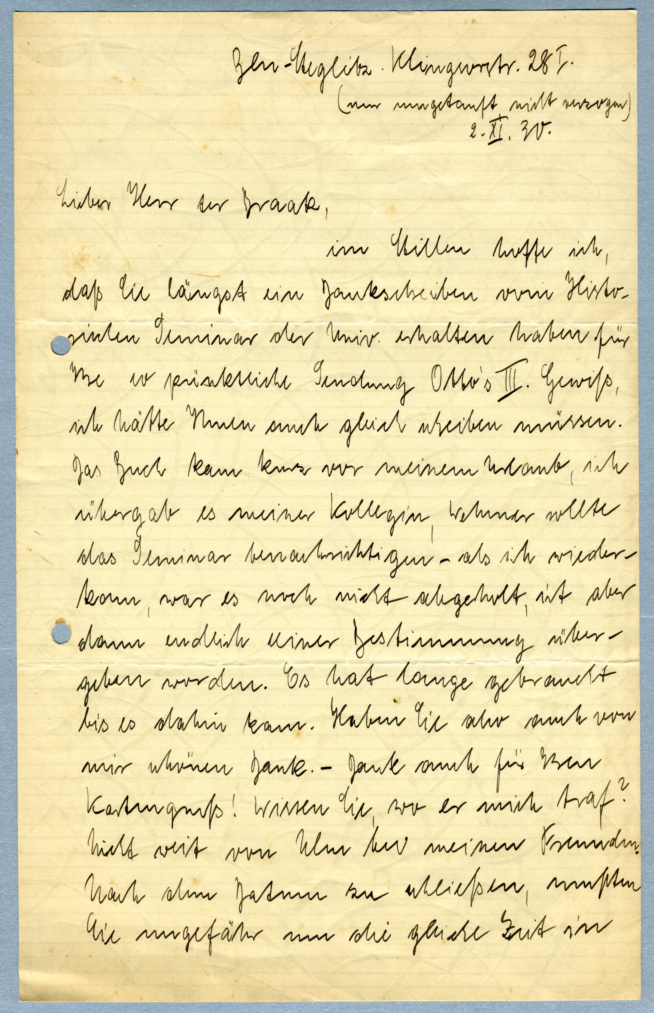 Im Stillen hoffe ich, dass Sie längst ein Dankschreiben vom Historischen Seminar der Univ. erhalten haben für Ihr so pünktliche Sendung Otto's III. Gewiss, ich hätte Ihnen auch gleich schreiben müssen. Das Buch kam kurz vor meinem Urlaub, ich übergab es meiner Kollegin, Wehmer sollte das Seminar benachrichtigen - als ich wiederkam, war es noch nicht abgeholt, ist aber dan endlich seiner Bestimmung übergeben worden. Es hat lange gebraucht bis es dahin kam. Haben Sie also auch von mir schönen Dank.- Dank auch für Ihnen Kartengruss! Wissen Sie, wo er mich traf? Nicht weit von Ulm bei meinen Freunden. Nach dem Datum zu schliessen, mussten Sie ungefähr um die gleiche Zeit in Frankfurt gewesen sein wie ich. Schade, dass wir nicht davon gewusst haben! Ganz in der Nähe war auch Wehmer, ich war mit ihm einen Tag zusammen. Wie nett wäre es doch gewesen, wenn Sie auch gekommen wären. Ich hätte mich sehr gefreut, mit Ihnen beiden einen Tag herumzubummeln.- Hoffentlich hatten Sie eine schöne Reise! Waren Sie eigentlich auch noch in den Bergen? Else sagte mir, Sie würden viell. zu Weihnachten hier sein. Ist das richtig, haben Sie noch die Absicht? Dann machen wir wieder einen netten Abend bei mir, nicht wahr? Mein Urlaub - 5 Wochen! - war wunderschön! Ich habe wieder ein Stück Deutschland gesehen: Donautal und Schwäbischen Jura, Kirchen, Klöster und Burgen und war noch 2 ½ Woche in der Schweiz. Nette Menschen hatte ich auch um mich: ich habe mich gut erholt und geniesse trotz der slechten Zeiten oder gerade deshalb mit etwas slechtem Gewissen, den Winteranfang in Theater, Konzerten u. -- Kinos (hier mit vorsichtiger Auswahl) intensiv und mit Lust.- Leben Sie wohl! Lassen Sie bei Gelegenheit mal wieder von sich hören und entschuldigen Sie mein spätes schreiben. Die Wochen fliegen nur so und ich hatte viel Abwechslung.