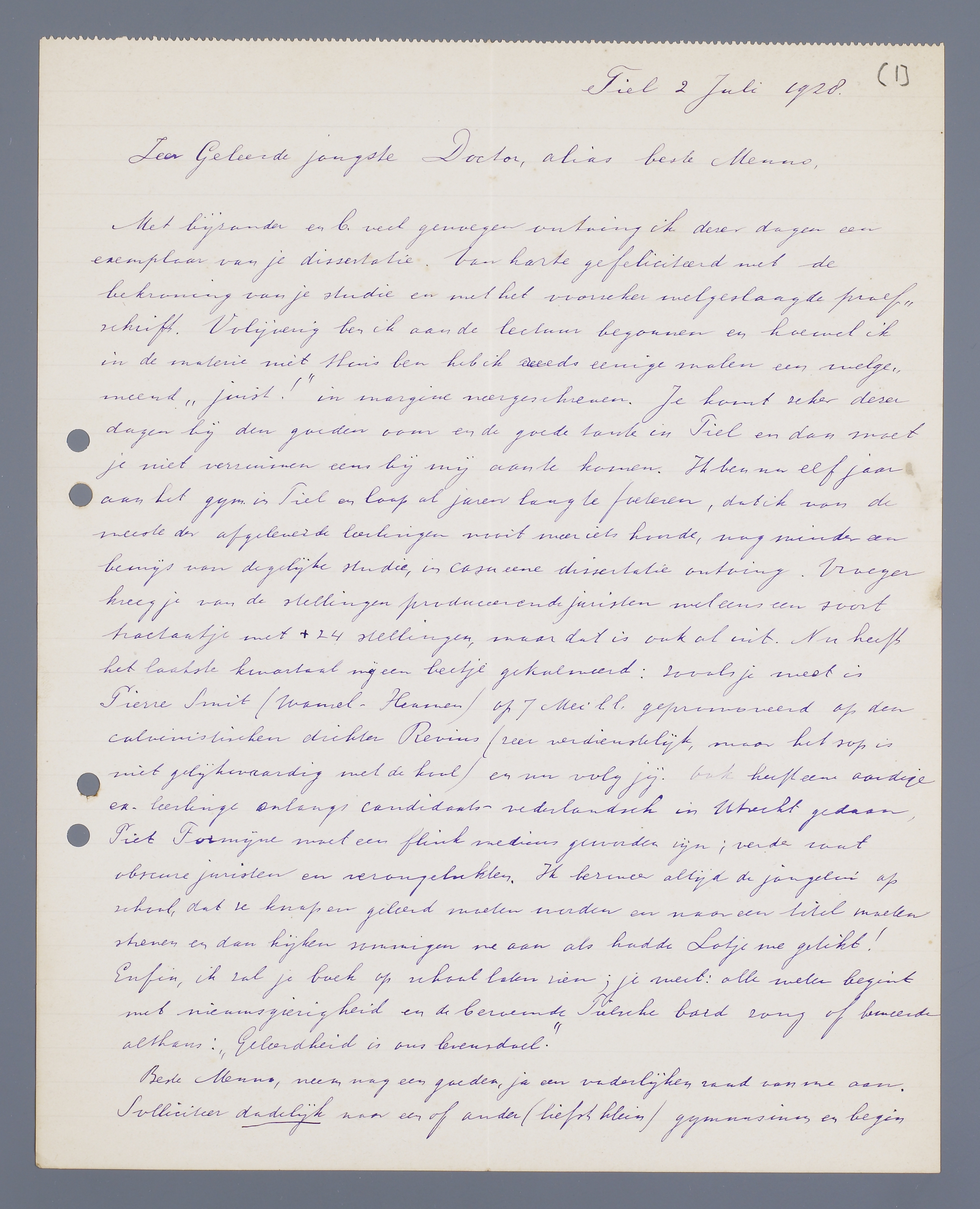 Met bijzonder en b. veel genoegen ontving ik dezer dagen een exemplaar van je dissertatie. Van harte gefeliciteerd met de bekroning van je studie en met het voorzeker welgeslaagde proefschrift. Volijverig ben ik aan de lectuur begonnen en hoewel ik in de materie niet thuis ben heb ik steeds eenige malen een welgemeend ‘juist!’ in margine neergeschreven. Je komt zeker dezer dagen bij den goeden oom en de goede tante in Tiel en dan moet je niet verzuimen eens bij mij aan te komen. Ik ben nu elf jaar aan het gym in Tiel en loop al jaren lang te foeteren, dat ik van de meeste der afgeleverde leerlingen nooit meer iets hoorde, nog minder een bewijs van degelijke studie, in casu eene dissertatie ontving. Vroeger kreeg je van de stellingen produceerende juristen wel eens een soort tractaatje met 24 stellingen, maar dat is ook al uit. Nu heeft het laatste kwartaal mij een beetje gekalmeerd: zooals je weet is Pierre Smit (Wamel - Heumen) op 7 Mei l.l. gepromoveerd op den calvinistischen dichter Revius (zeer verdienstelijk, maar het sop is niet gelijkwaardig met de kool) en nu volg jij. Ook heeft een aardige ex-leerlinge onlangs candidaats-nederlandsch in Utrecht gedaan, Piet Formijne moet een flink medicus geworden zijn; verder wat obscure juristen en verongelukten. Ik bezweer altijd de jongelui op school, dat ze knap en geleerd moeten worden en naar een titel moeten streven en dan kijken sommigen me aan als hadde Lotje me getikt!